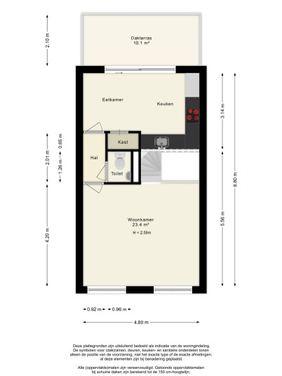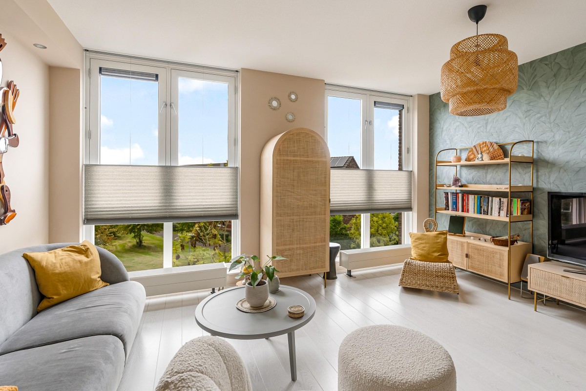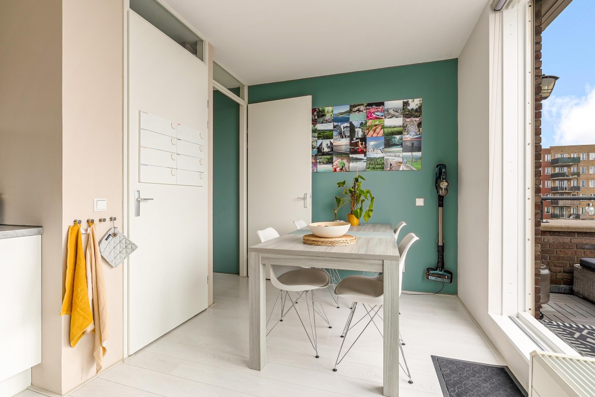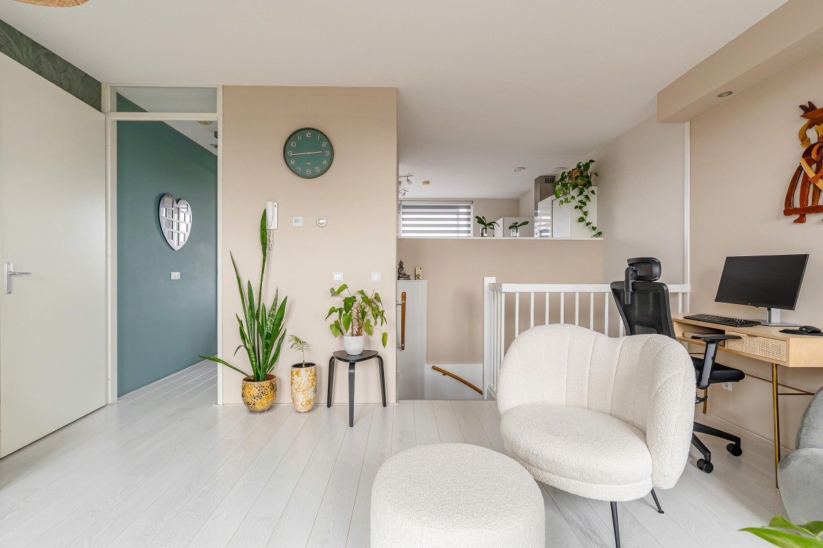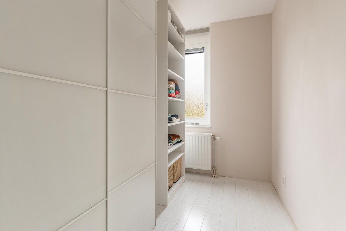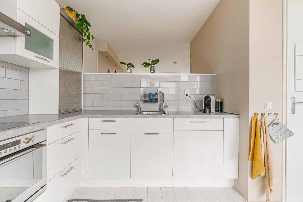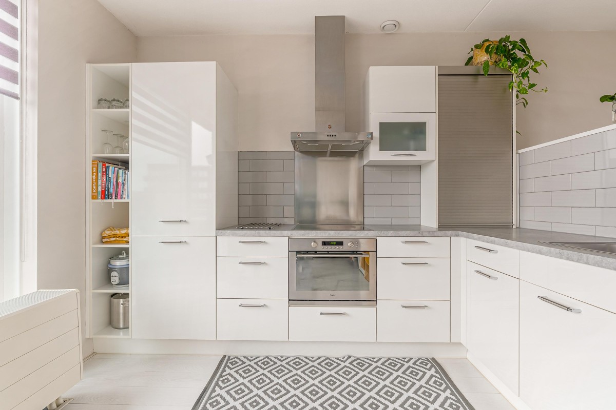 Wanneer u de trap naar de tweede verdieping opkomt, betreedt u de ruime en lichte woonkamer. Dankzij de grote raampartijen geniet u hier van een prettige hoeveelheid daglicht en een open sfeer. Vanuit de woonkamer heeft u toegang tot een hal, die leidt naar het toilet en de keuken. De keuken is modern ingericht en voorzien van diverse inbouwapparatuur, waaronder een afzuigkap, een vaatwasser, een koelkast en een combi-oven. Er is voldoende ruimte voor een eettafel, waardoor u hier gezellig kunt dineren.