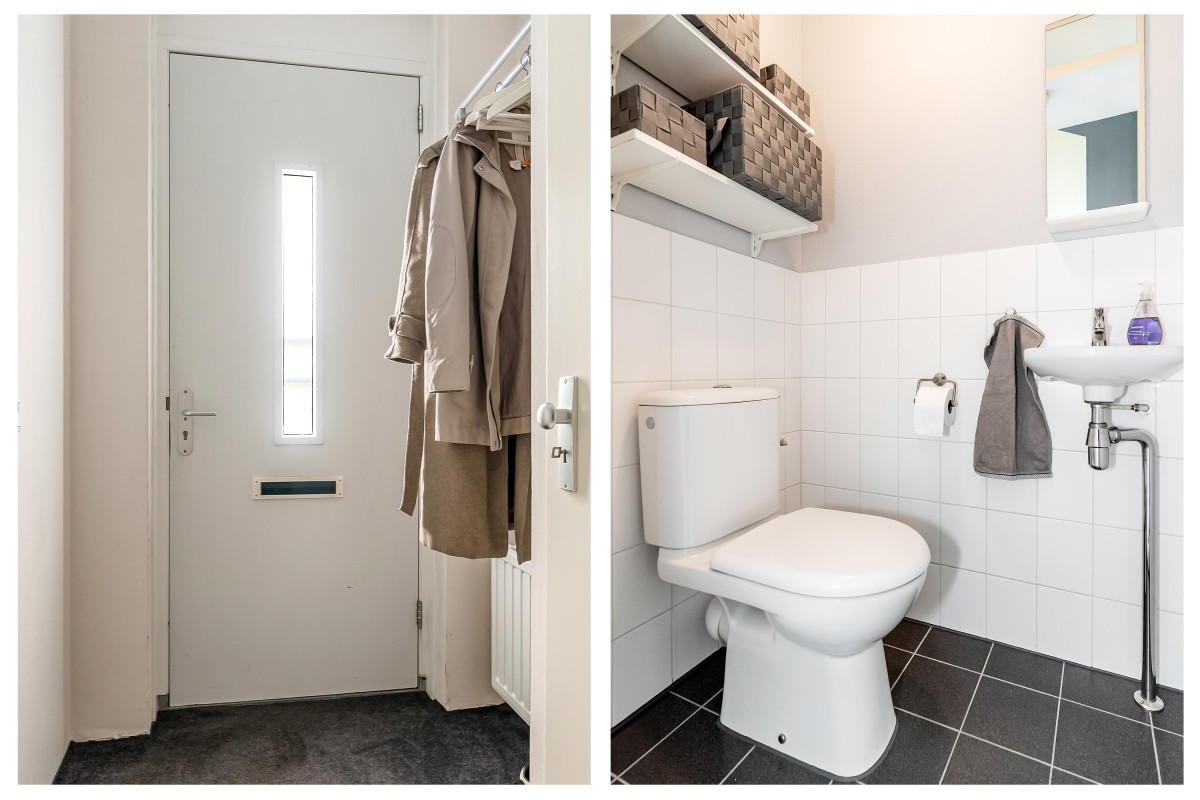 Bij binnenkomst komt u in de ruime entree, waar zich de meterkast bevindt en vanwaar u via de trapopgang de eerste verdieping bereikt.