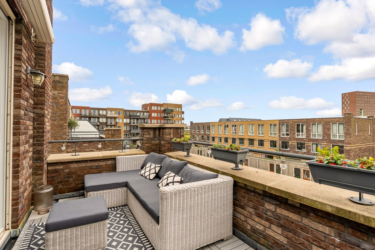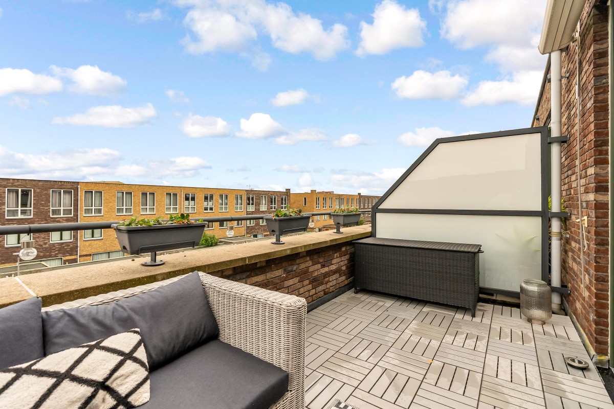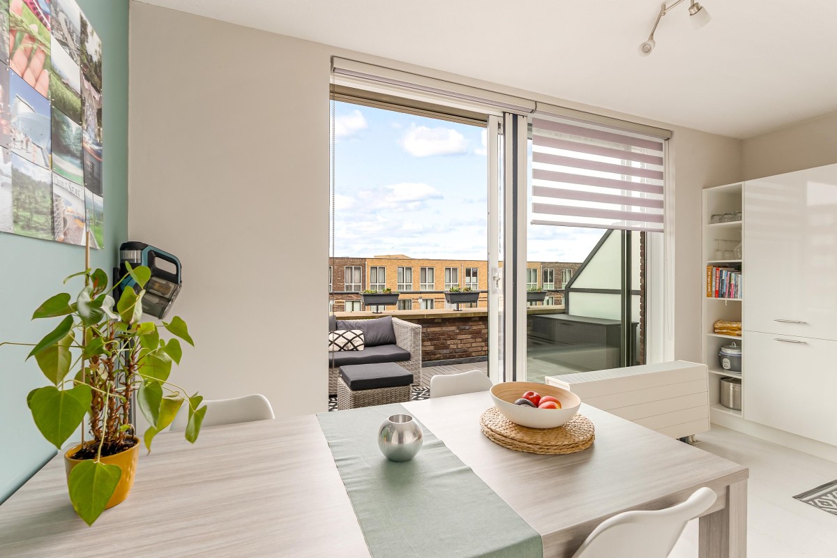 Via een schuifpui in de keuken bereikt u het royale dakterras dat gelegen is op het zuiden, dus veel zonuren. Dit is een heerlijke plek om buiten te ontspannen - of u nu geniet van een kop koffie in de zon of tot rust komt op een comfortabele lounge set.