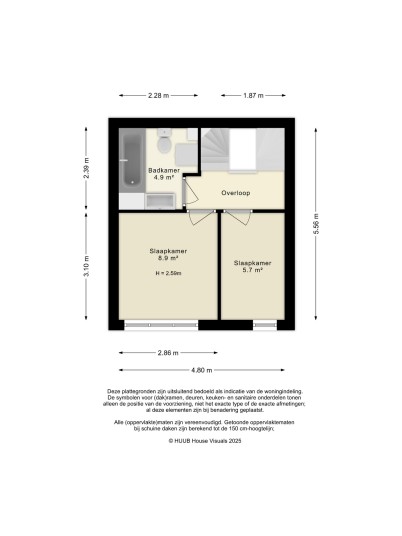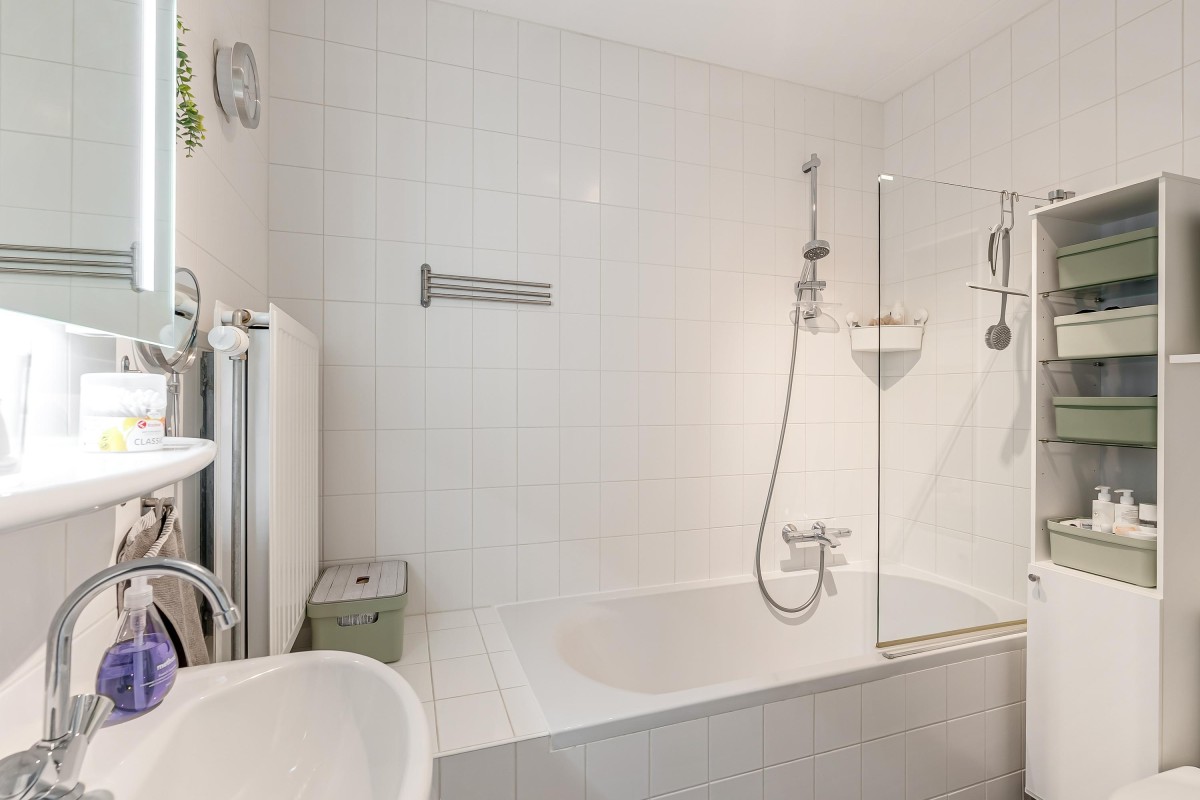 Wanneer u de trap opkomt, bereikt u de overloop die toegang biedt tot de verschillende vertrekken op deze verdieping. Vanuit hier heeft u toegang tot de twee comfortabele slaapkamers en de keurig afgewerkte badkamer. De badkamer is volledig betegeld en voorzien van een ligbad met douchefunctie, een toilet en een wastafel.