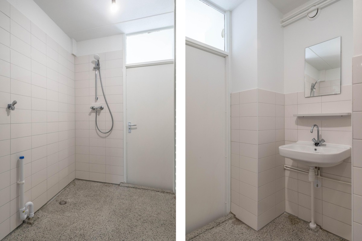 De badkamer is zowel via de keuken als via de hal bereikbaar en is uitgerust met een douche, wastafel en aansluiting voor de wasmachine. Het toilet met fonteintje bevindt zich in een separate ruimte.