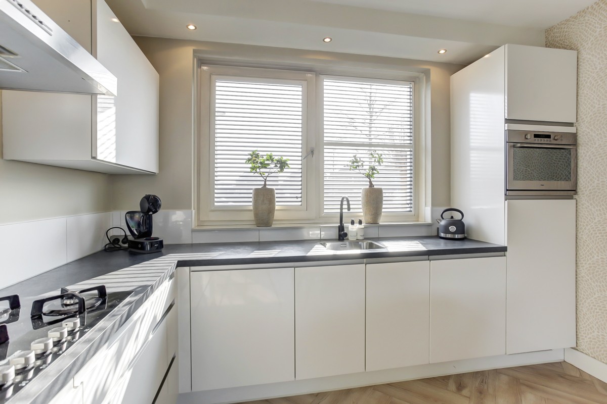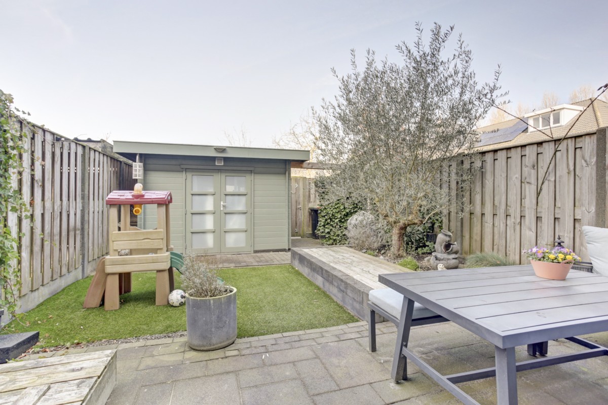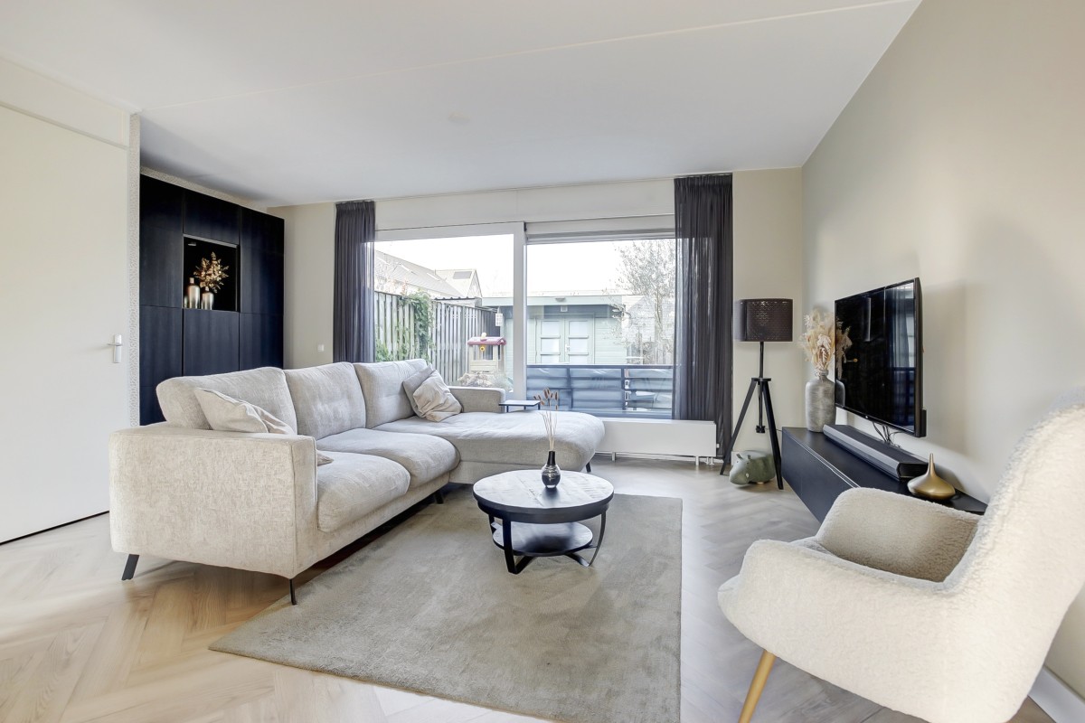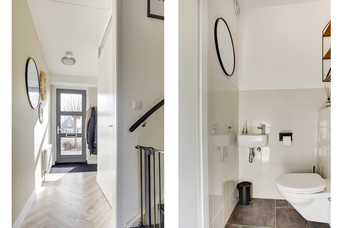 Begane grond: entree, hal met meterkast en garderobe, moderne toiletruimte met hangcloset en fonteintje, glasdeur naar de tuingerichte woonkamer welke voorzien is van een ruime praktische trapkast en een onderhoudsarme laminaat vloer in visgraat motief. Middels een schuifpui is er toegang tot de verzorgde tuin op het westen. De luxe open keuken is straatgericht en geplaatst in een hoekopstelling. De keuken is voorzien van een ingebouwde vaatwasser, 5-pit gas-op-glas kookplaat, RVS-afzuigkap, combimagnetron en koelkast. Middels de schuifpui kom je in de diepe tuin op het zonnige westen. De achtertuin is voorzien van een terras met zonnescherm, een kunstgras gazon, een houten berging en een achterom.