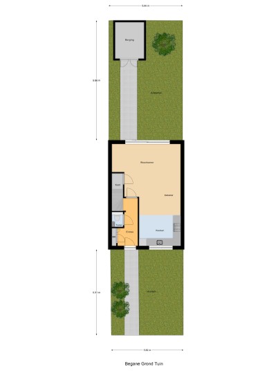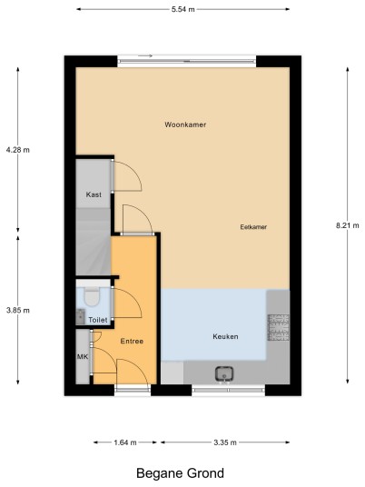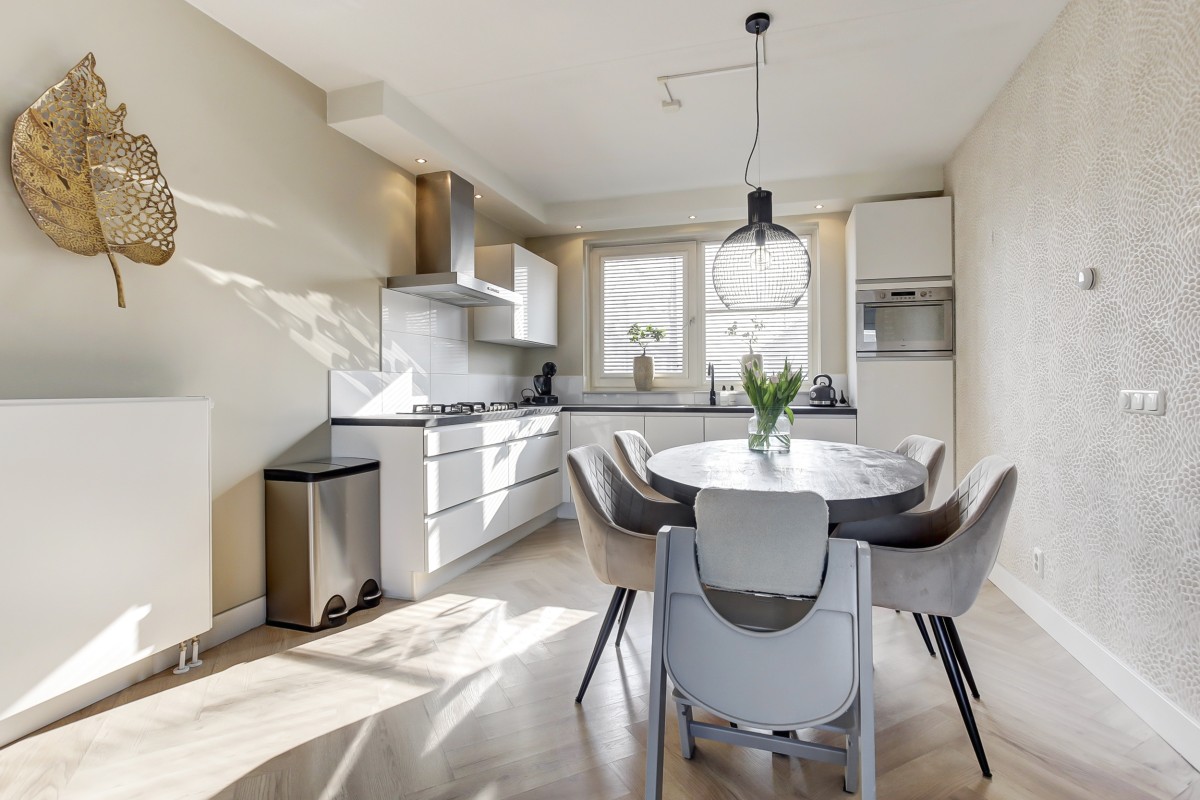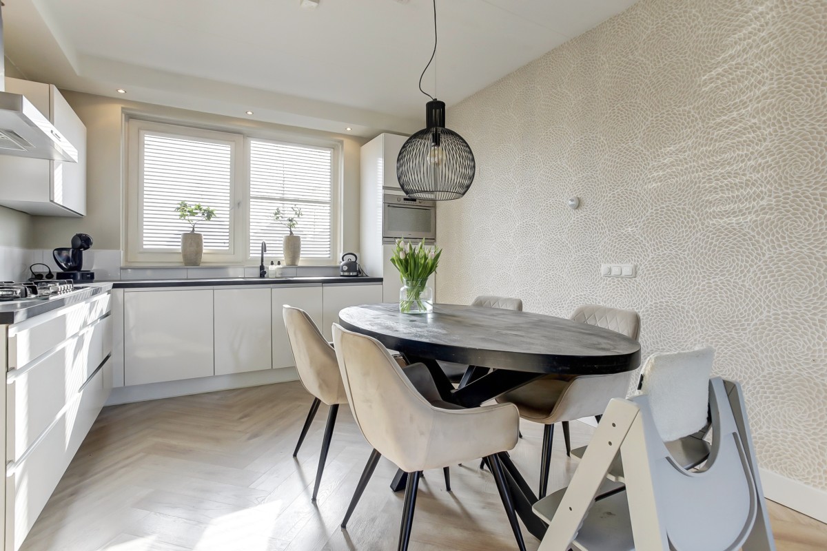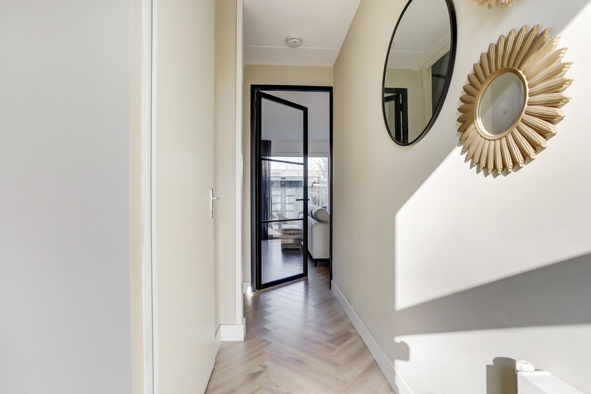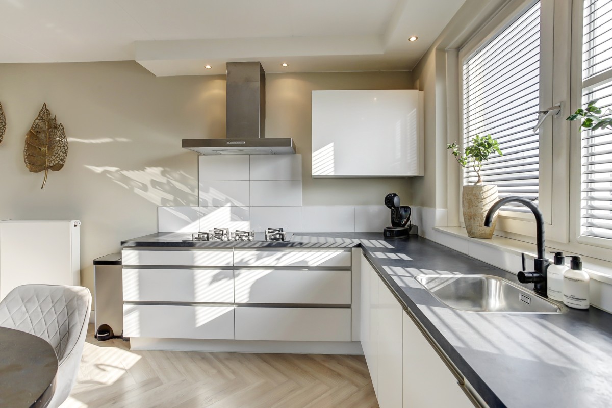 Begane grond: entree, hal met meterkast en garderobe, moderne toiletruimte met hangcloset en fonteintje, glasdeur naar de tuingerichte woonkamer welke voorzien is van een ruime praktische trapkast en een onderhoudsarme laminaat vloer in visgraat motief. Middels een schuifpui is er toegang tot de verzorgde tuin op het westen. De luxe open keuken is straatgericht en geplaatst in een hoekopstelling. De keuken is voorzien van een ingebouwde vaatwasser, 5-pit gas-op-glas kookplaat, RVS-afzuigkap, combimagnetron en koelkast. Middels de schuifpui kom je in de diepe tuin op het zonnige westen. De achtertuin is voorzien van een terras met zonnescherm, een kunstgras gazon, een houten berging en een achterom.