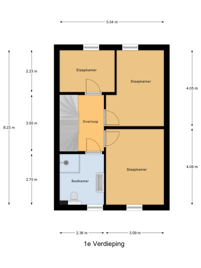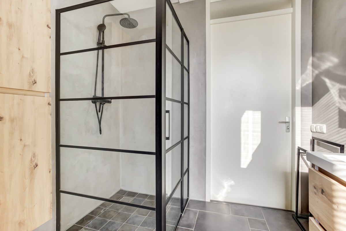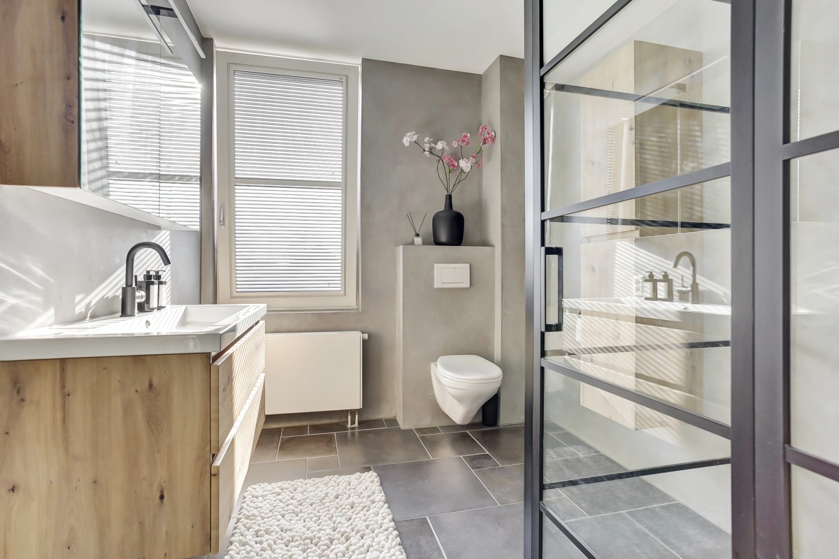 Eerste verdieping: overloop met aansluitend 3 mooie slaapkamers en een moderne badkamer (2022) voorzien van een moderne beton-ciré afwerking, een nette douchecabine, 2e hangcloset, een radiator en een dubbele wastafel met meubel. De slaapkamers en overloop op de eerste verdieping zijn voorzien van een laminaatvloer.