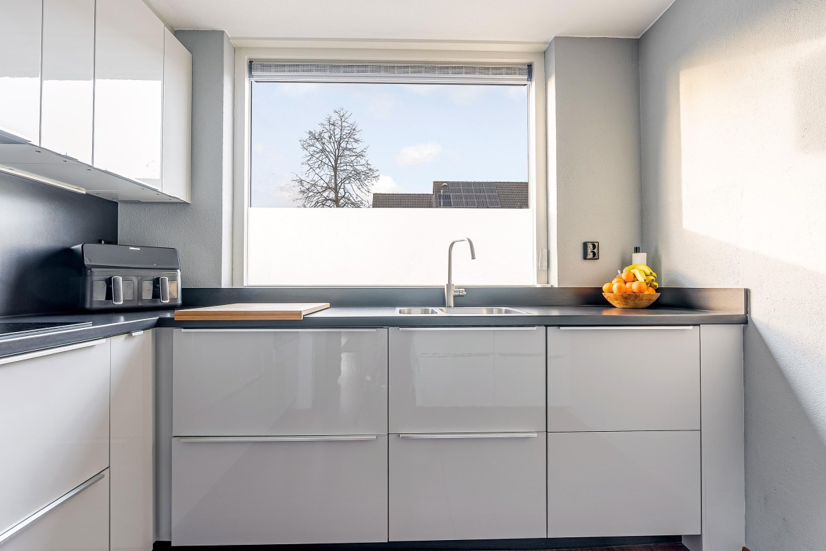 van een inductiekookplaat, combi-oven, oven, vaatwasser en afzuigkap. Aan het werk-schier-eiland met bar, kan je gezellig de dag doornemen terwijl de ander staat te koken.