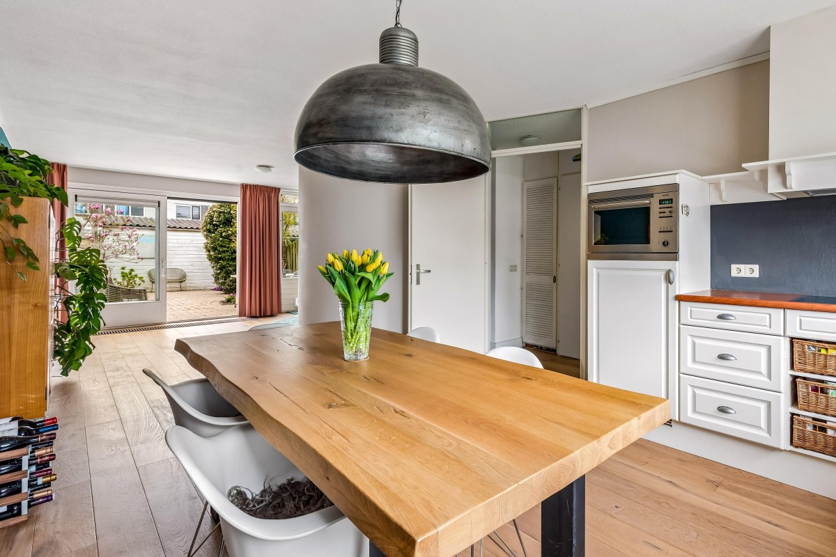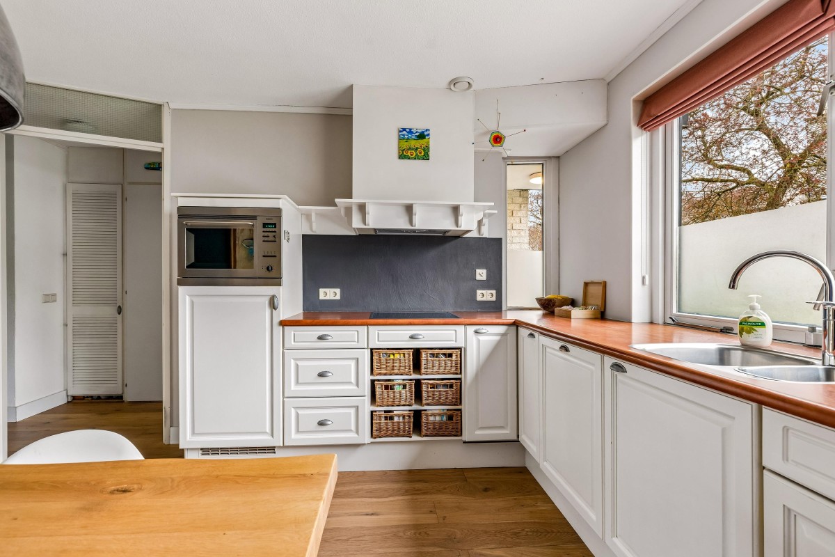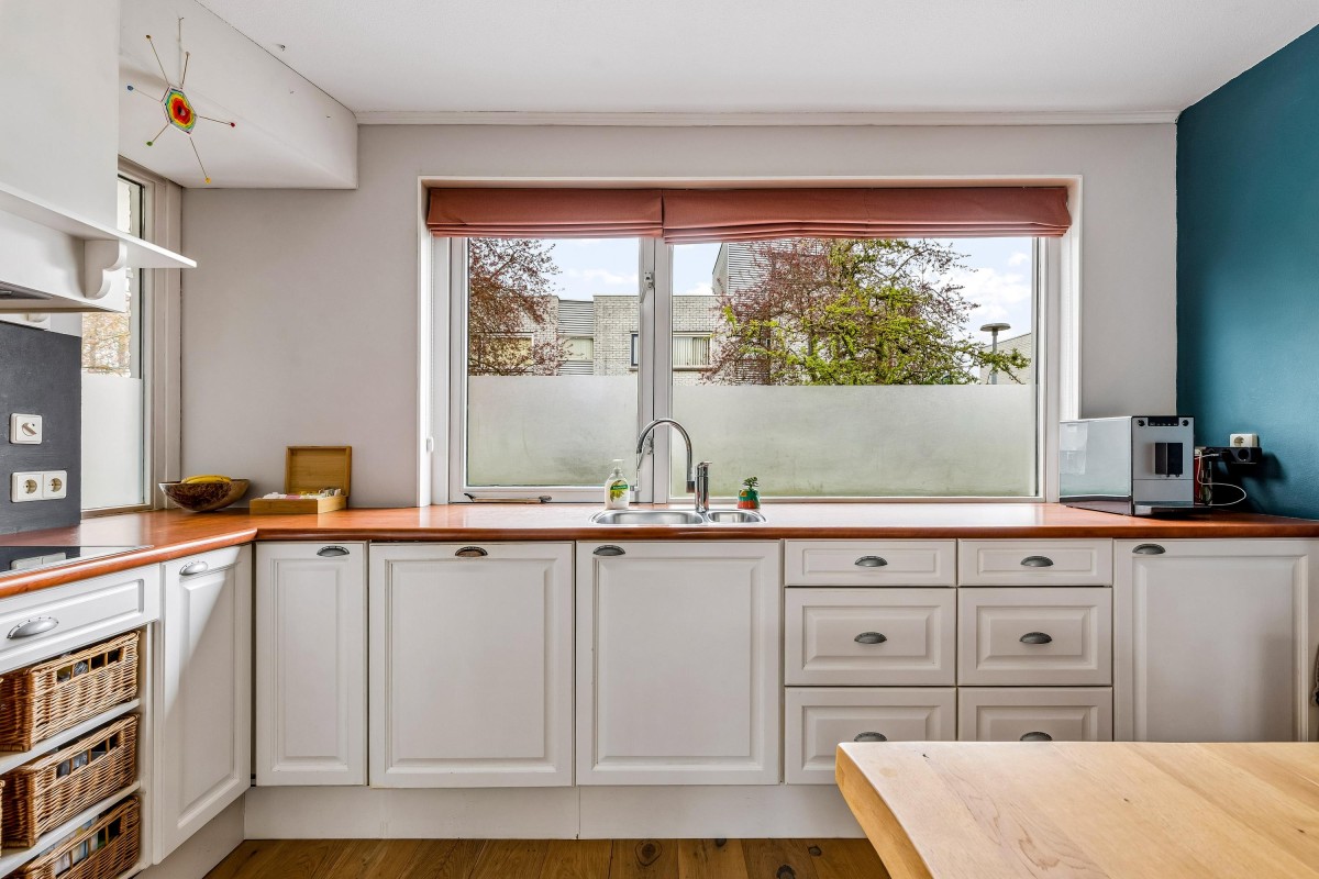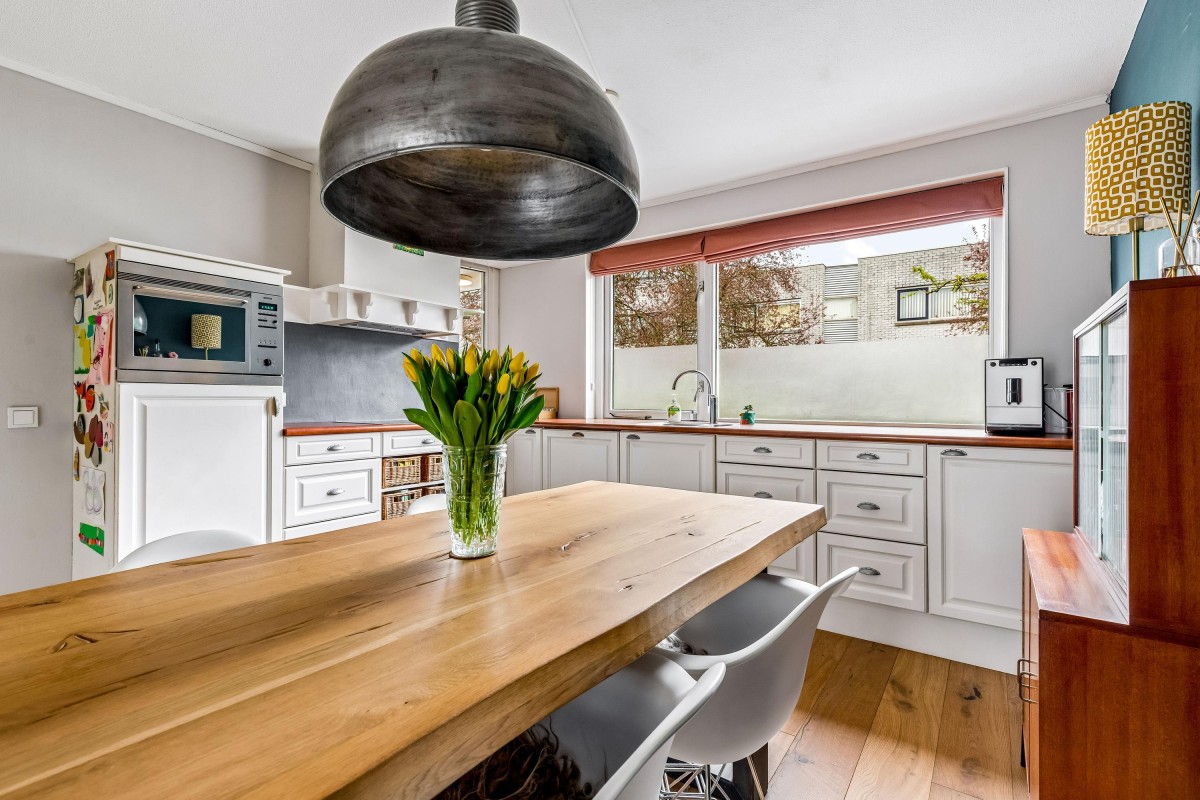 De open keuken aan de voorzijde kijkt uit op het groene hofje en is uitgevoerd in lichte tinten in een hoekopstelling. De keuken is voorzien van diverse inbouwapparatuur, waaronder een inductiekookplaat, afzuigkap, vaatwasser, koelkast, vriezer en combi oven, en beschikt over voldoende opbergruimte.