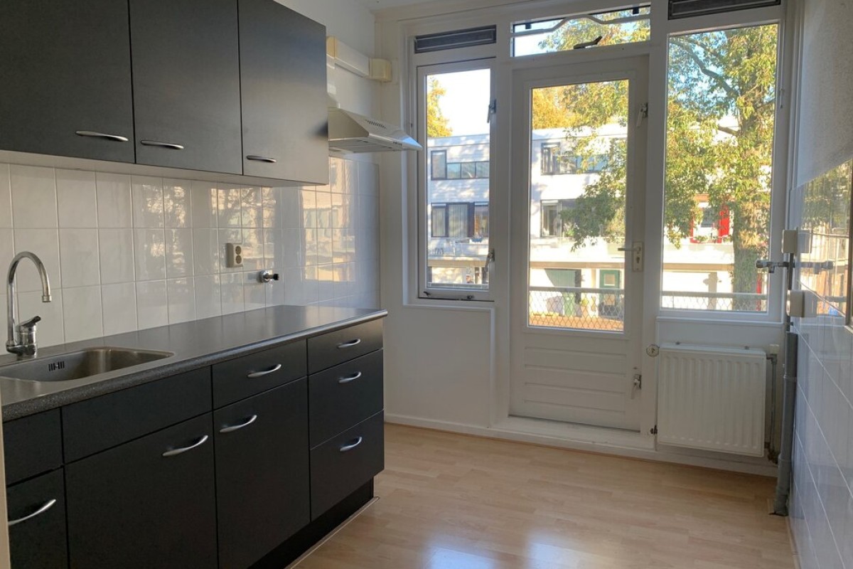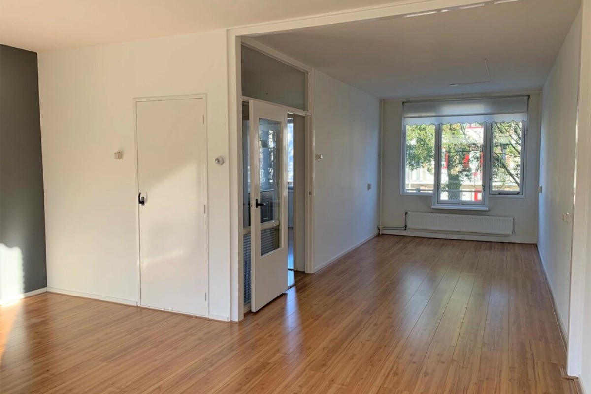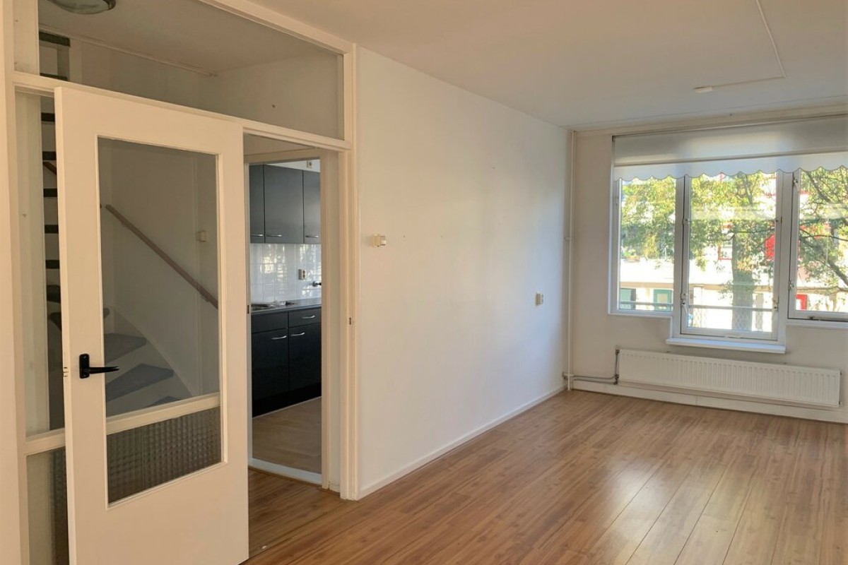 Overloop met toegang tot de woonkamer en keuken. De royale woonkamer beschikt over voldoende ruimte voor een grote eetkamertafel. De grote raampartijen zorgen voor veel lichtinval en hebben een vrij uitzicht over een groenstrook of de achtertuin. De keuken is voorzien van een nette keukeninrichting. Vanuit de keuken is er toegang tot een balkon over de volle breedte van het woonhuis.