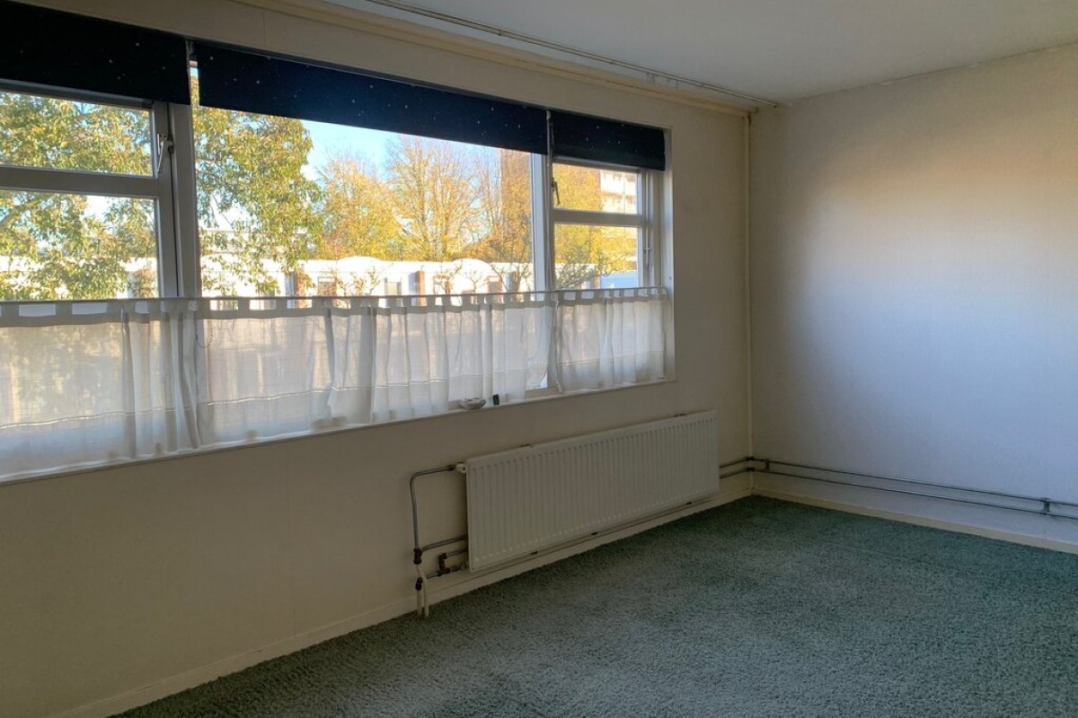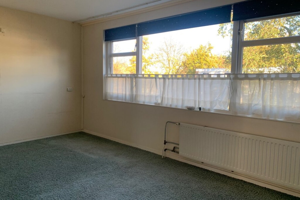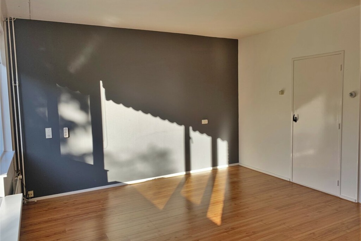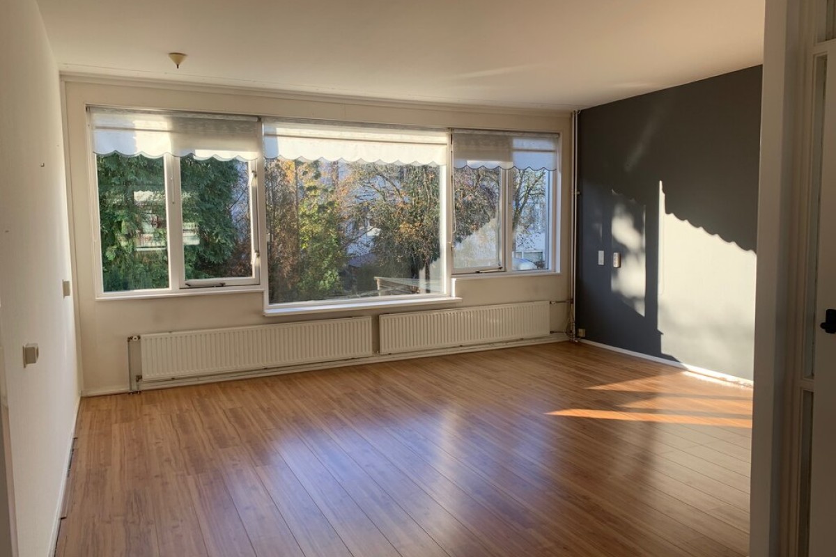 Overloop met toegang tot de woonkamer en keuken. De royale woonkamer beschikt over voldoende ruimte voor een grote eetkamertafel. De grote raampartijen zorgen voor veel lichtinval en hebben een vrij uitzicht over een groenstrook of de achtertuin. De keuken is voorzien van een nette keukeninrichting. Vanuit de keuken is er toegang tot een balkon over de volle breedte van het woonhuis.