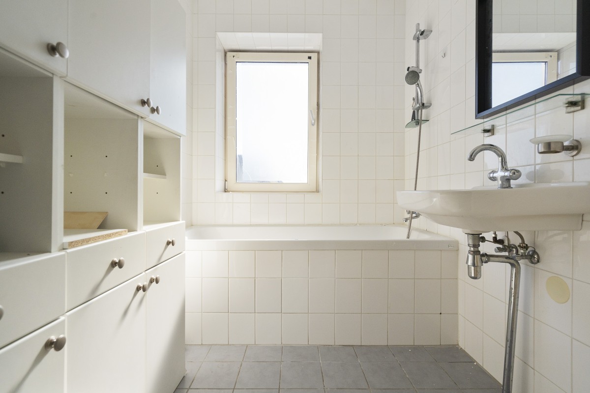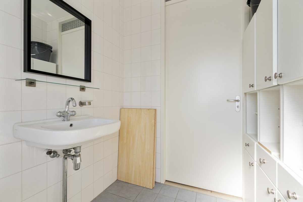 De badkamer is voorzien van een bad en wastafel. Daarnaast is er een separaat toilet met fonteintje. Er is een lekkage geweest bij de badkamer. Deze wordt hersteld door de verkopers. In de berging naast de keuken is een aansluiting voor een wasmachine. De lichte woonkamer met grote ramen biedt een prettige leefruimte en staat half open in verbinding met de keuken. De keuken is in een oudere staat. Het is mogelijk om de keuken bij de woonkamer te betrekken.