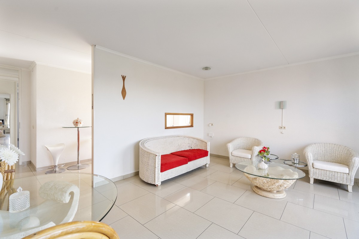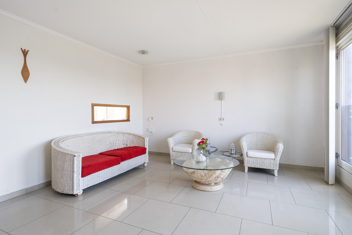 The bathroom is equipped with a bath and washbasin. Additionally, there is a separate toilet with a small hand basin. There has been a leak in the bathroom. This will be repaired by the sellers. There is a connection for a washing machine in the storage room next to the kitchen. The bright living room with large windows offers a pleasant living space and is semi-open to the kitchen. The kitchen is in an older condition. It is possible to integrate the kitchen with the living room.