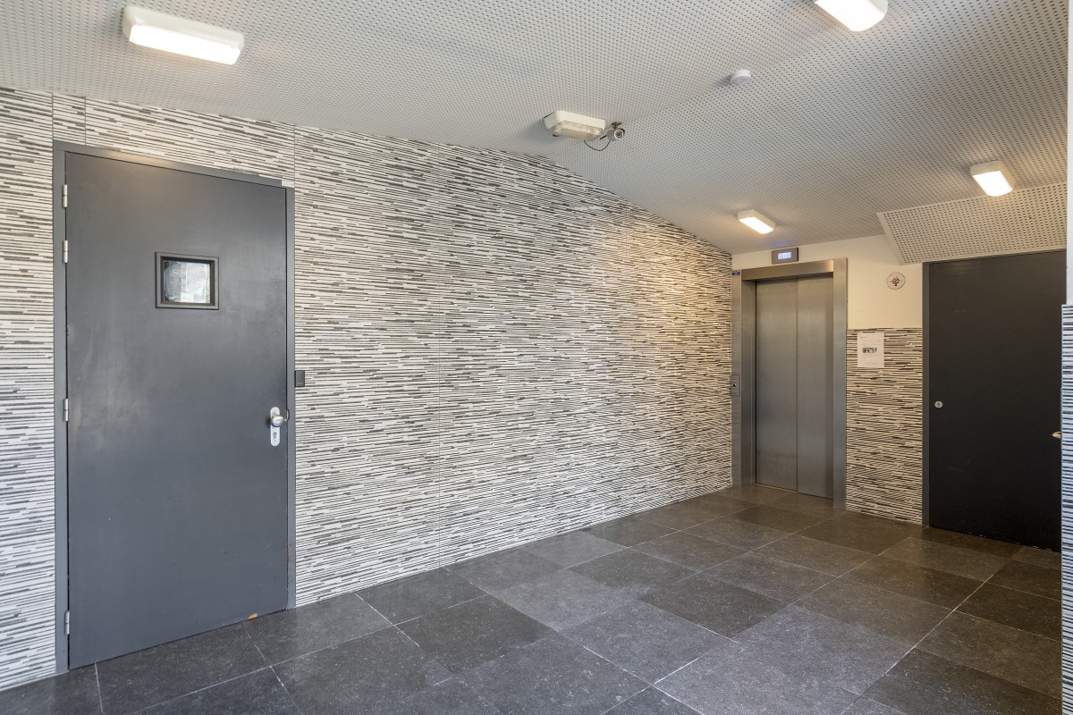 Centrale entree met bellentableau, brievenbussen en toegang tot het trappenhuis en de lift.