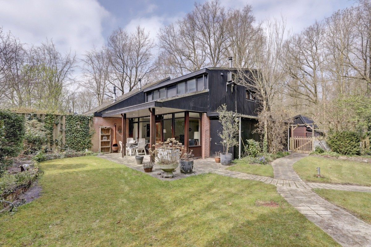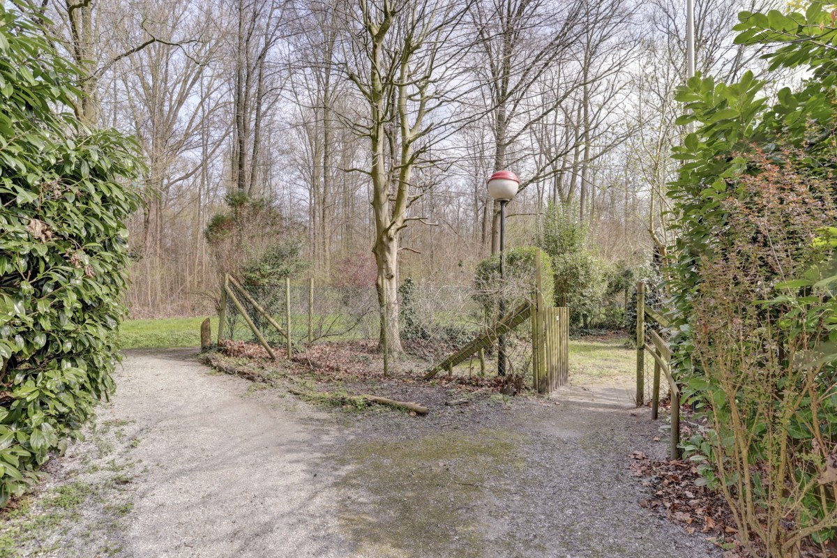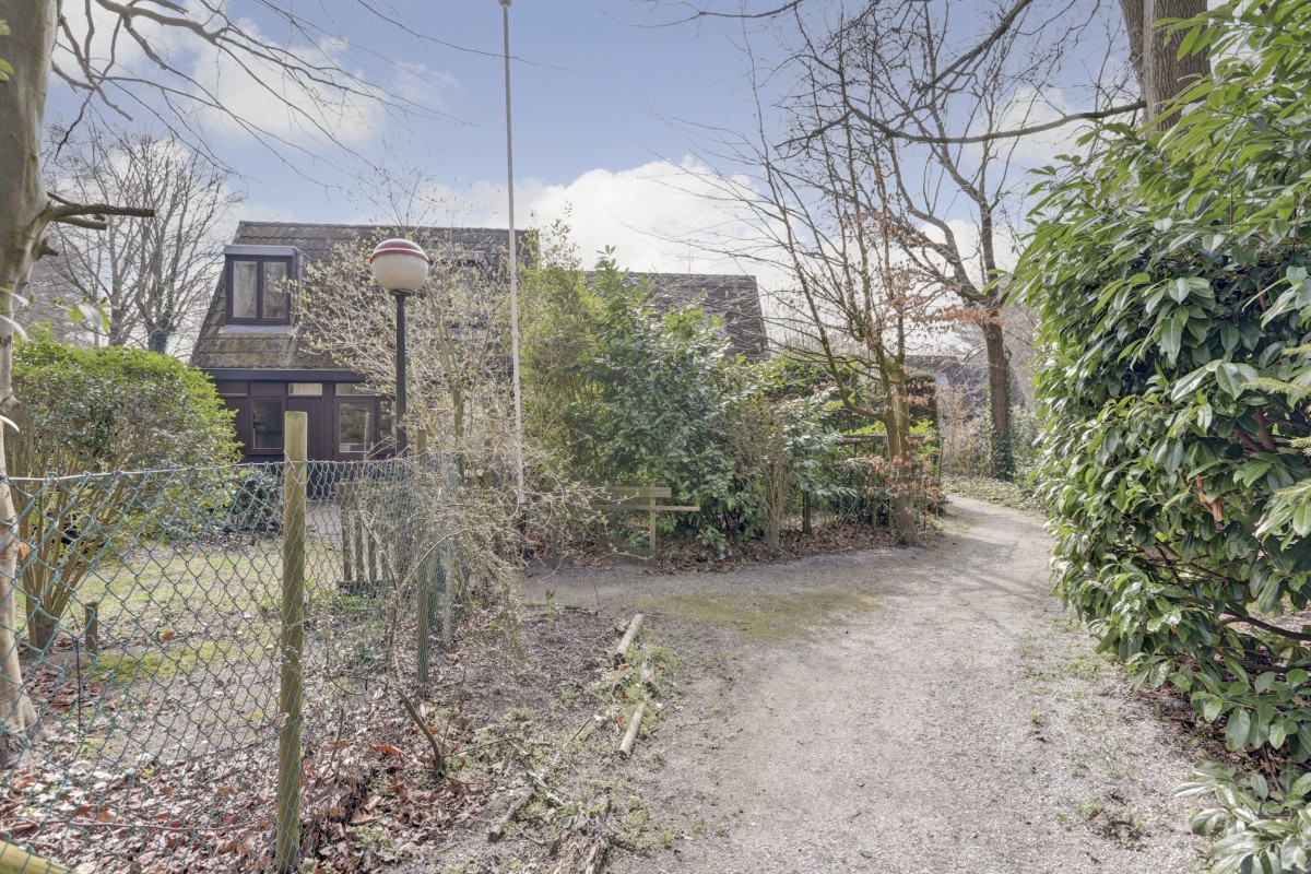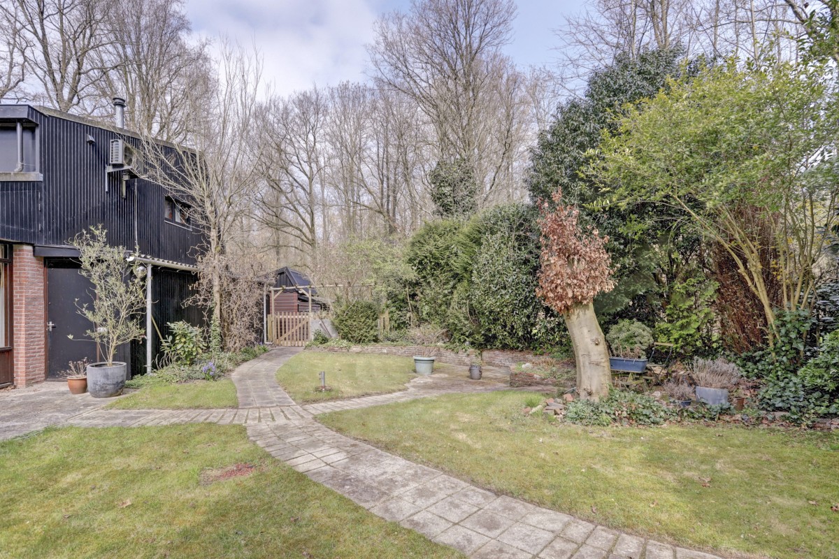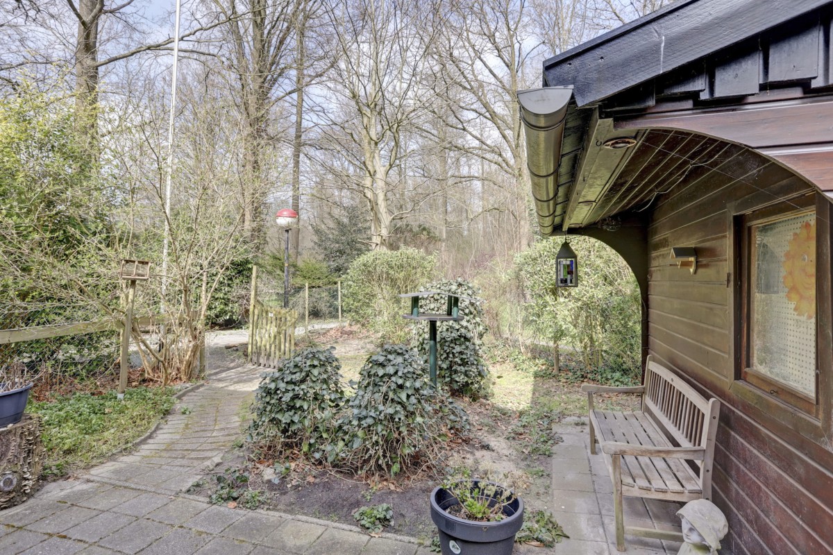 Zowel aan de voorzijde van de woning alsmede aan de achterzijde van de woning biedt een loopdeur toegang naar het perceel. De voortuin is als bostuin aangelegd met een toegangshek vanuit het wandelpad van en naar het het bos. Tevens is hier een vrijstaande houten kapschuur aanwezig. Langs de woning is de zij- en achtertuin bereikbaar welke vriendelijk aangelegd is met een gazon, perkjes en een heus bos aangrenzend. Het zonneterras tegen de achtergevel is overdekt met een riante overkapping. Aan de achterzijde is ook vanuit de tuin een aangebouwde berging bereikbaar.