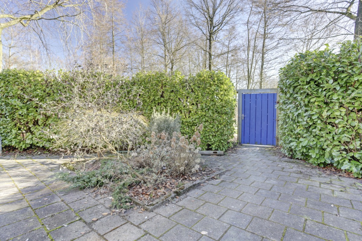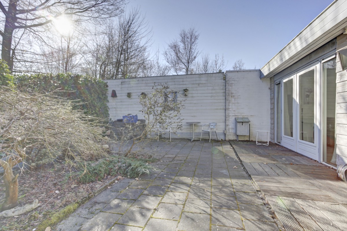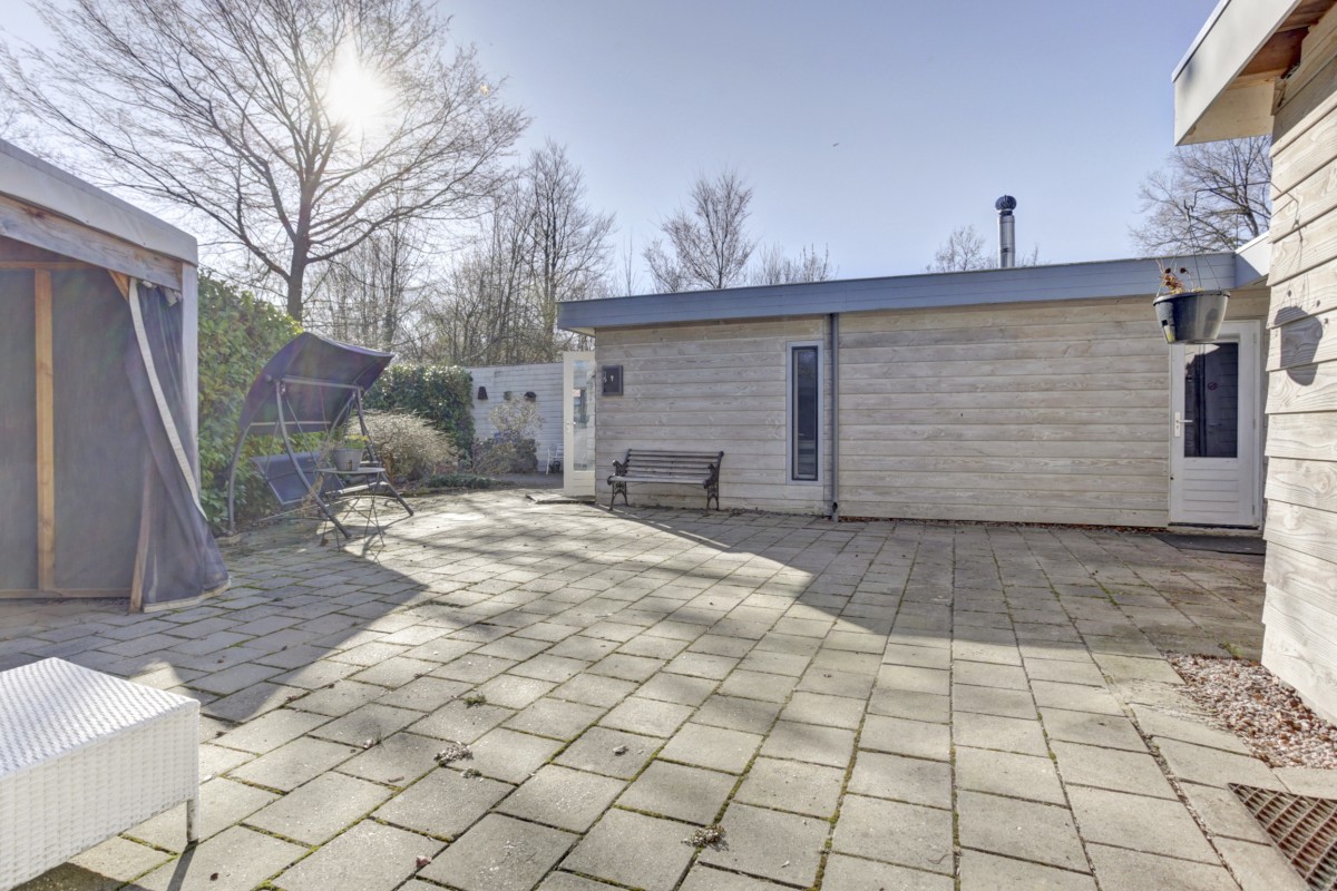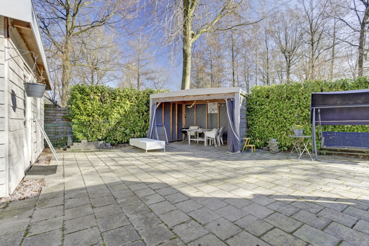 De verzorgde tuin biedt alle privacy en heeft een ruim terras, vaste beplanting, en een grote vrijstaande overkapping.