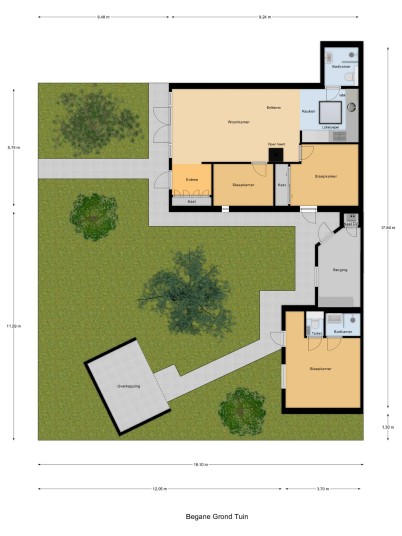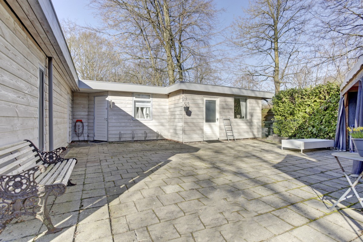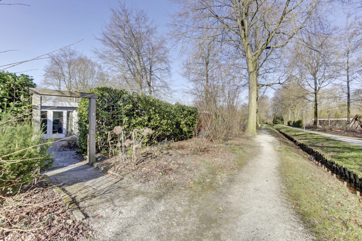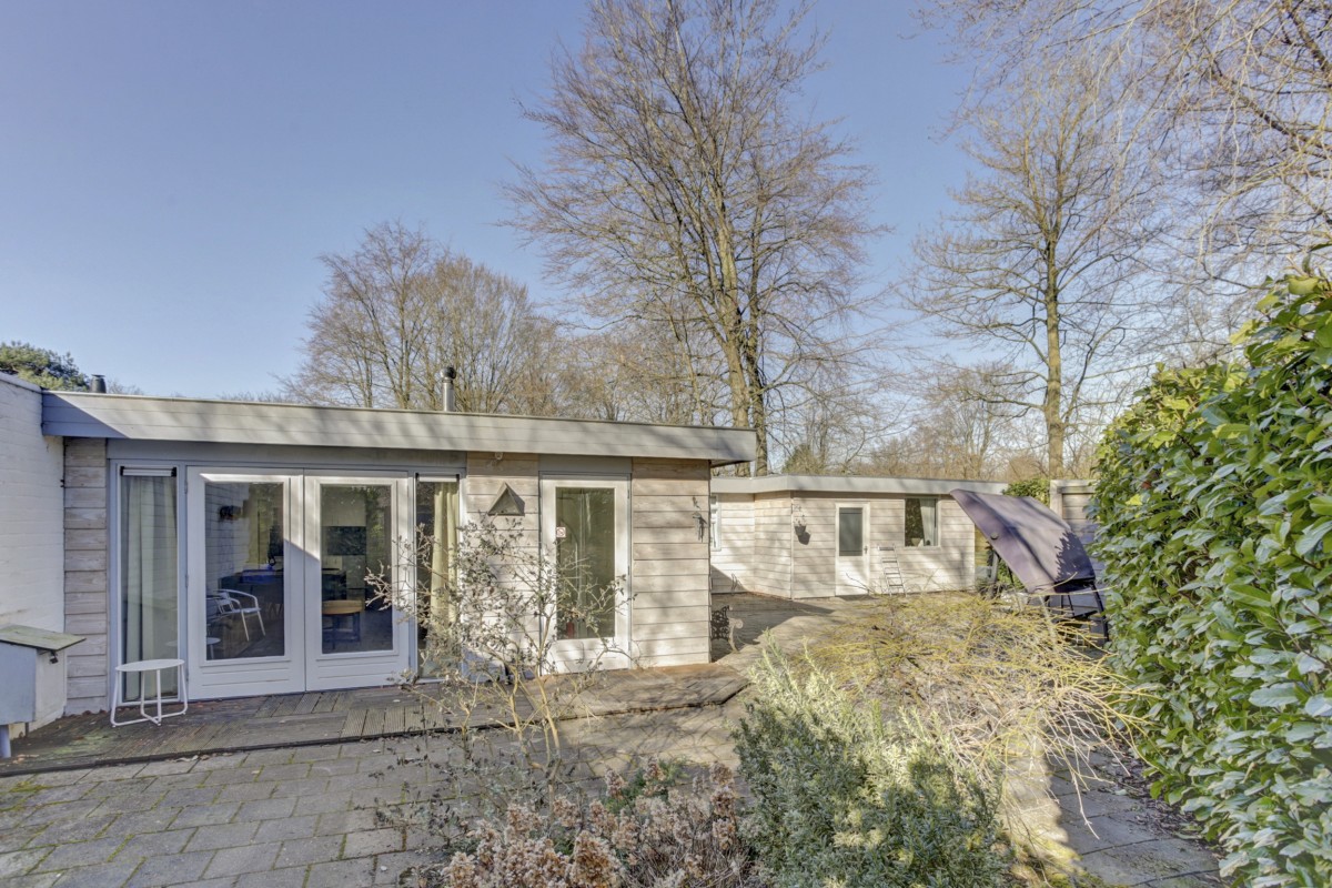 De verzorgde tuin biedt alle privacy en heeft een ruim terras, vaste beplanting, en een grote vrijstaande overkapping.