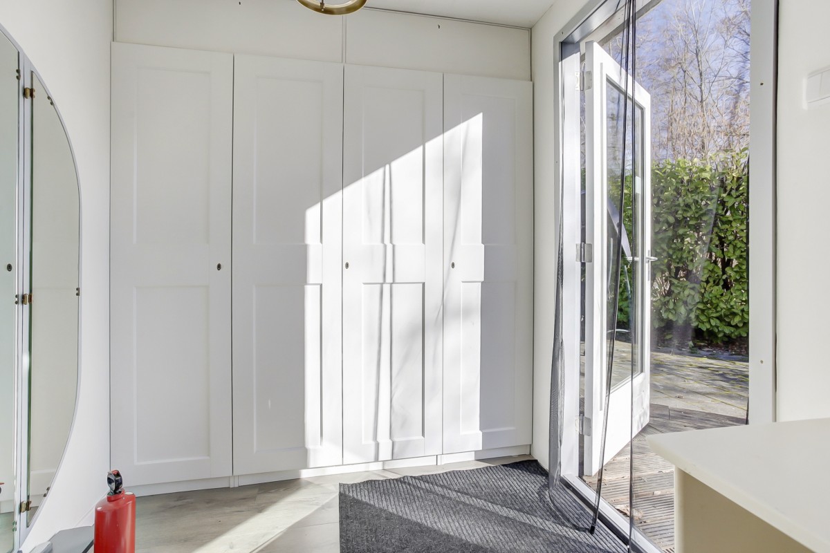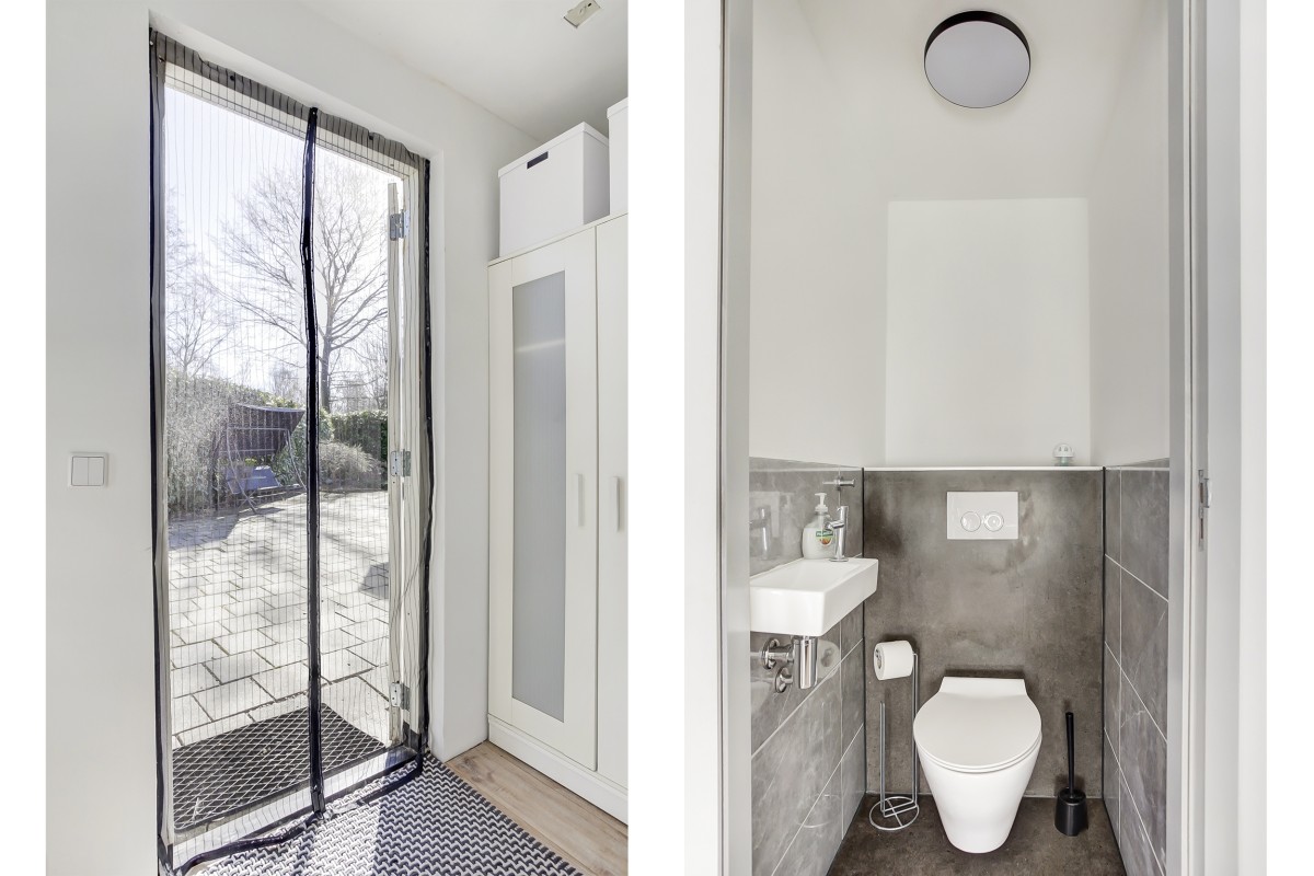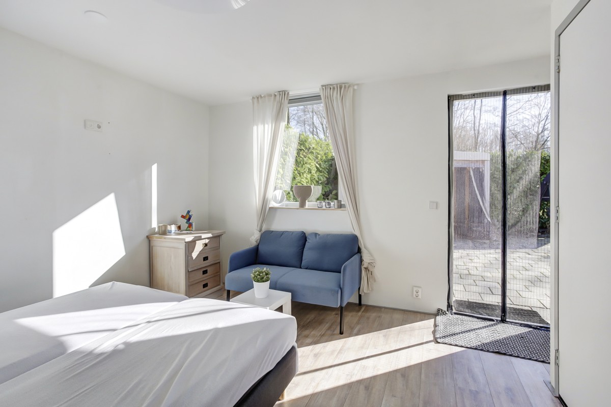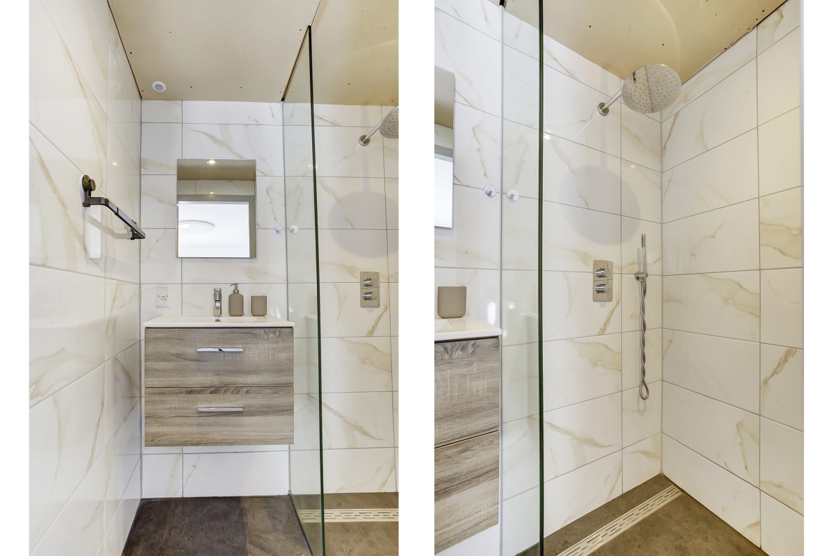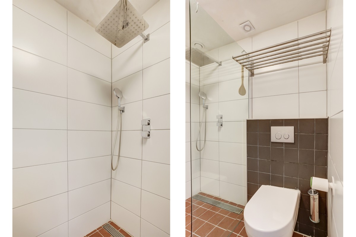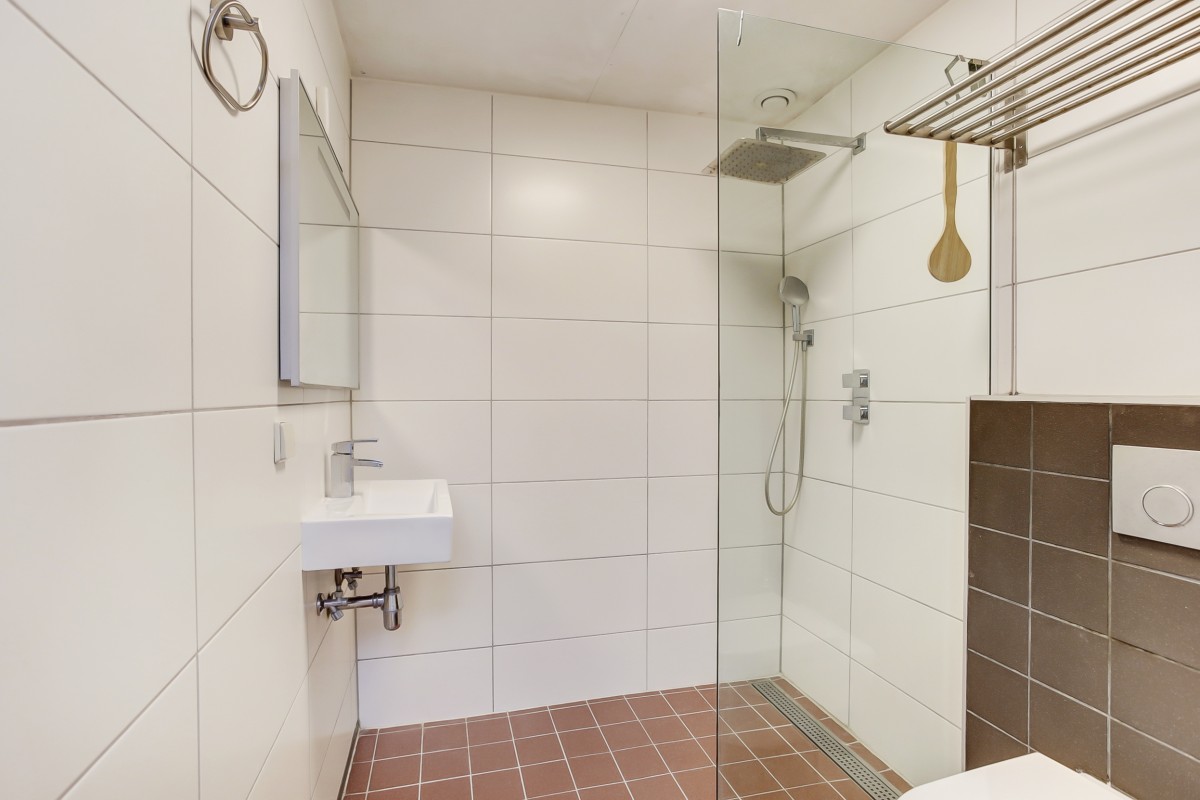 De moderne badkamer biedt een ruime inloopdouche met glazen scherm, wastafel, vloerverwarming en hangcloset. Aangrenzend aan de woonkamer zijn twee ruime slaapkamers bereikbaar. Aangebouwde woonruimte met slaapkamer en extra doucheruimte en toiletruimte.