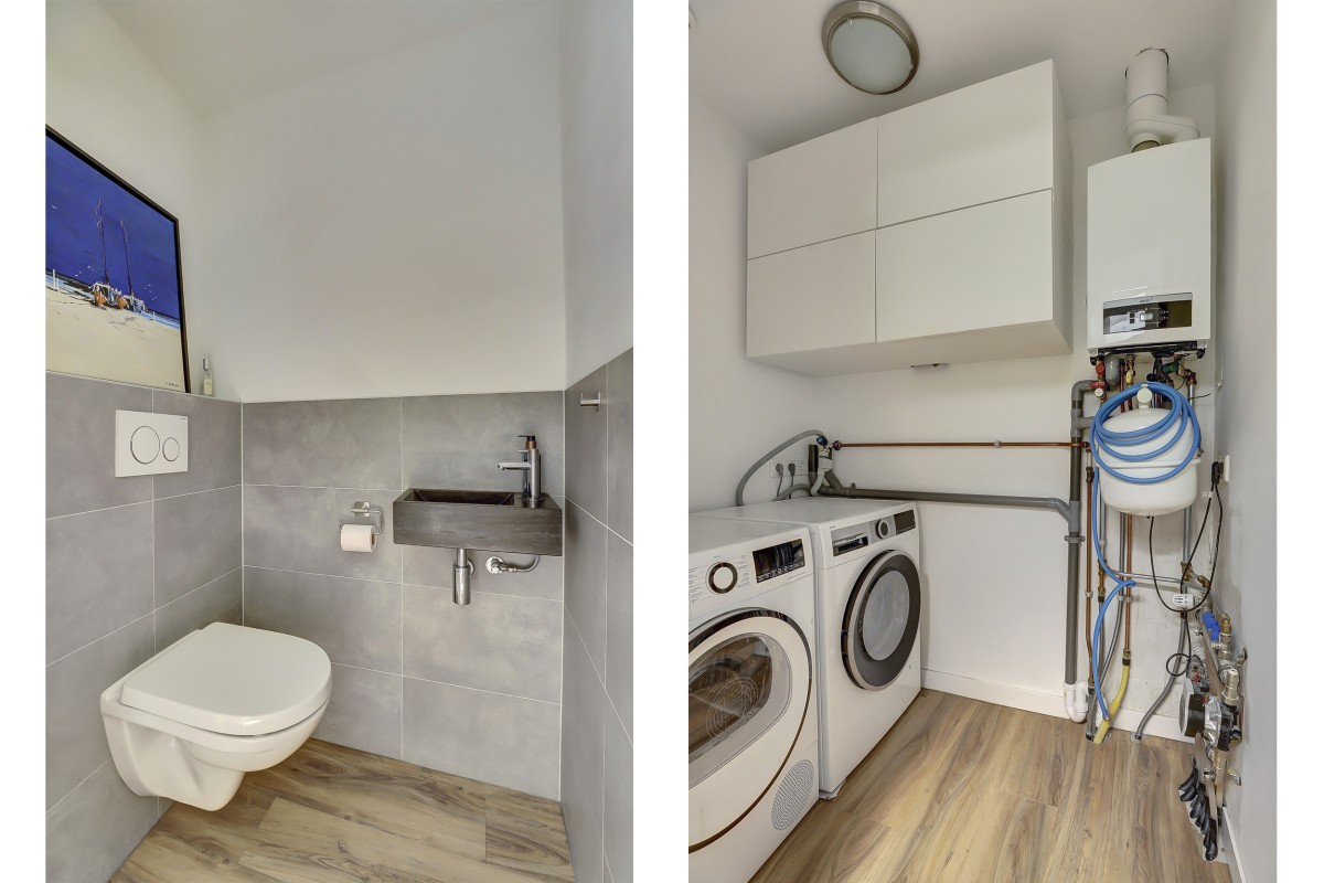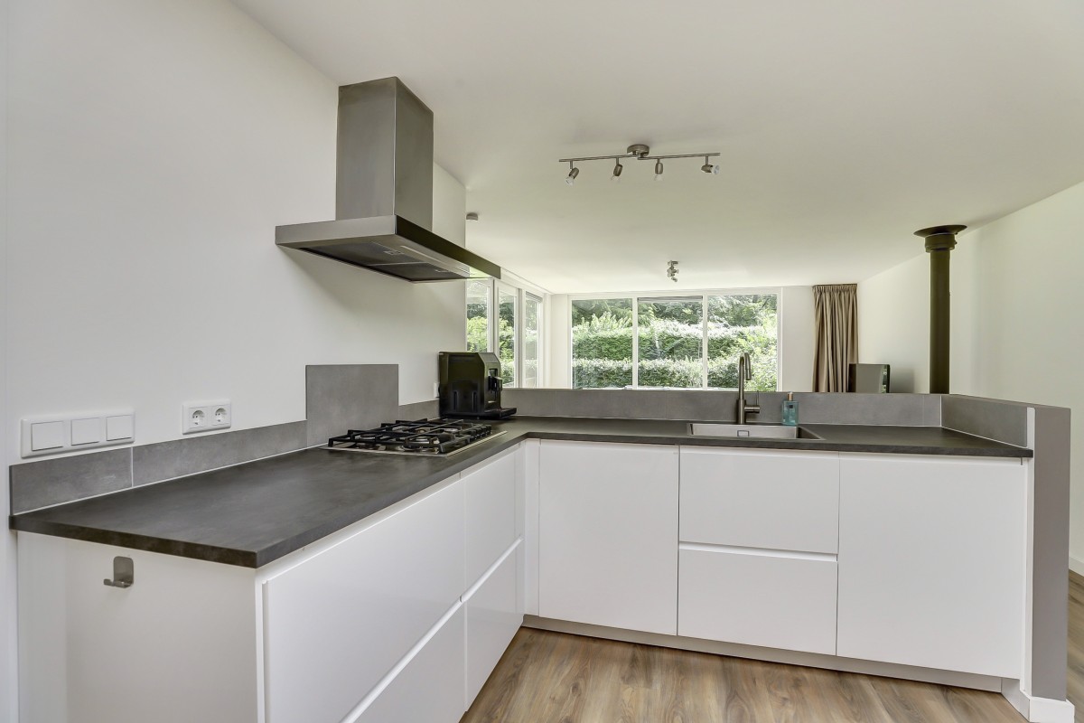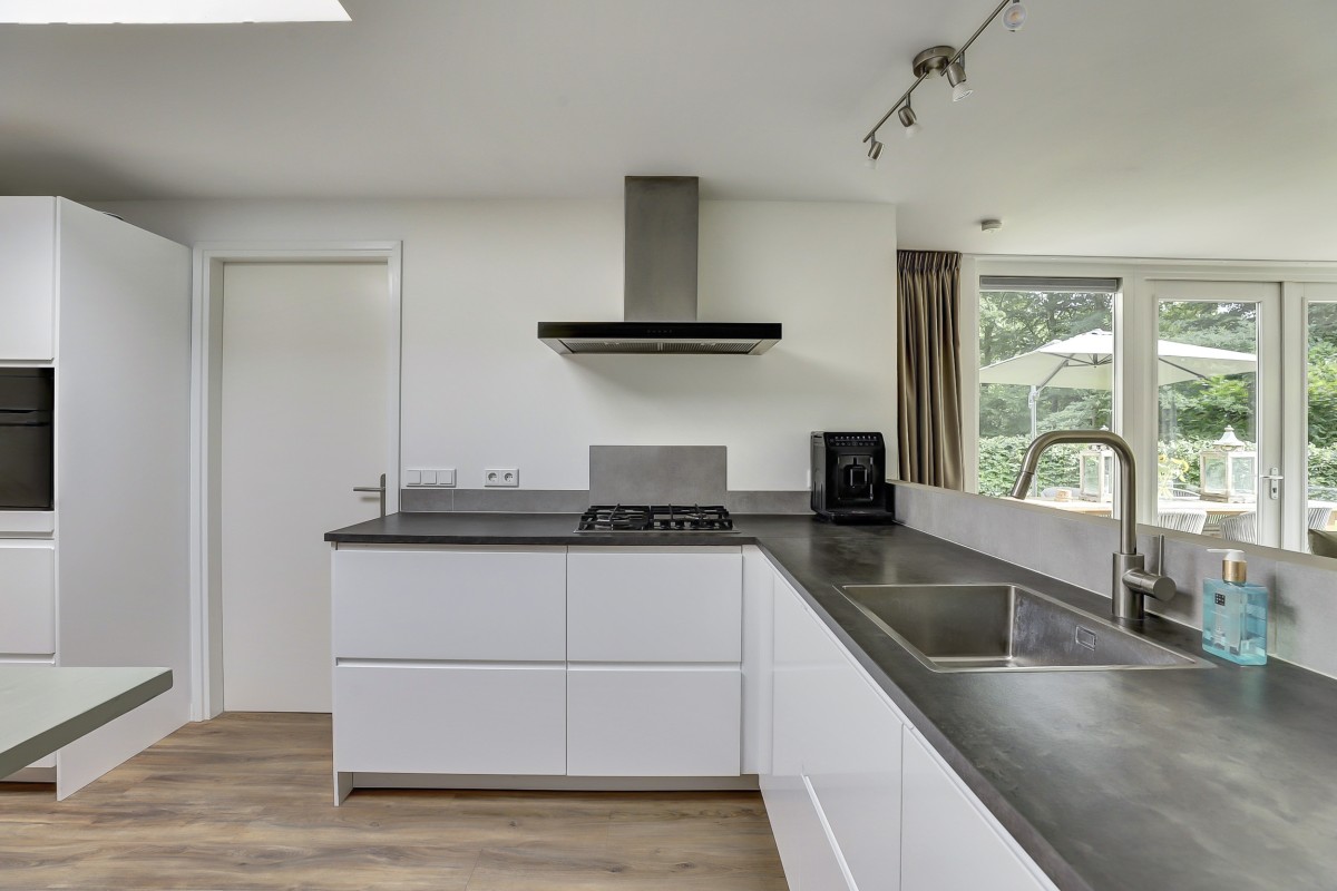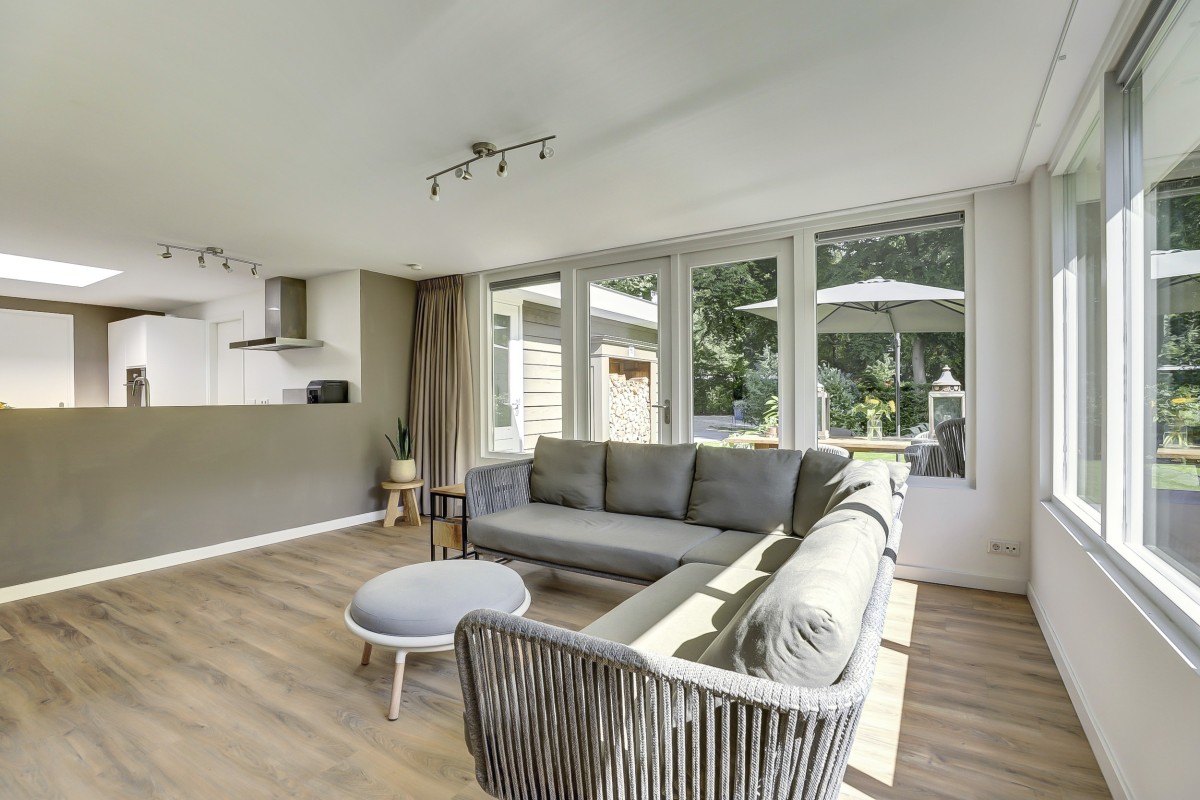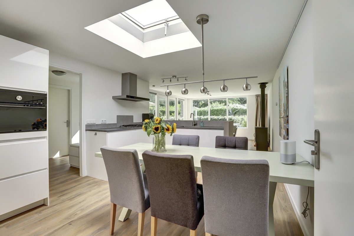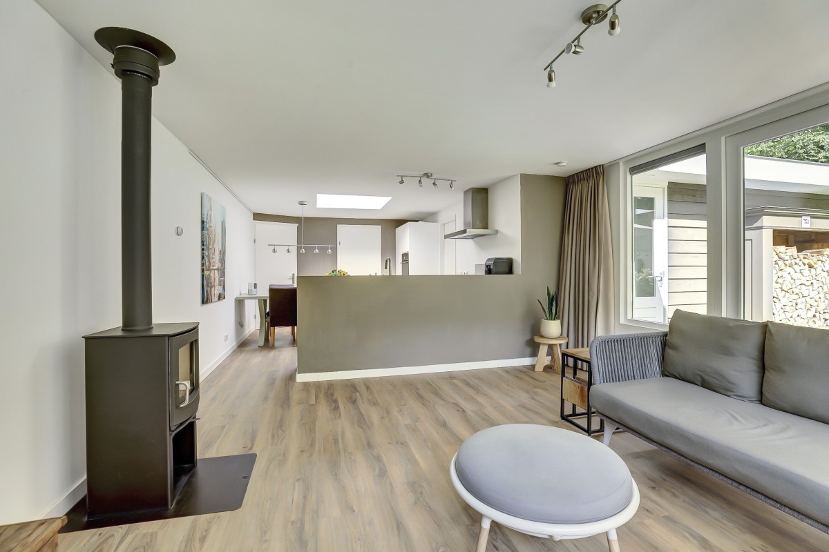 Overdekte entree, ontvangsthal met garderobe, toilet met hangcloset en fonteintje, drie slaapkamers en de moderne badkamer alsmede de doorgang naar de lichte uitgebouwde woonkamer welke beschikt over een design houtkachel en prachtig uitzicht op de tuin. De woonkamer beschikt tevens over een grote dakkoepel en openslaande deuren naar het fraai aangelegde terras. Aangrenzend is de luxe open keuken welke in een hoek is opgesteld en is ruim van opzet. De keuken is voorzien van moderne witte fronten, beschikt over veel praktische opbergruimte en heeft een ingebouwde koel/-vriescombinatie, combi-oven, vaatwasser, 4-pits gaskookplaat en rvs afzuigkap. Achter de keuken is de bijkeuken gelegen met de aansluitingen voor de wasapparatuur alsmede de opstelplaats van de c.v.-ketel (Nefit 2021).