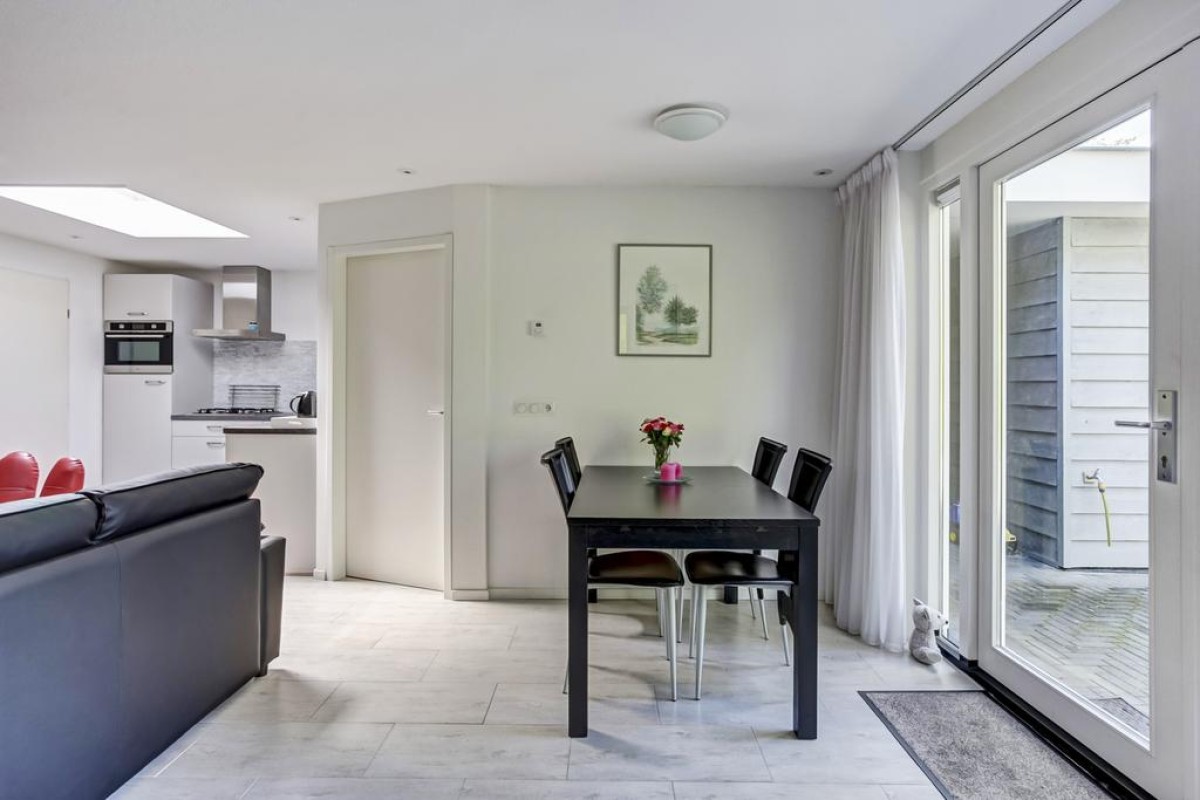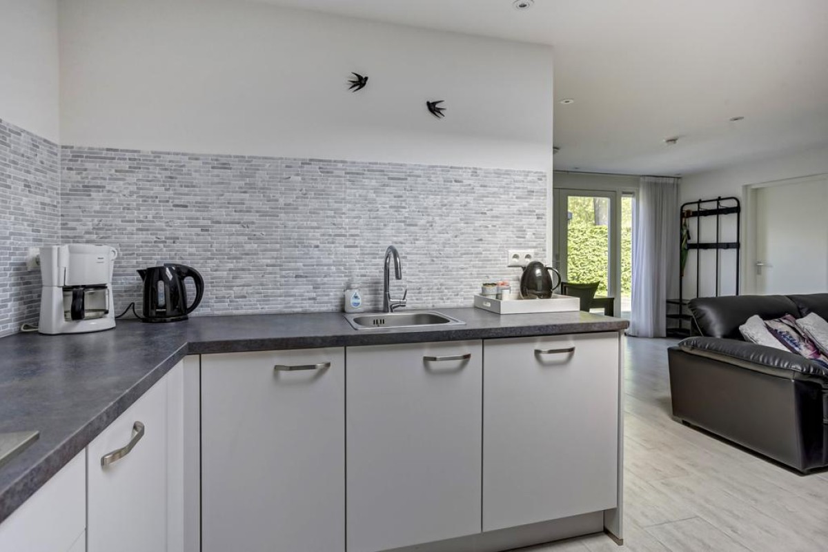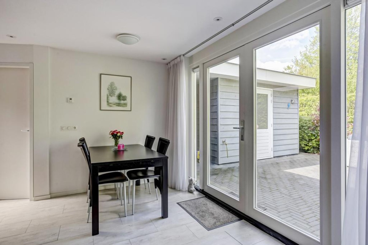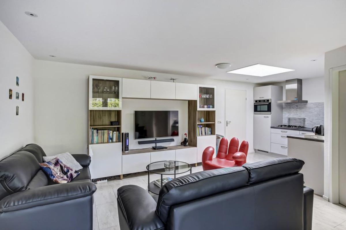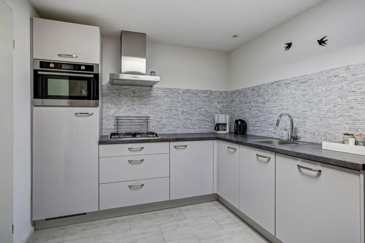 Lees verderDe moderne open keuken wordt verlicht door een opaal zonwerende dubbelwandige dakkoepel (2020) en is ruim van opzet. De keuken is uitgevoerd in een hoekopstelling en afgewerkt met zijde grijs fronten en een natuurstenen achterwand voorzien van 4-pits gaskookplaat, combimagnetron, RVS afzuigkap, koelkast met vriesvak en vaatwasser.