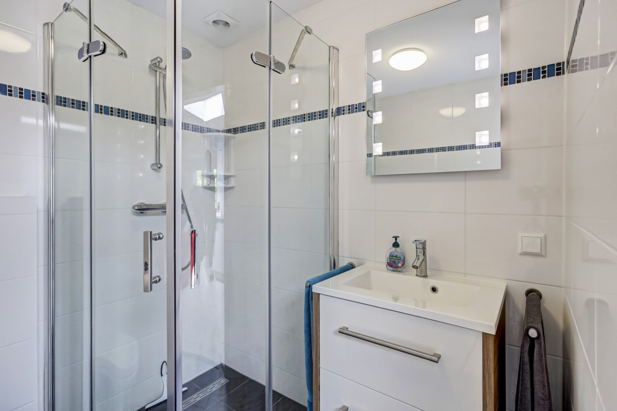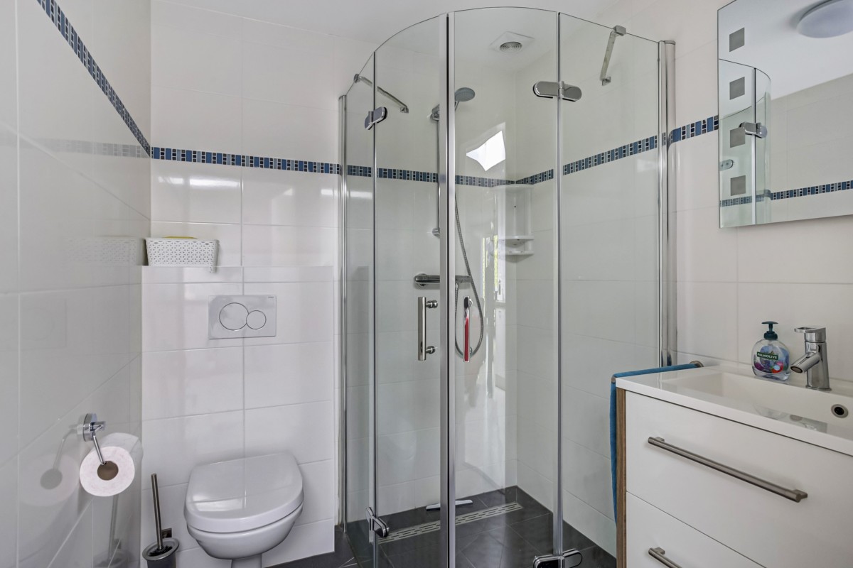 Achter de keuken is de luxe badkamer gelegen en voorzien is van een modern wastafelmeubel, douchecabine, spiegel met verlichting en een hangcloset. Aangrenzend aan de woonkamer zijn de drie ruime slaapkamers bereikbaar. De kamers zijn voorzien van Svedix binnendeuren, draai-kiepramen voorzien van ventilatieroosters en horren. Tevens zijn de kamers deels voorzien van praktische vaste kasten.