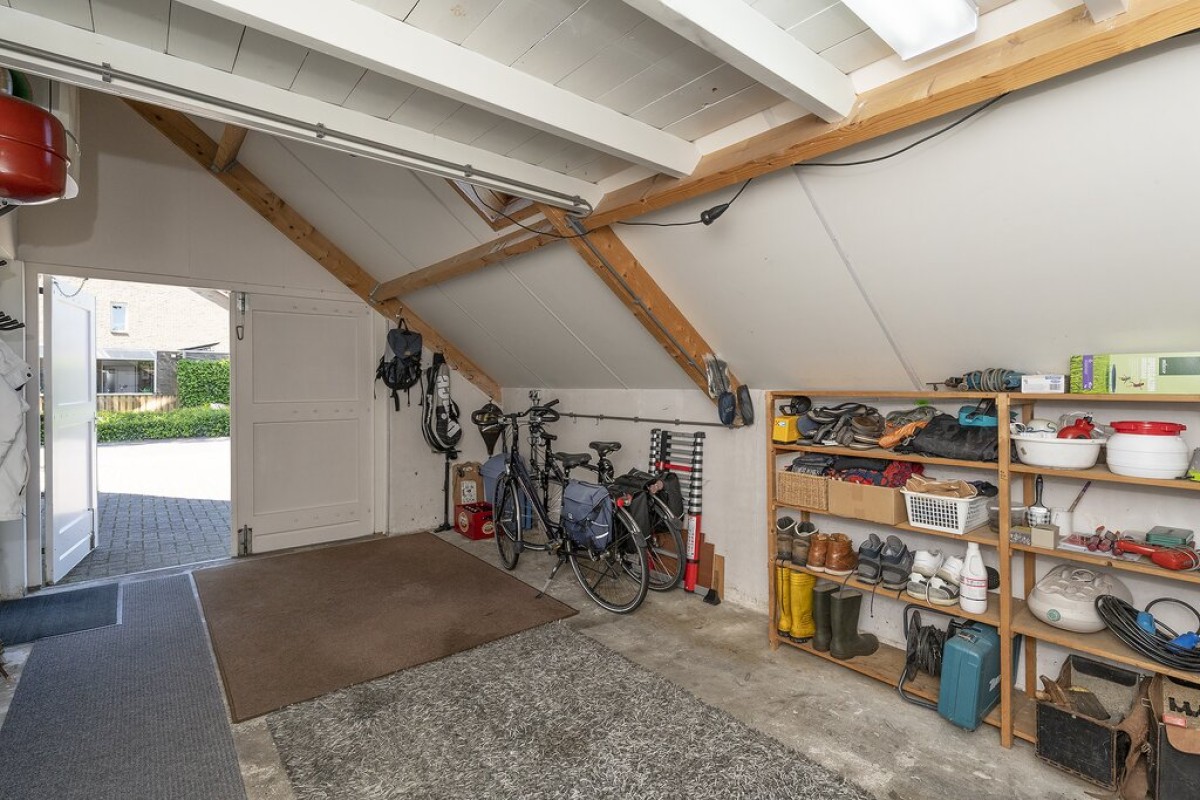De garage, welke ook via de hal is te bereiken, is extra breed, geïsoleerd en wordt verwarmd. Achter de garage bevindt zich de praktische bijkeuken met gootsteen en opstelling voor het witgoed. Ook is de tuin via de bijkeuken te bereiken.