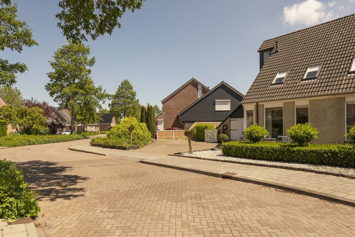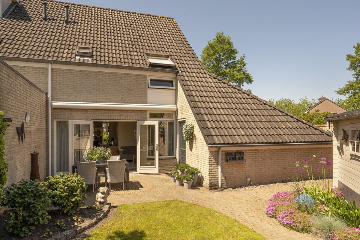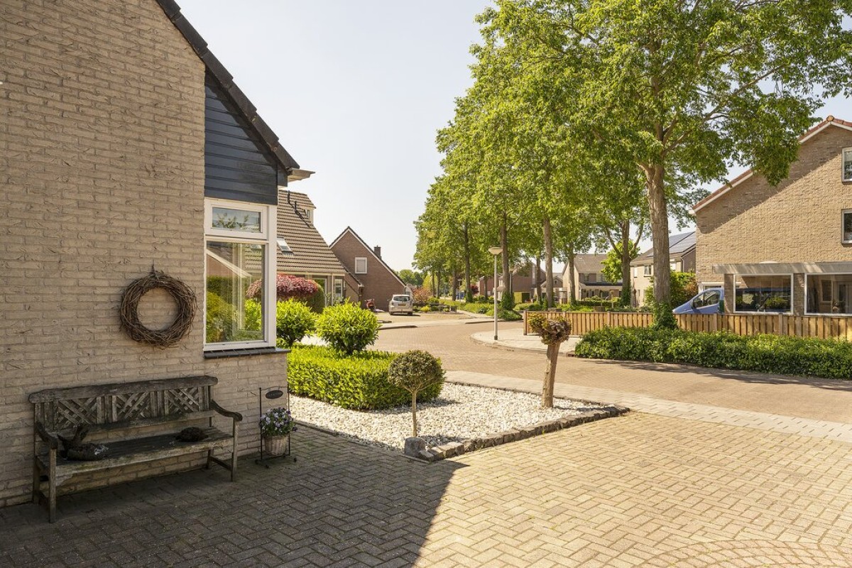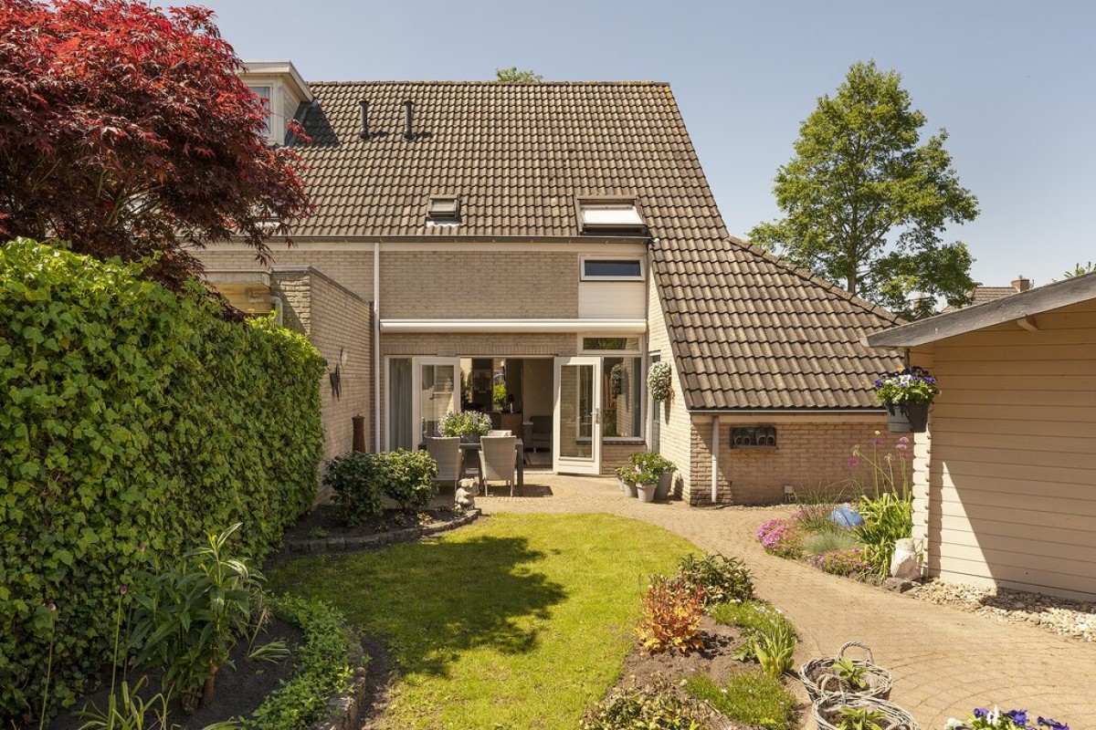 De oprit biedt veel ruime voor minimaal drie auto's, caravan en/of camper etc.. De zij- en achtertuin is speels ingericht met zowel gras, terras als tuinborders. Een elektrische zonwering van circa 5 meter breed en een uitval van circa 3 meter diep maakt het geheel compleet.