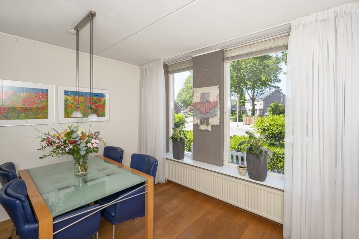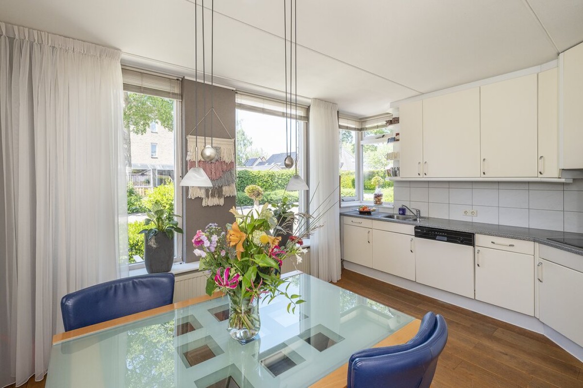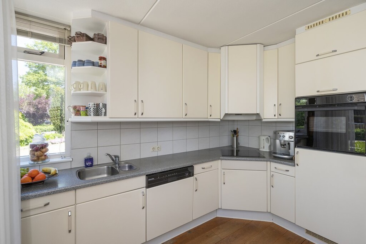 Entree, hal met trapopgang, meterkast en toilet, doorgang naar de garage en doorgang naar de tuingerichte woonkamer met sfeervolle moderne gashaard. Aan de voorzijde bevindt zich de woonkeuken in hoekopstelling voorzien van diverse apparatuur. Via twee openslaande deuren in de woonkamer is de verzorgde achtertuin te bereiken. De gehele begane grond is voorzien van een massief eiken vloer.