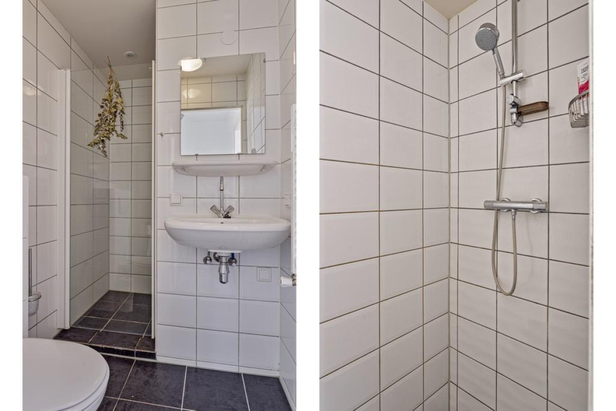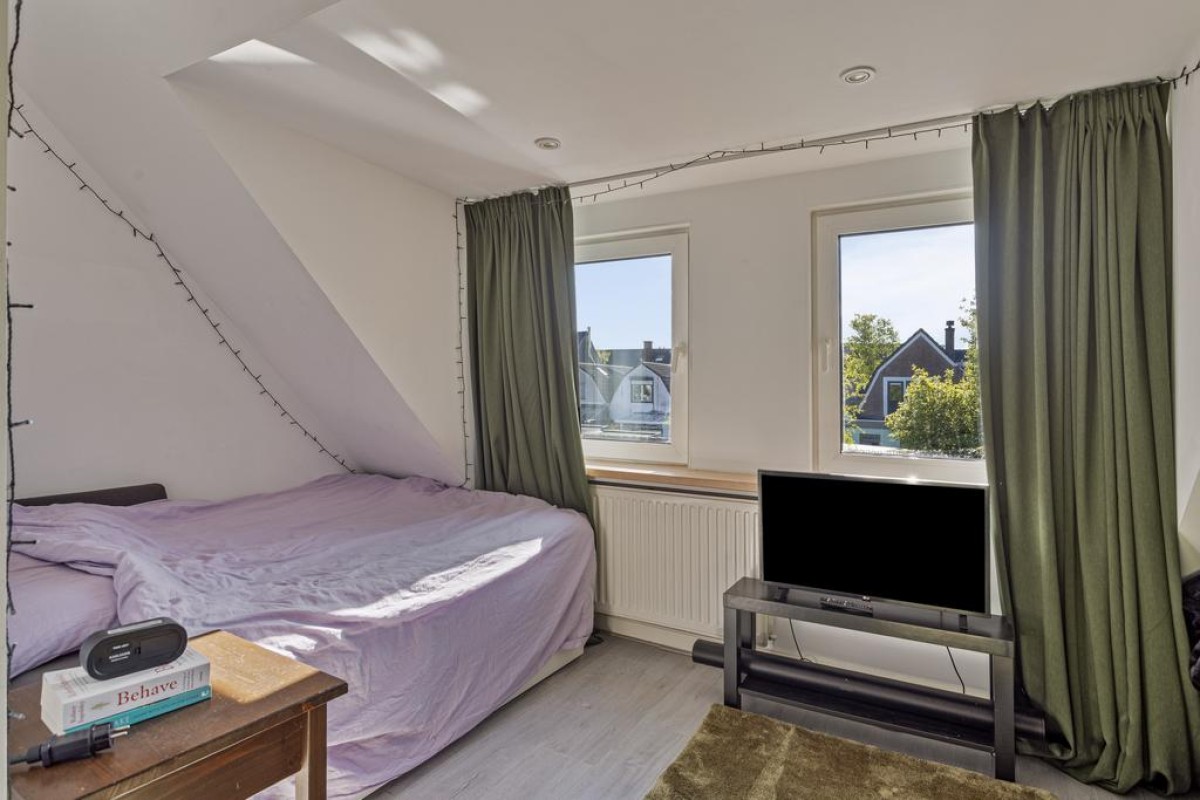 Eerste verdieping: overloop, één slaapkamer aan de achterzijde met dakkapel en een slaapkamer aan de voorzijde met dakkapel. De slaapkamers worden gescheiden door een badkamer welke plaats biedt aan een toilet, wastafel en inloopdouche.