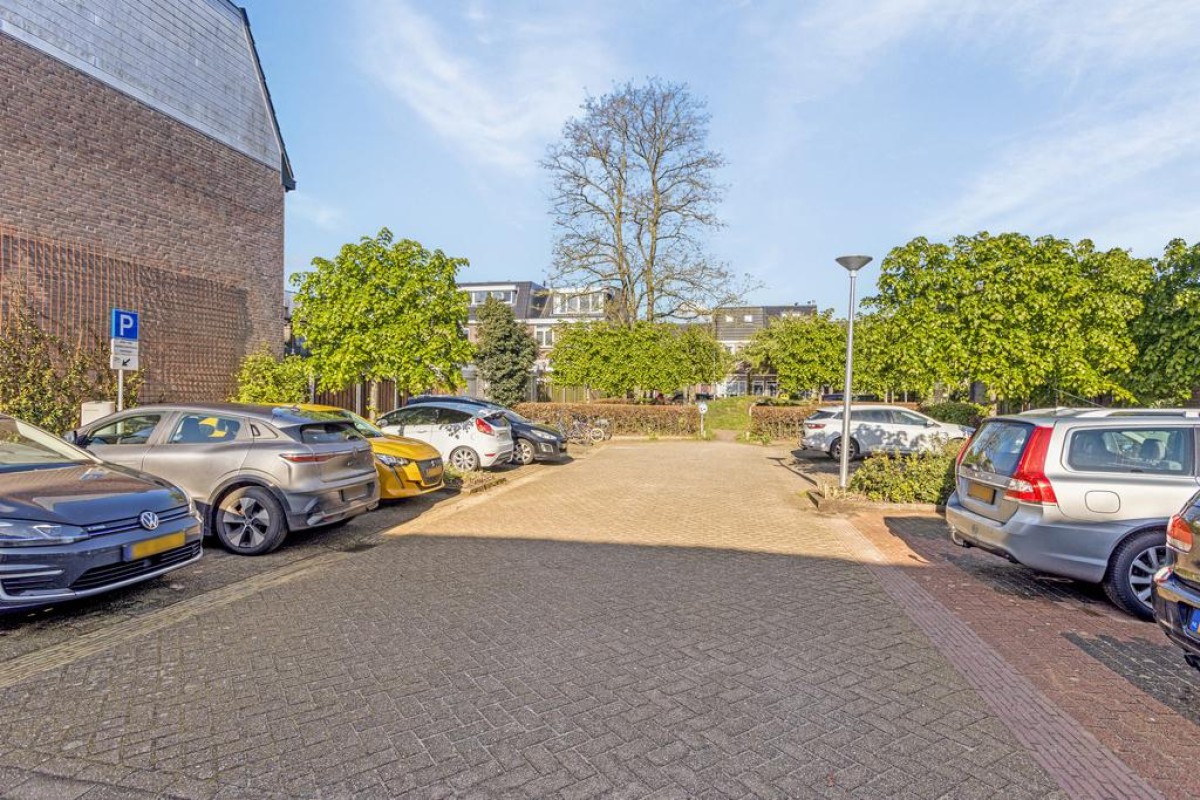 Er zijn parkeerplaatsen voor de deur en middenin de straat is een parkeerplaats voor meerdere auto’s aanwezig.