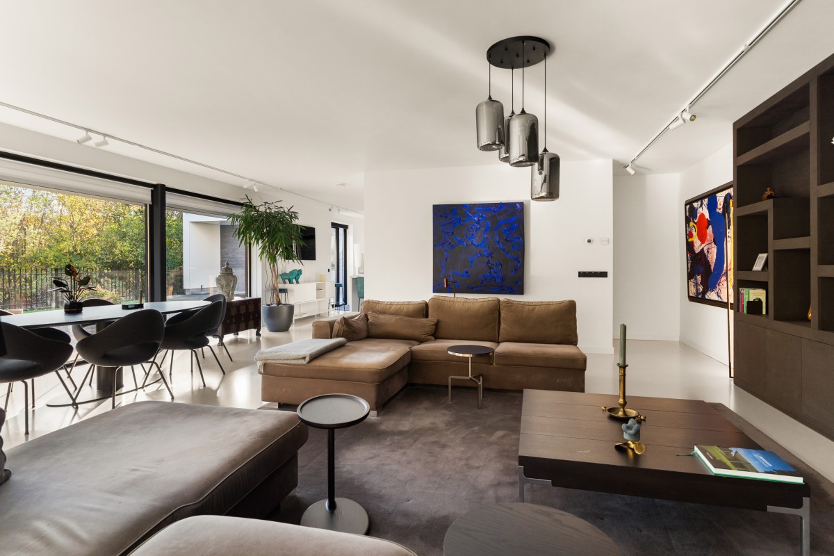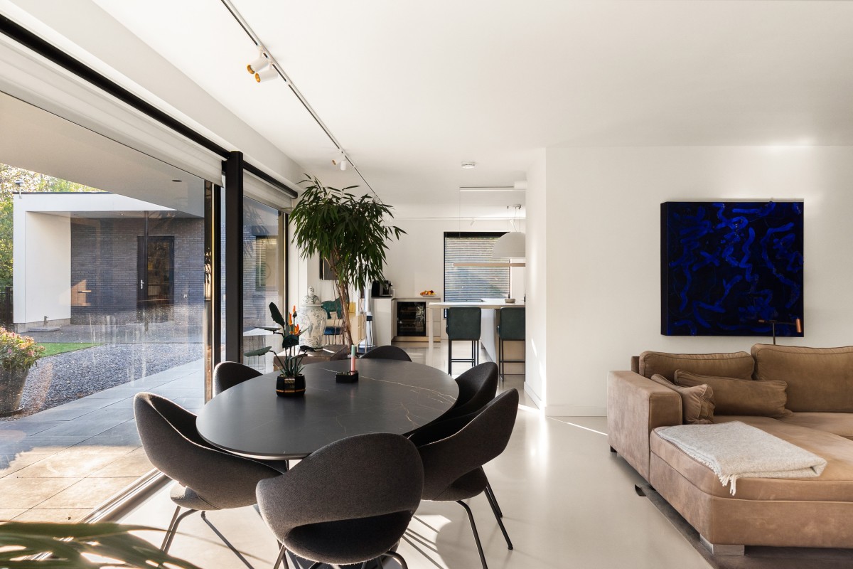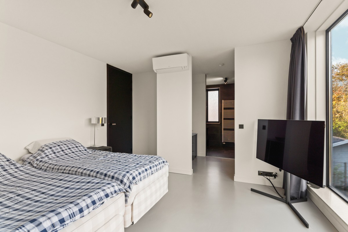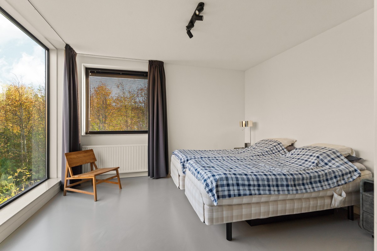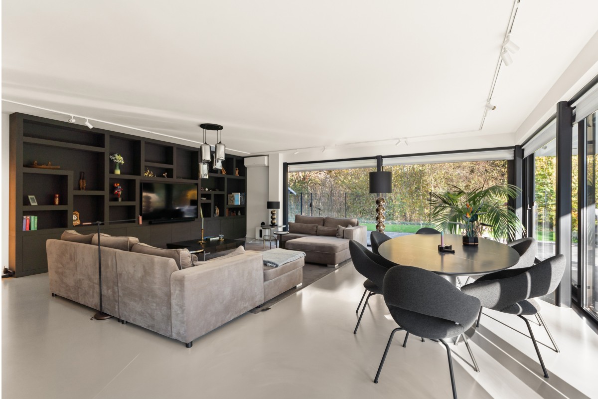 Via de keuken bereik je de living. Door de grote raampartijen worden binnen en buiten met elkaar verbonden, waardoor de woonkamer nóg ruimer aanvoelt. De brede schuifpuien aan weerszijden maken de ervaring van wonen aan het bos compleet. Naast vloerverwarming is de ruimte ook voorzien van een airco voor zowel koeling als verwarming. De begane grond is afgewerkt met strak stucwerk en een gietvloer met vloerverwarming.