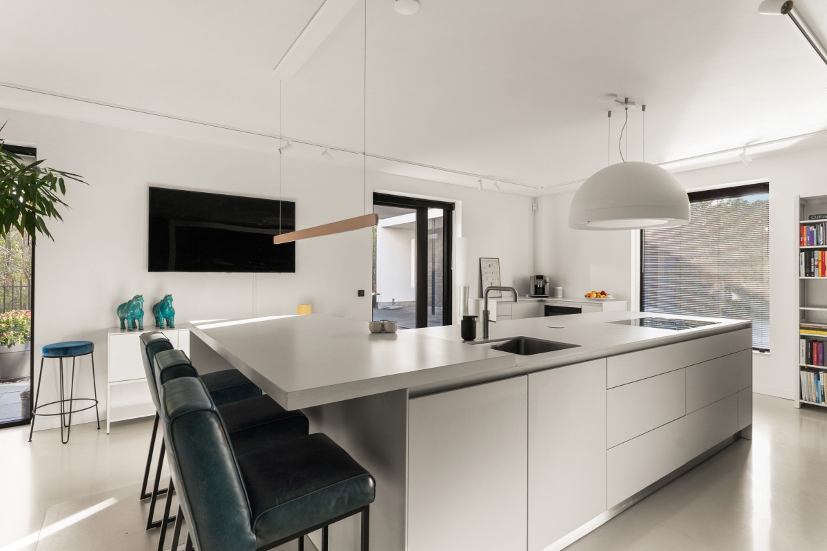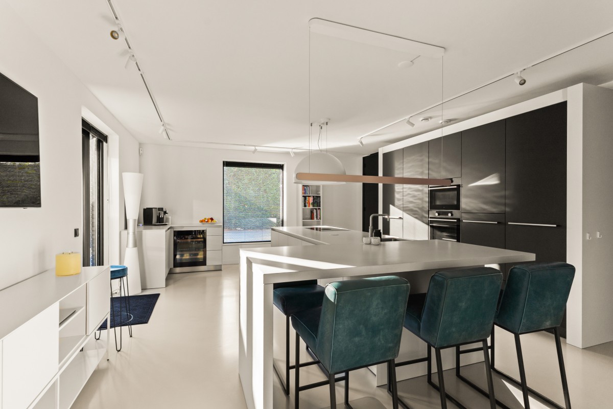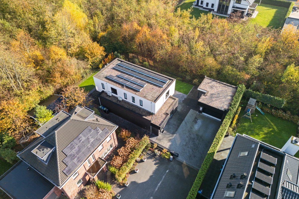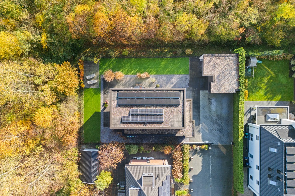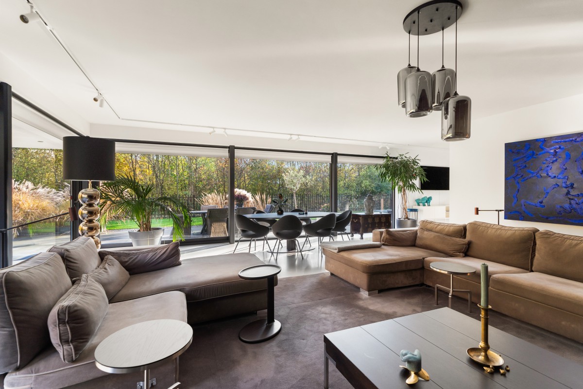 Via de keuken bereik je de living. Door de grote raampartijen worden binnen en buiten met elkaar verbonden, waardoor de woonkamer nóg ruimer aanvoelt. De brede schuifpuien aan weerszijden maken de ervaring van wonen aan het bos compleet. Naast vloerverwarming is de ruimte ook voorzien van een airco voor zowel koeling als verwarming. De begane grond is afgewerkt met strak stucwerk en een gietvloer met vloerverwarming.
