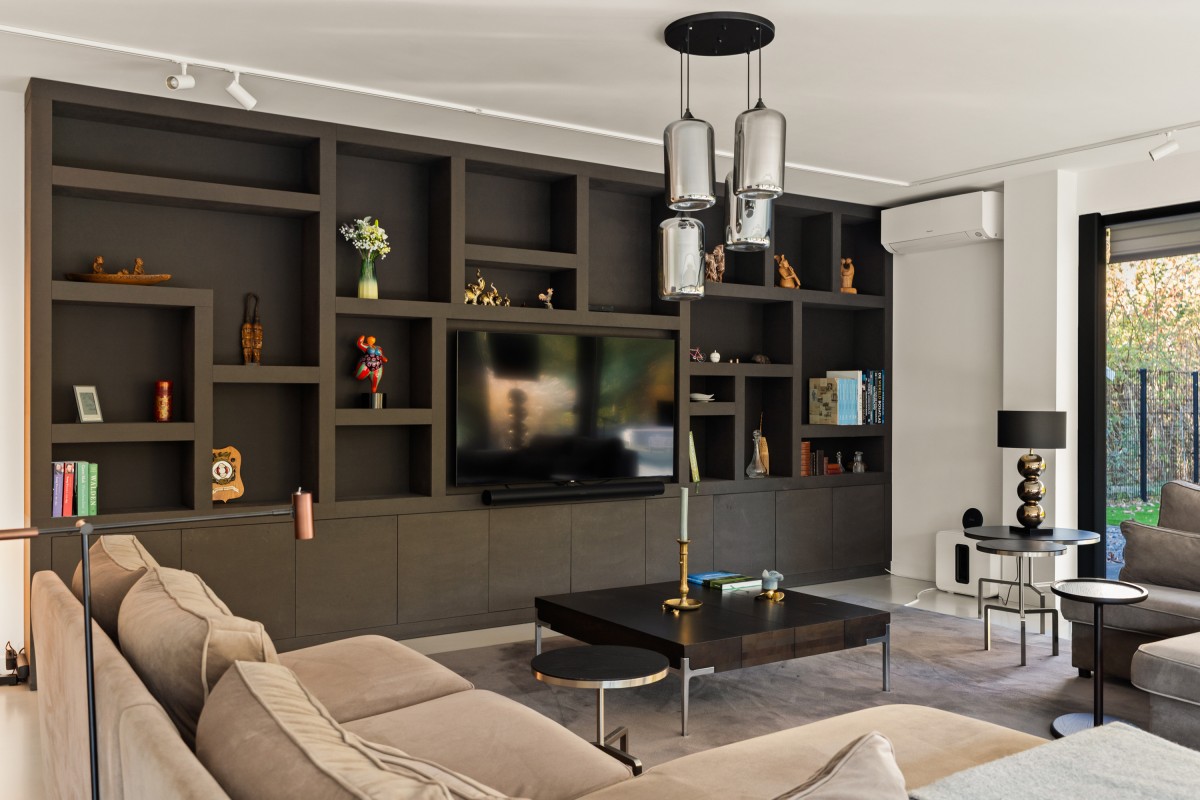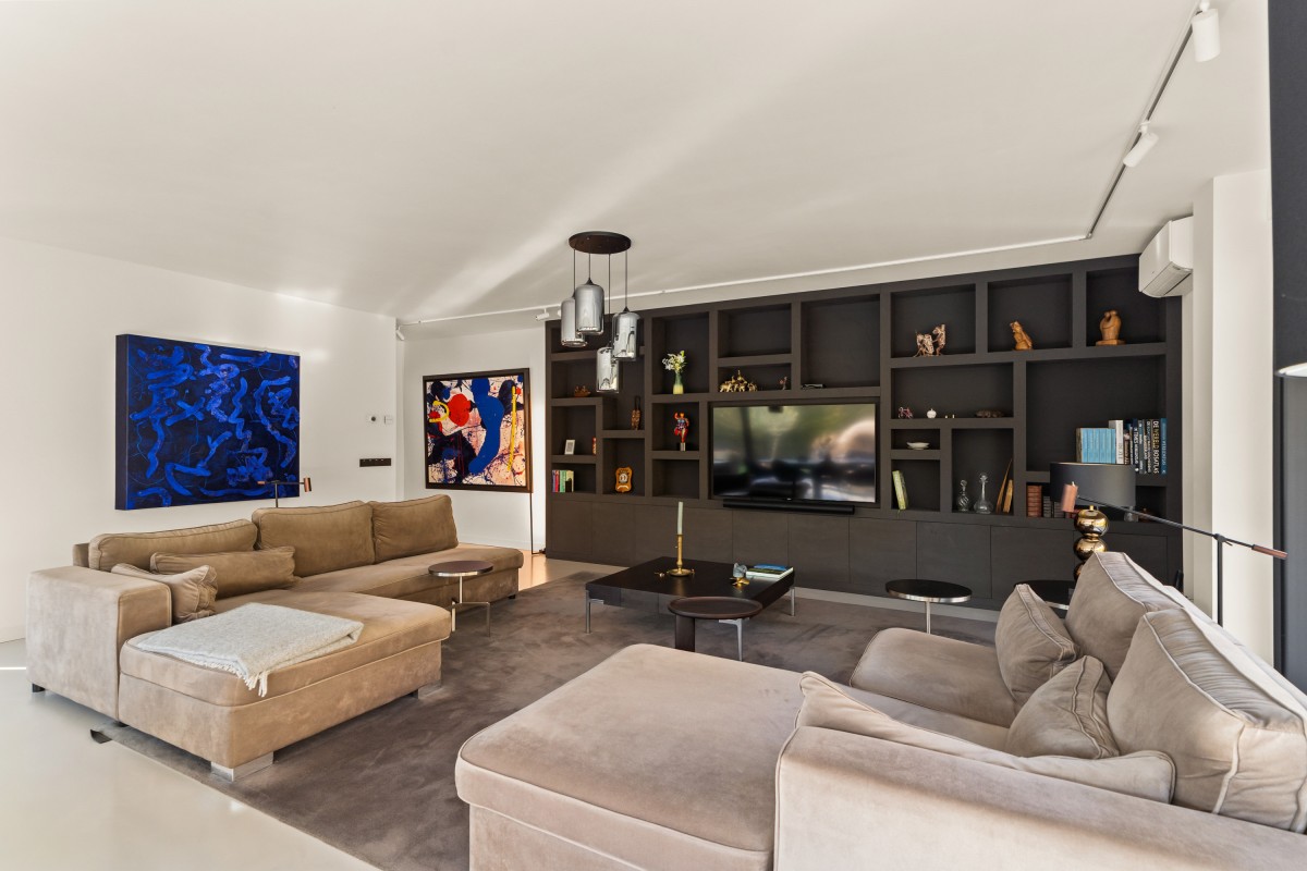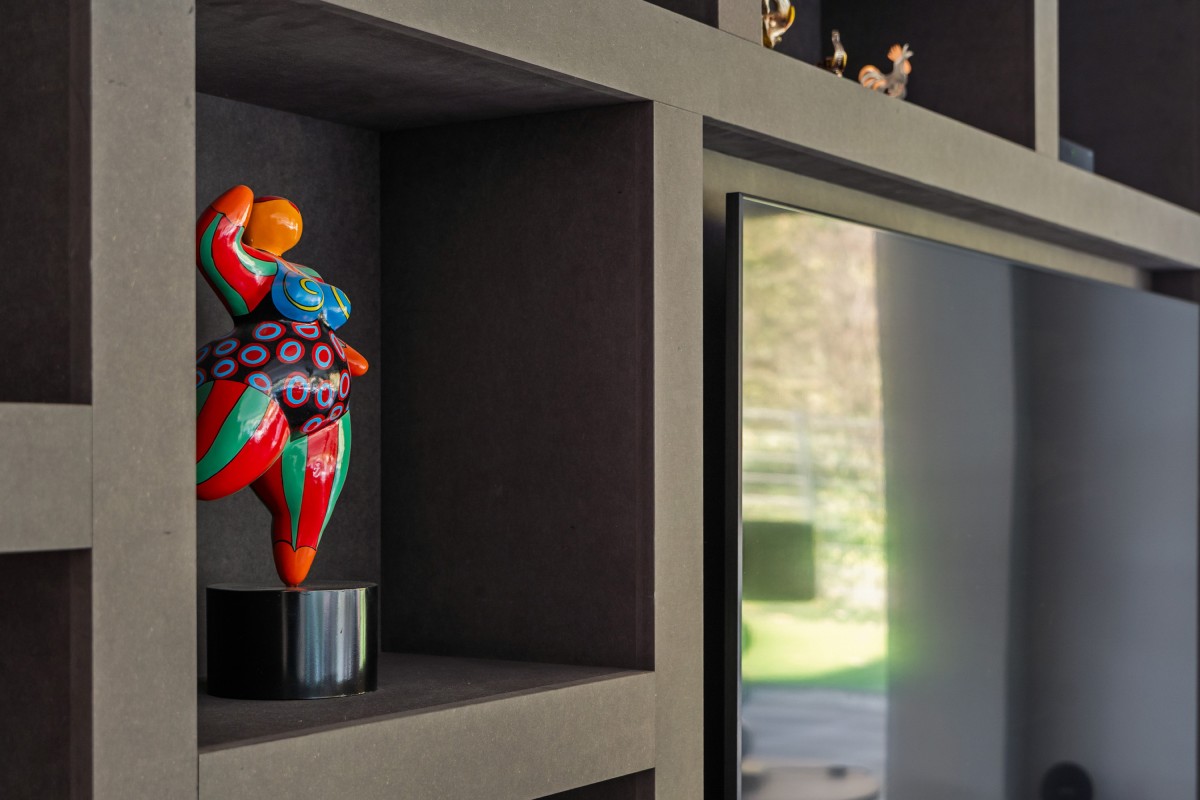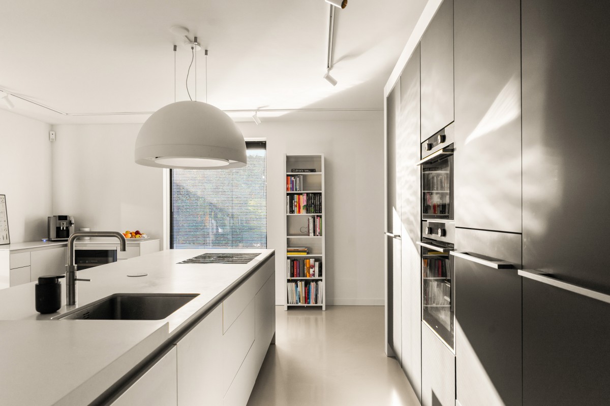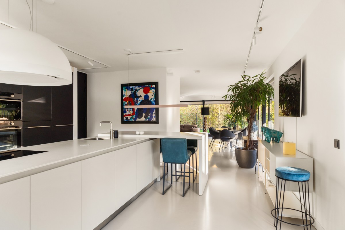 Via de keuken bereik je de living. Door de grote raampartijen worden binnen en buiten met elkaar verbonden, waardoor de woonkamer nóg ruimer aanvoelt. De brede schuifpuien aan weerszijden maken de ervaring van wonen aan het bos compleet. Naast vloerverwarming is de ruimte ook voorzien van een airco voor zowel koeling als verwarming. De begane grond is afgewerkt met strak stucwerk en een gietvloer met vloerverwarming.