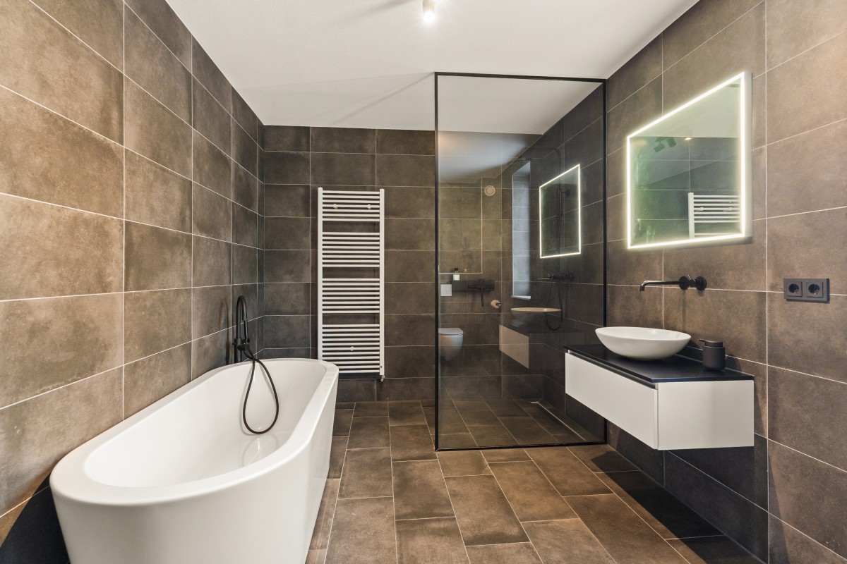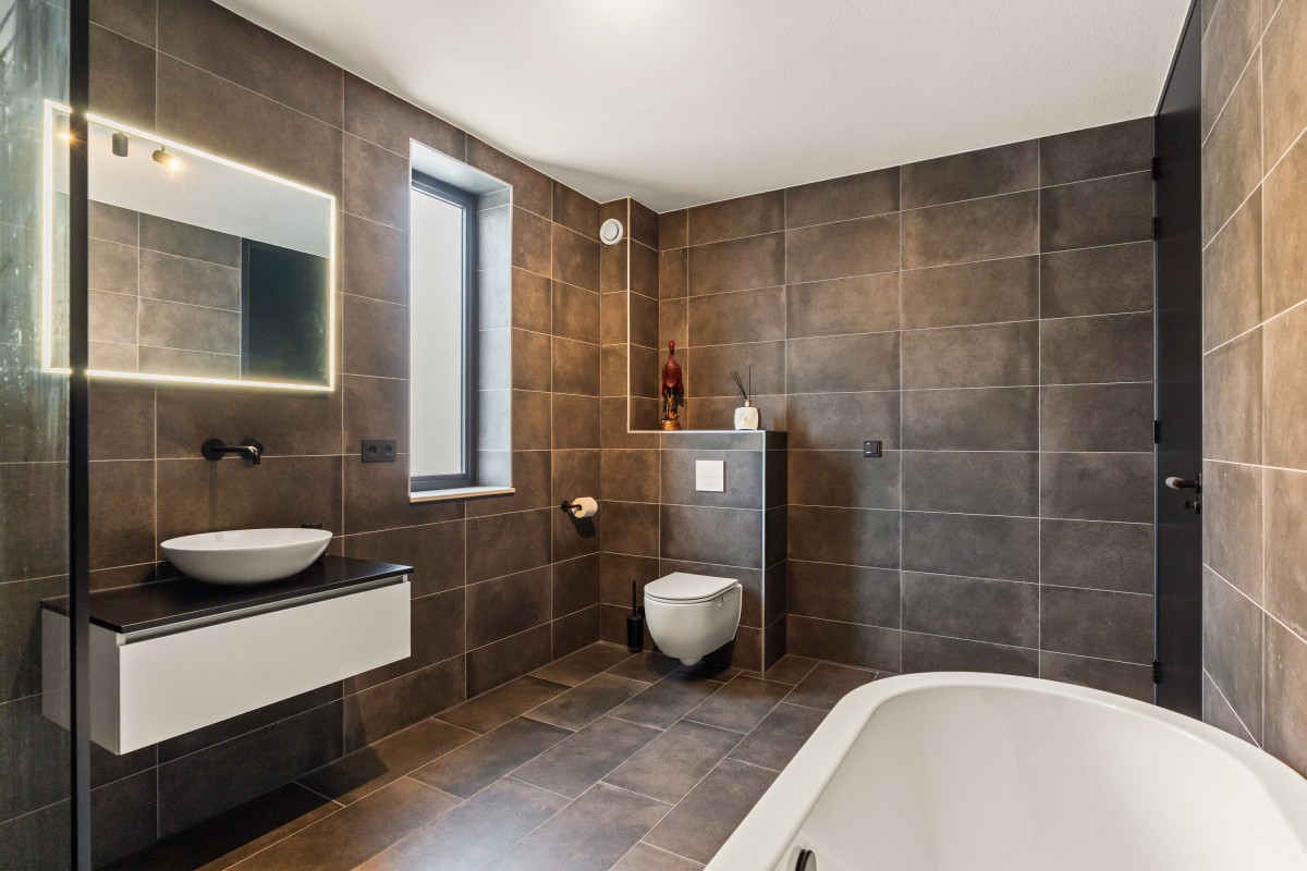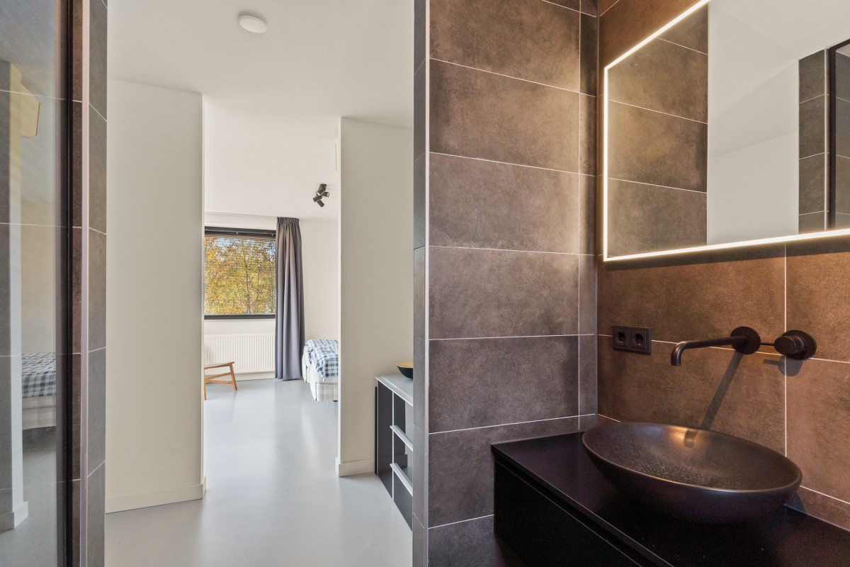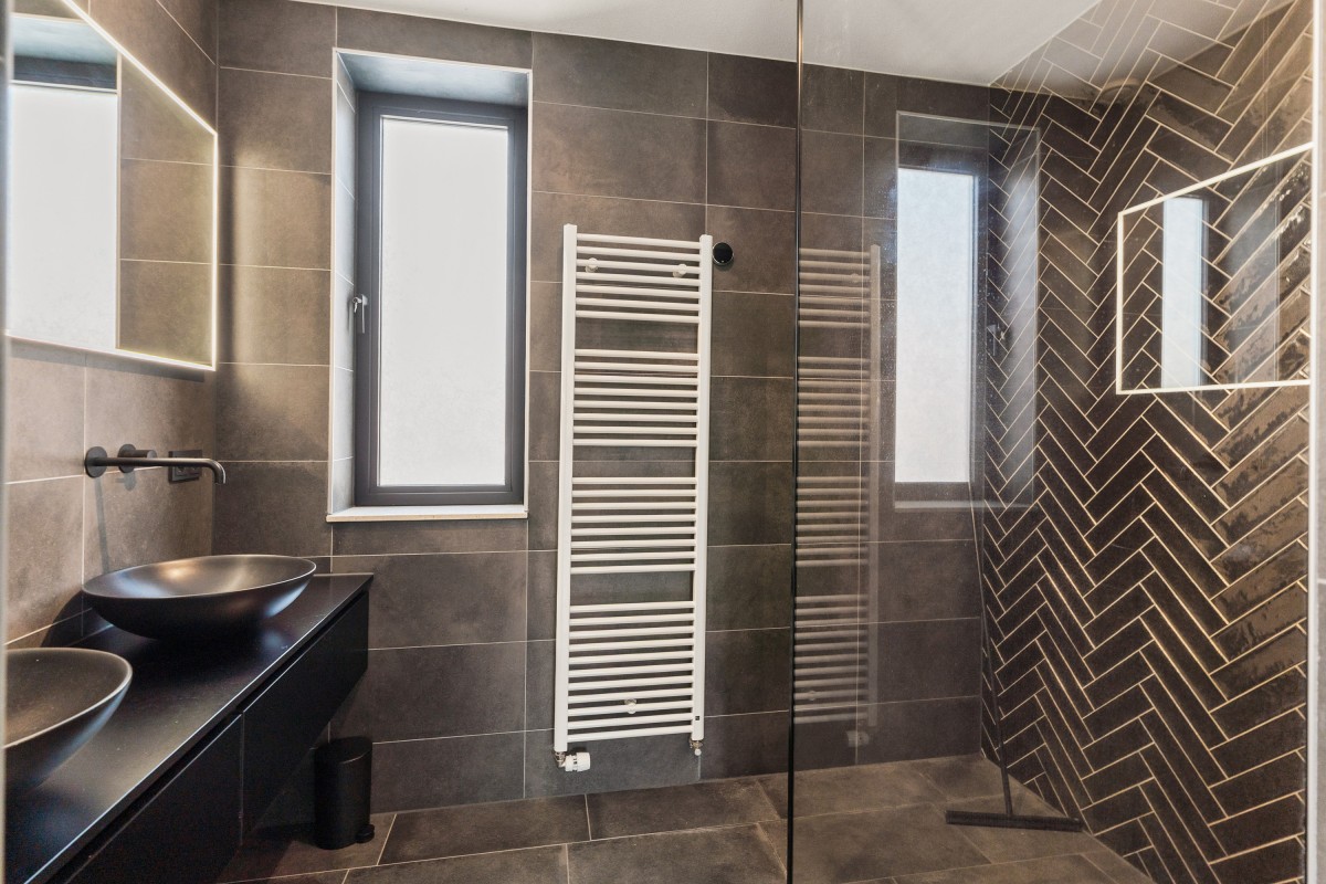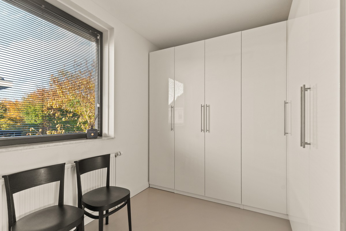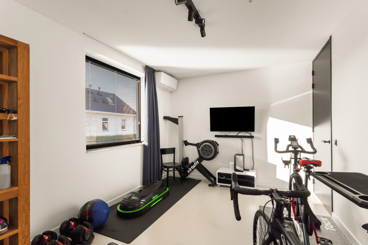 De tweede badkamer bevindt zich naast de sportkamer en is voorzien van een ligbad, toilet, inloopdouche en wastafelmeubel. Op deze verdieping bevindt zich ook de berging annex wasruimte, met aansluitingen voor de wasmachine en droger, de omvormers en de nieuwe 'thuisbatterij'. Geen gedoe meer met teveel terugleveren aan de energiemaatschappij, want je slaat de opgewekte stroom zelf op voor later gebruik. Ook deze verdieping is volledig gestukt en voorzien van een gietvloer.