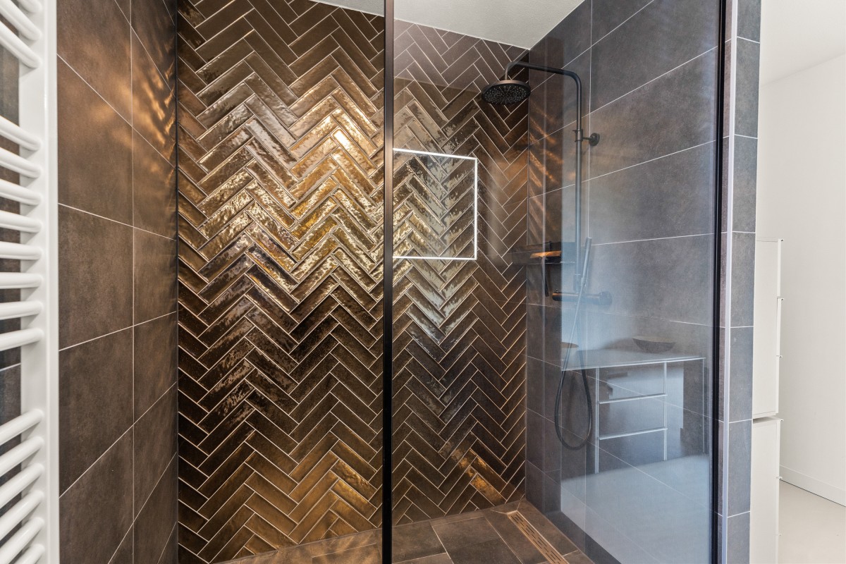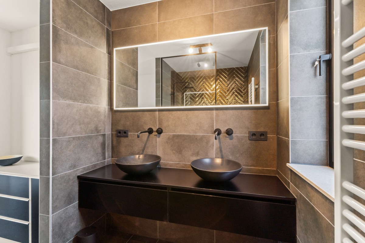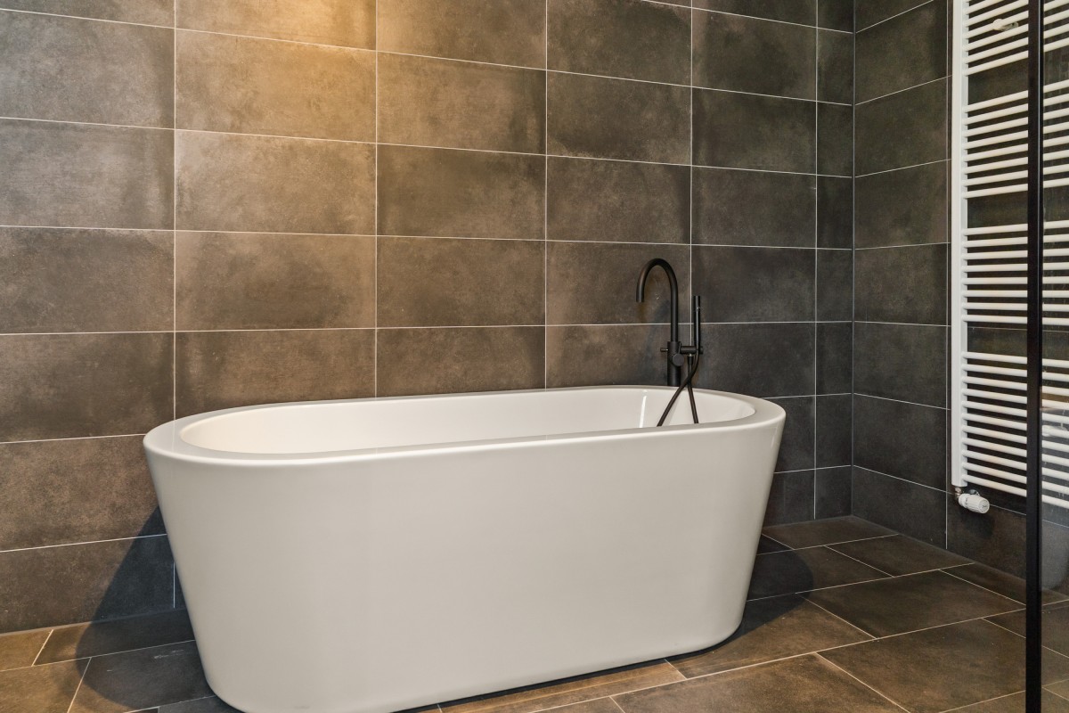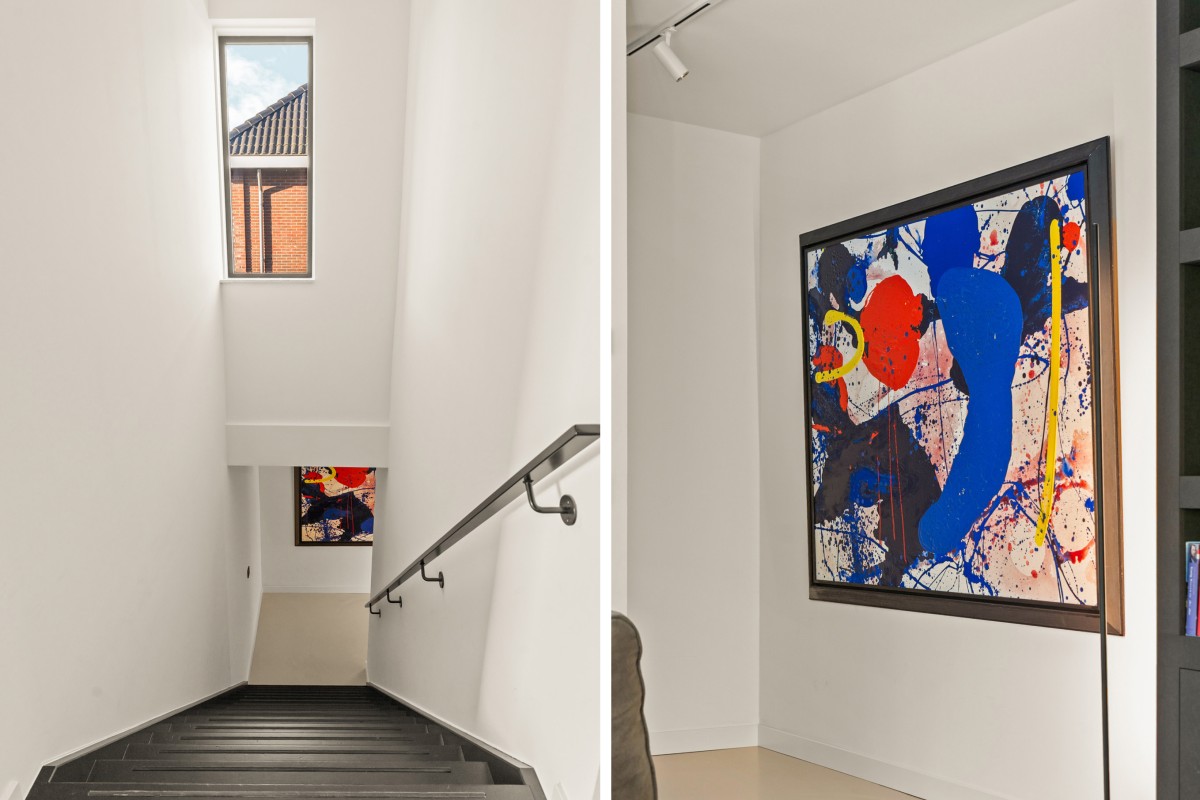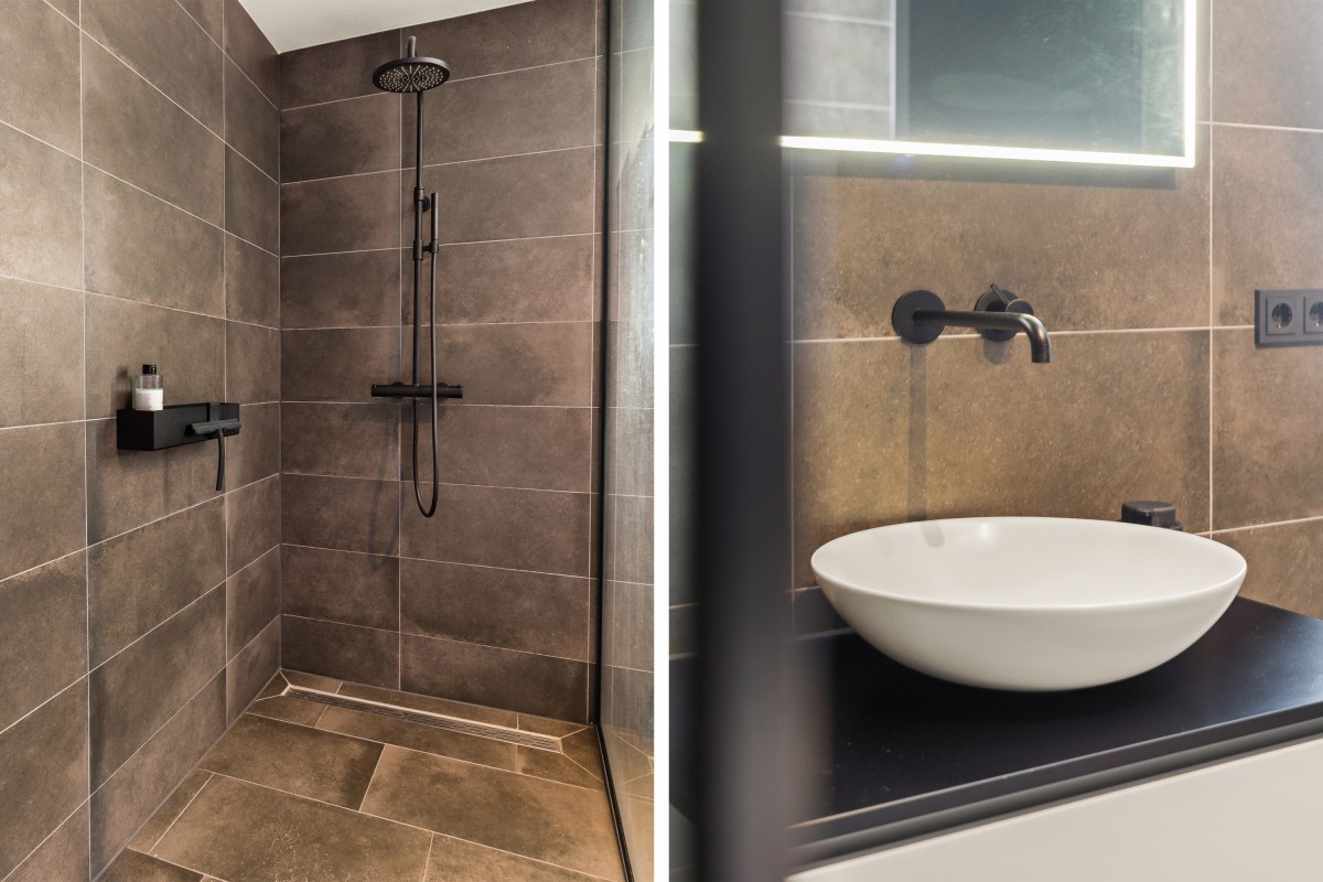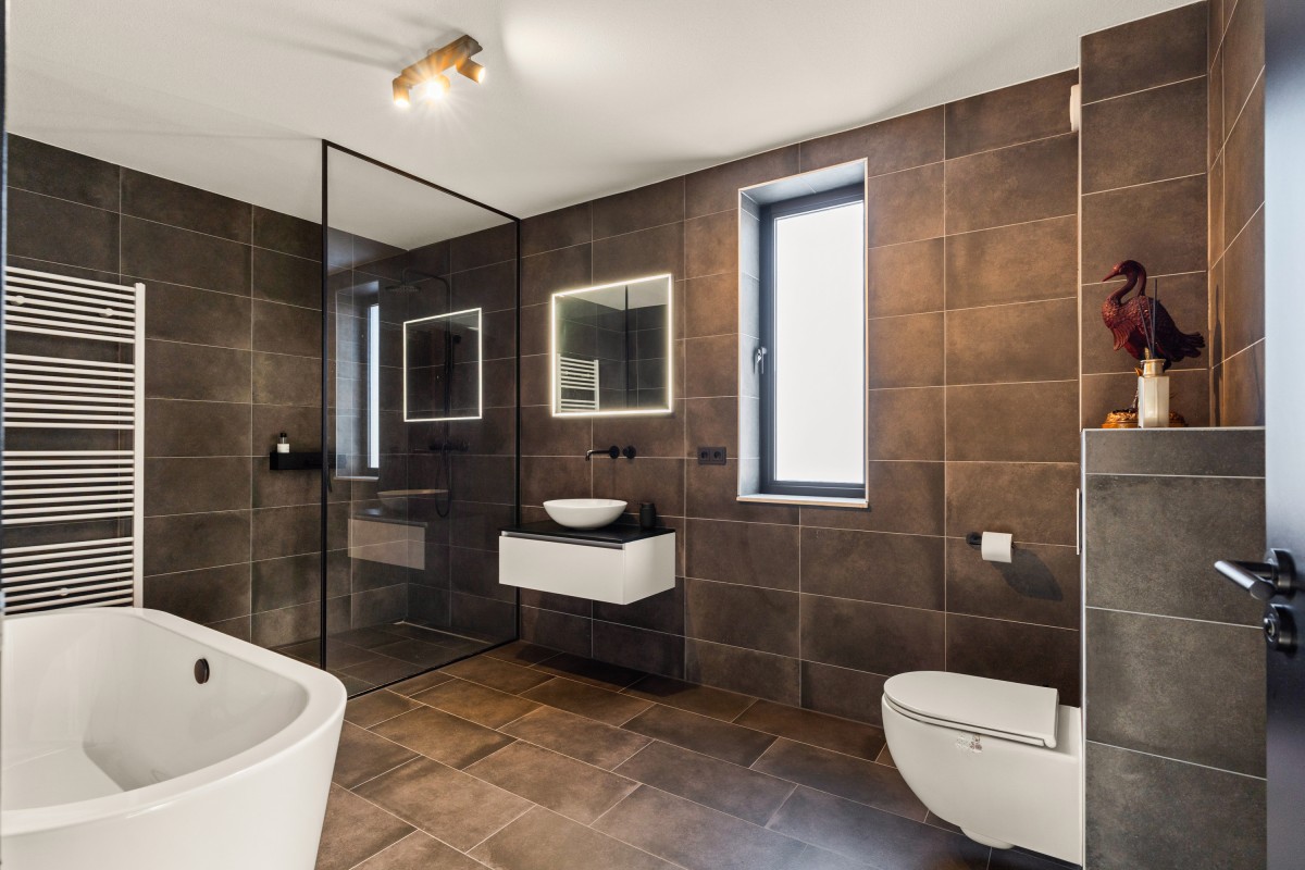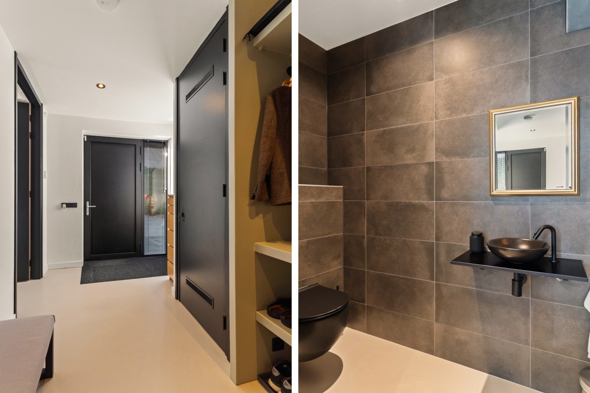 De tweede badkamer bevindt zich naast de sportkamer en is voorzien van een ligbad, toilet, inloopdouche en wastafelmeubel. Op deze verdieping bevindt zich ook de berging annex wasruimte, met aansluitingen voor de wasmachine en droger, de omvormers en de nieuwe 'thuisbatterij'. Geen gedoe meer met teveel terugleveren aan de energiemaatschappij, want je slaat de opgewekte stroom zelf op voor later gebruik. Ook deze verdieping is volledig gestukt en voorzien van een gietvloer.