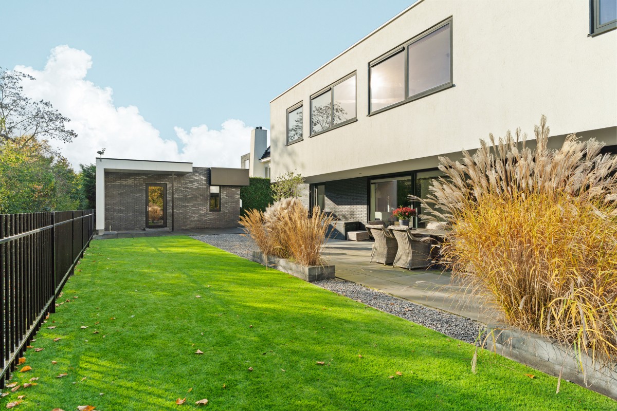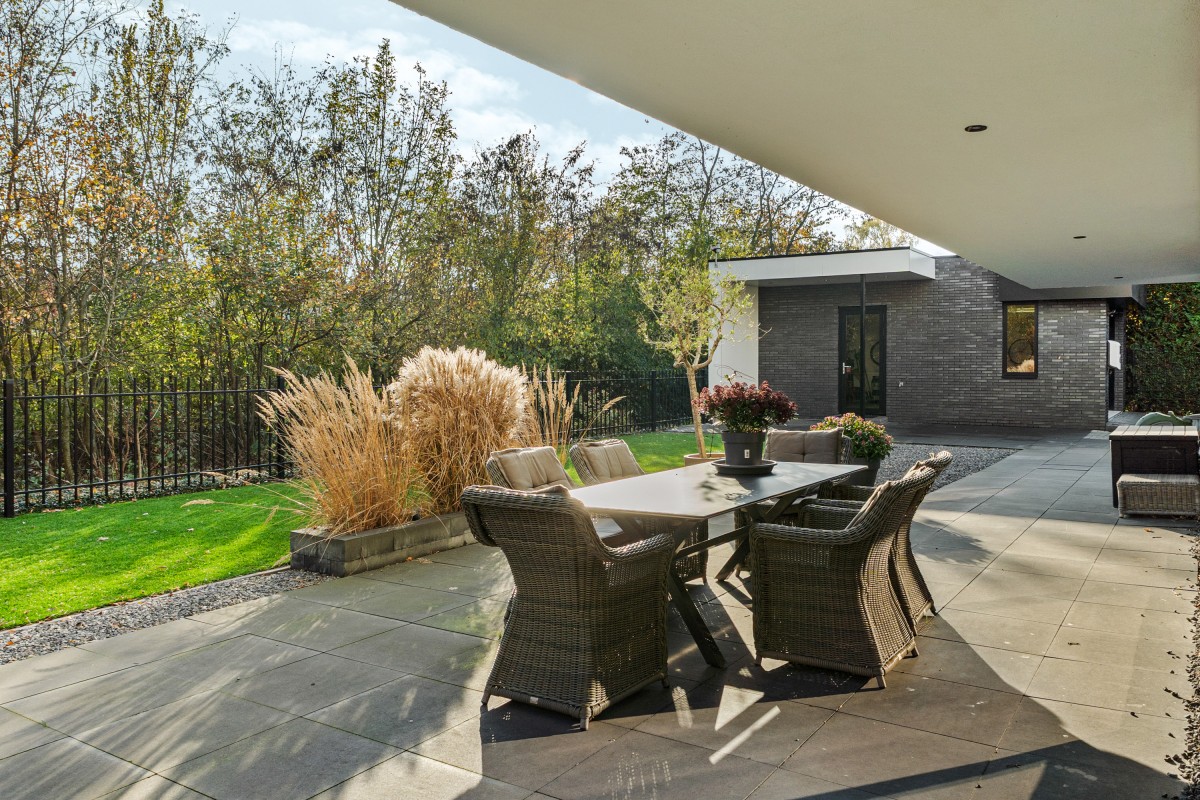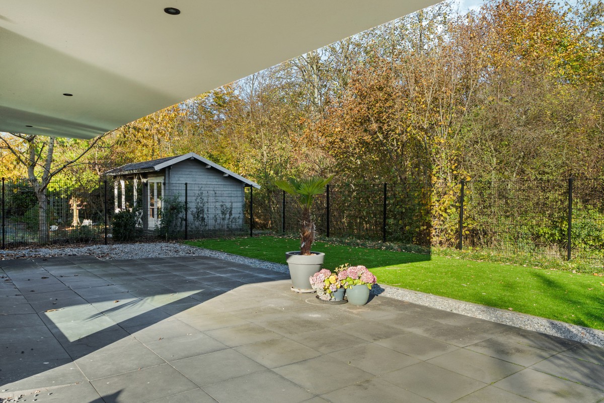 De heerlijke tuin biedt prachtig uitzicht op het bos en is omheind met een metalen erfafscheiding (om de reetjes en vosjes buiten te houden) en afgesloten met een elektronisch toegangshek. Er is veel ruimte voor verschillende zitjes, zowel in de zon als in de schaduw. Of je nu op een ligbedje wilt liggen of liever luistert op de grote loungeset, overal in de tuin kun je rust en privacy vinden. Voor het gemak zijn er een buitenkraan, goede verlichting en elektrische punten.