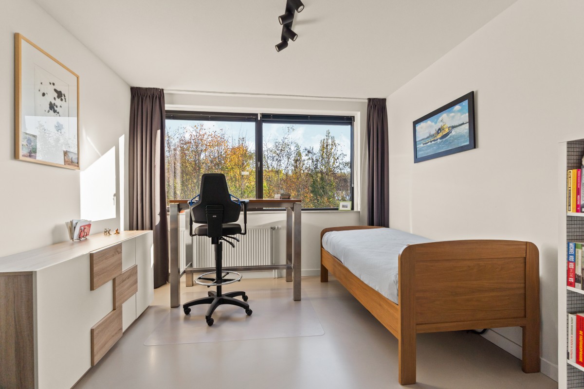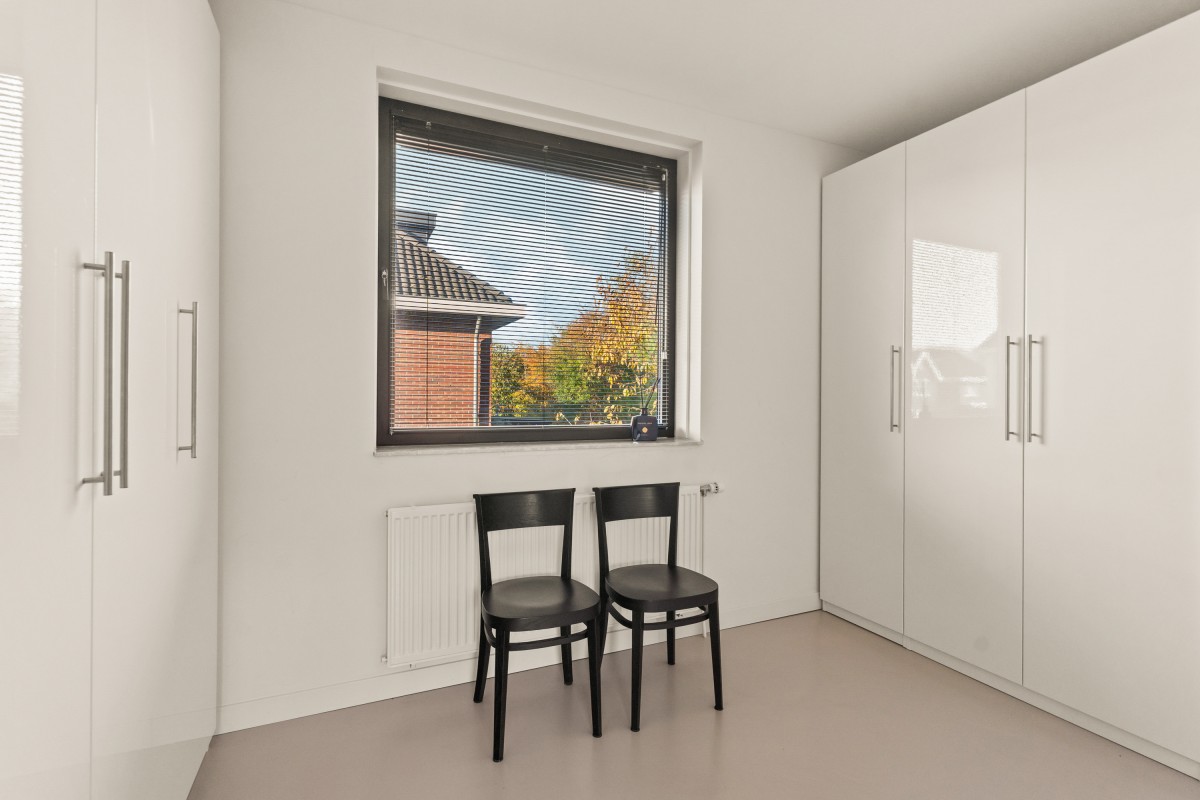 Via de trap in de woonkamer bereik je de eerste verdieping. Dankzij de vijf slaapkamers en twee badkamers is er voldoende ruimte voor een groot gezin, maar ook voor de thuiswerker is een eigen werkkamer geen probleem. De master bedroom aan de achterzijde van de woning beschikt over airco (koeling en verwarming) en een eigen ensuite badkamer met wastafelmeubel met twee wastafels en een inloopdouche. De slaapkamer aan de voorzijde, momenteel in gebruik als sportkamer, is ook voorzien van airco.
