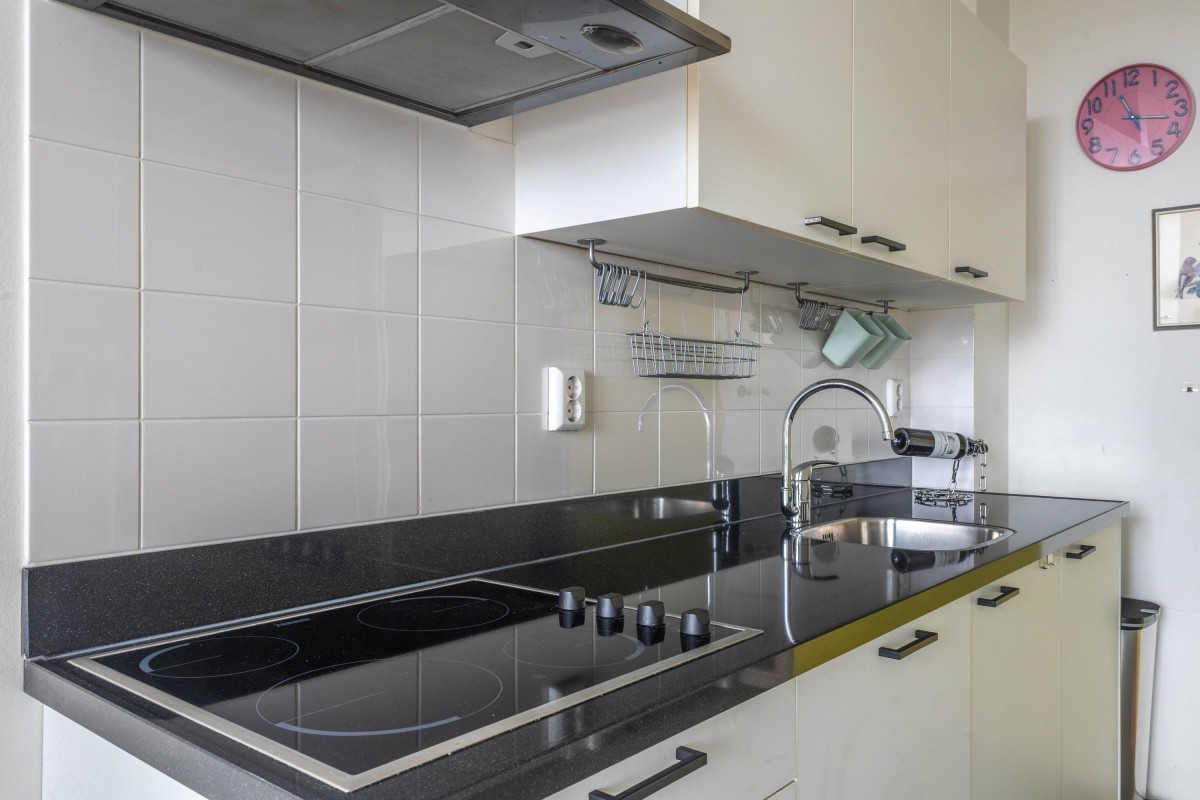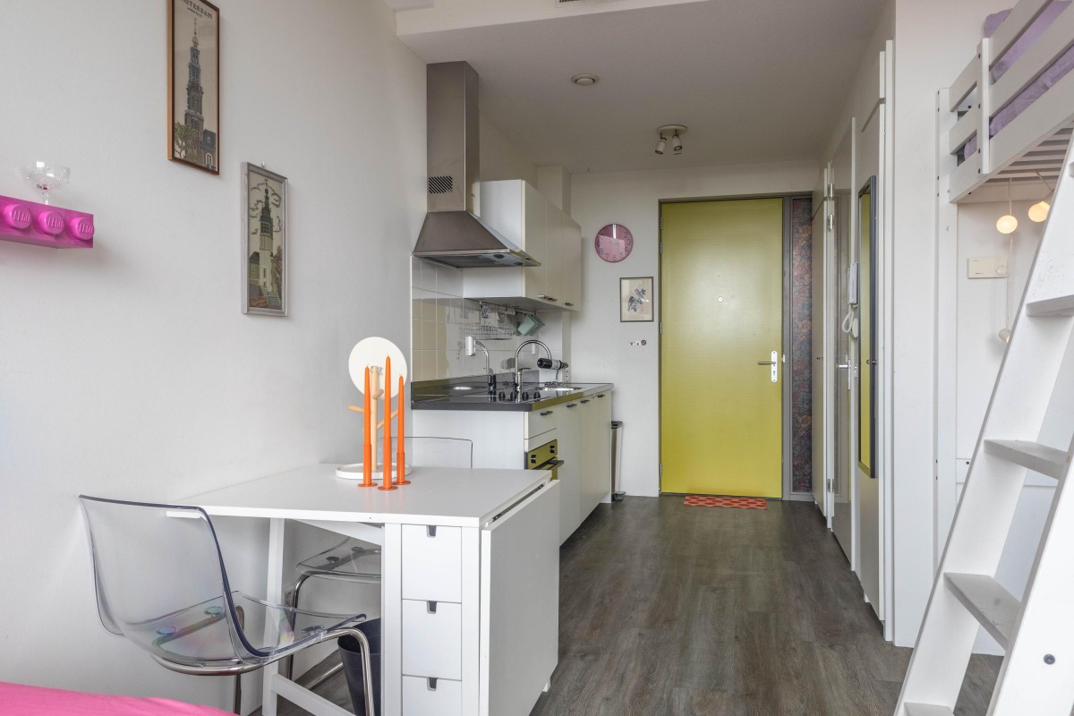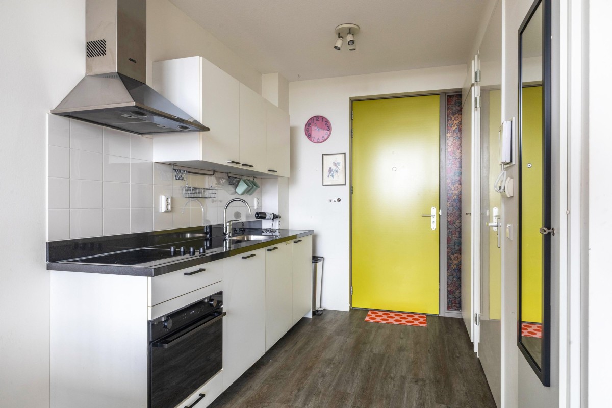 Bij binnenkomst sta je direct in de open keuken aan de voorzijde van de studio. De moderne, strak wit uitgevoerde keuken is voorzien van diverse inbouwapparatuur, waaronder een inductiekookplaat, koel- en vrieskast en een RVS-afzuigsysteem. De badkamer is volledig betegeld en uitgerust met een wastafel, toilet en een inloopdouche. Het woongedeelte bevindt zich aan de achterzijde van de studio. De woning is goed geïsoleerd. Indien gewenst, kun je met een room-divider eenvoudig een apart slaapgedeelte of een werk-/studeerplek creëren. De studio beschikt over vloerverwarming, vloerverkoeling en airconditioning. Daarnaast is er een videofoon aanwezig.