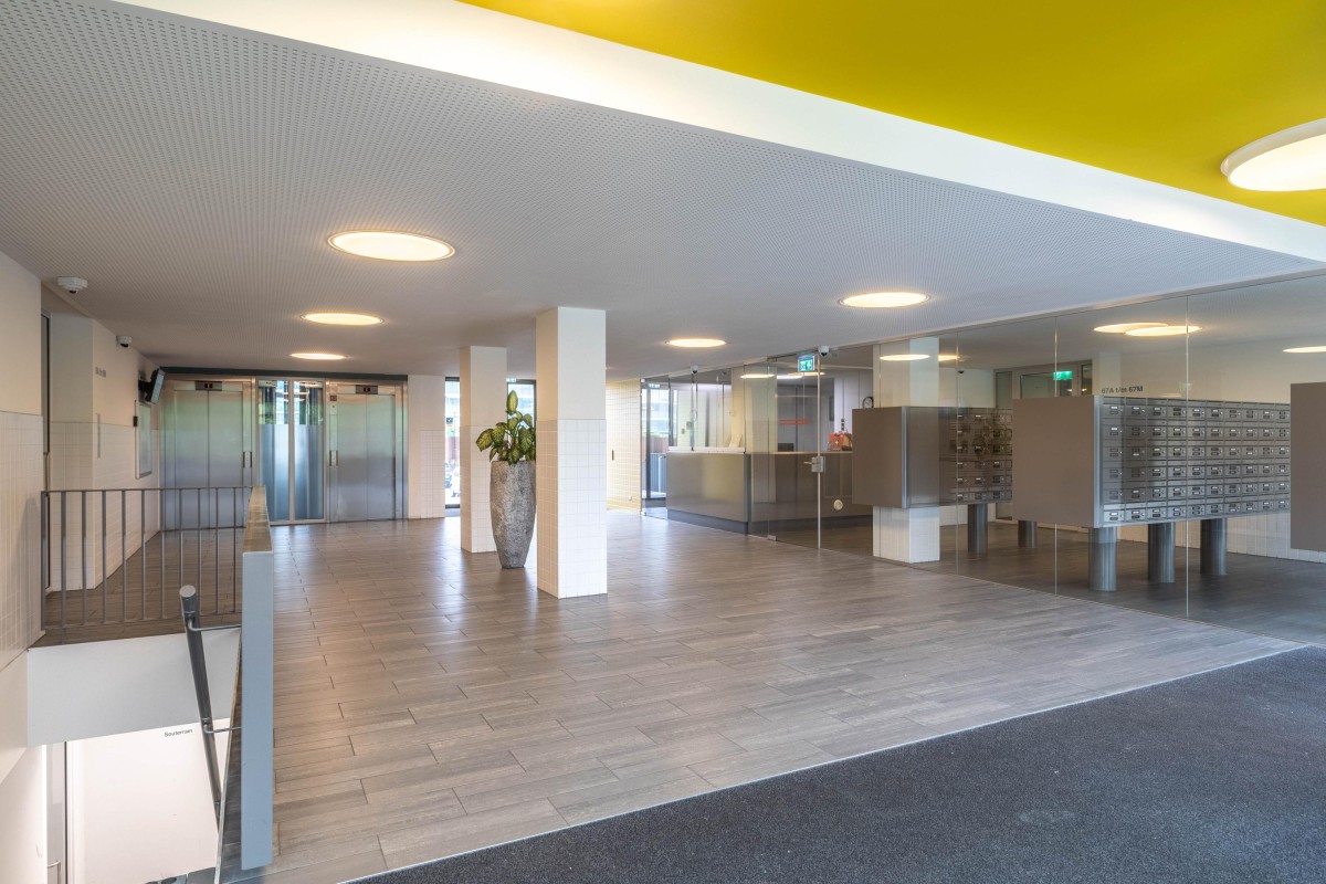 Gemeenschappelijke entree met receptiebalie van de huismeester, brievenbussen, trappenhuis en liften.
