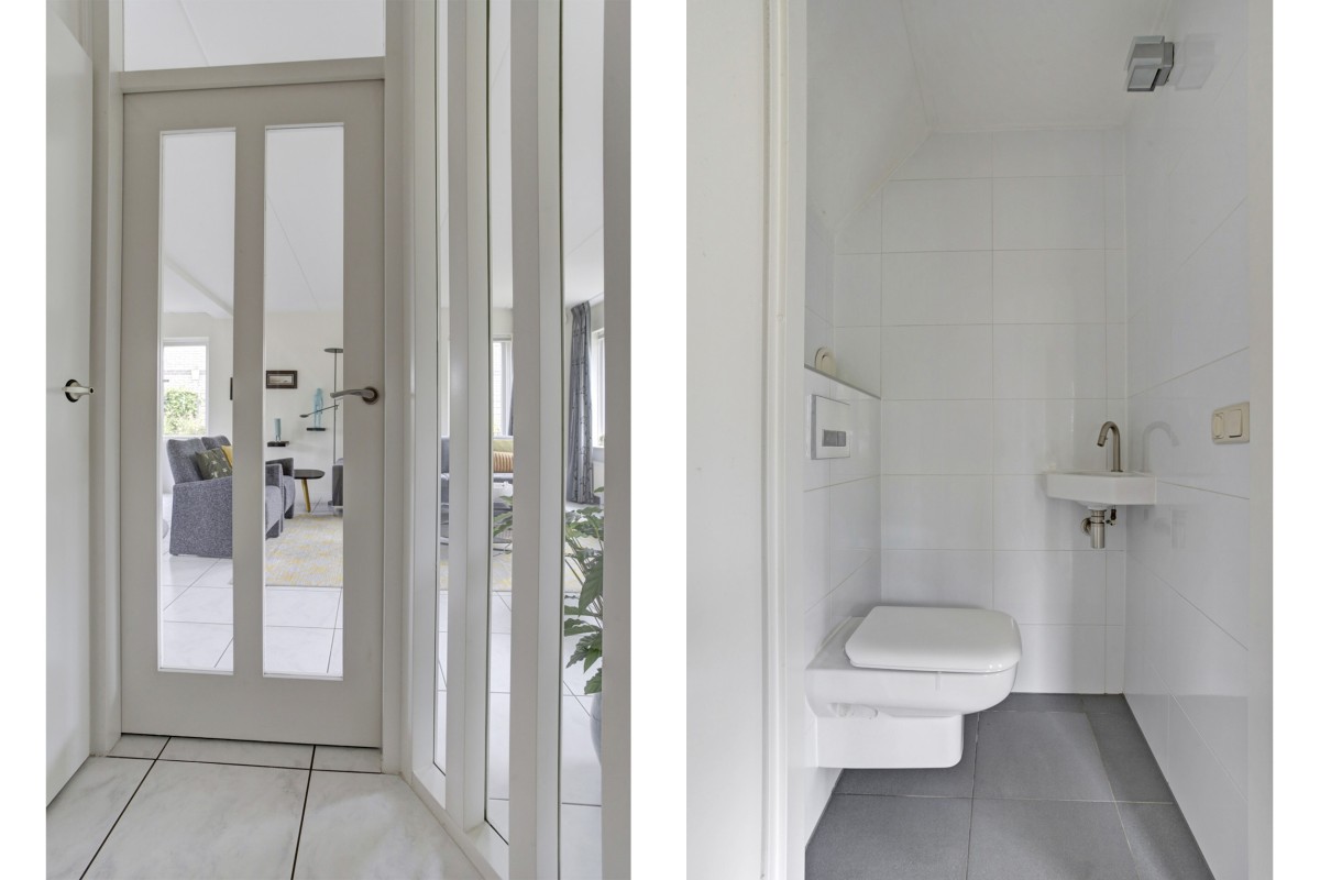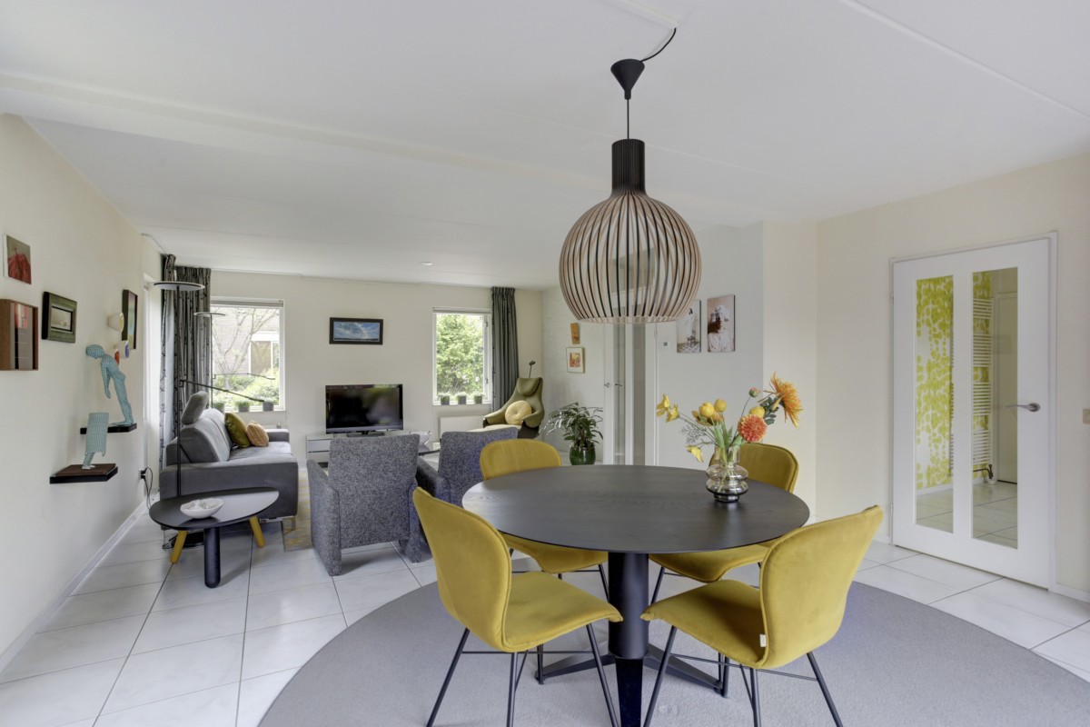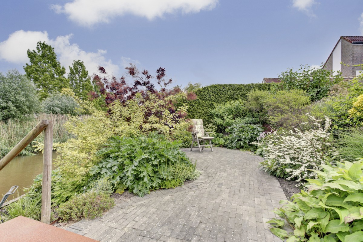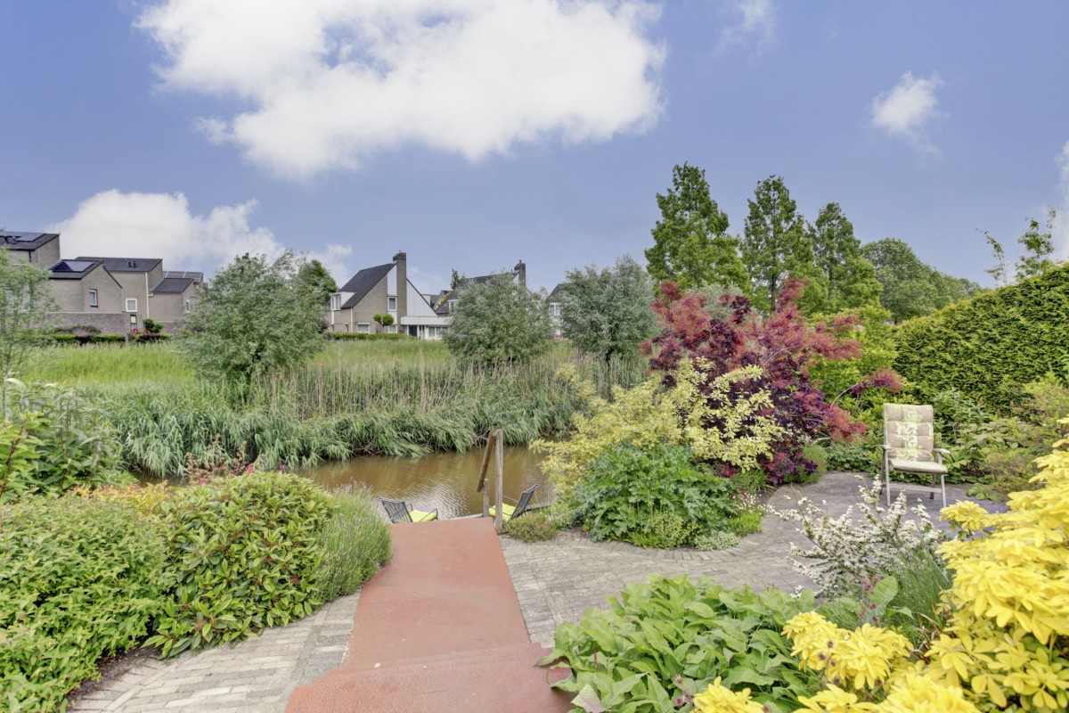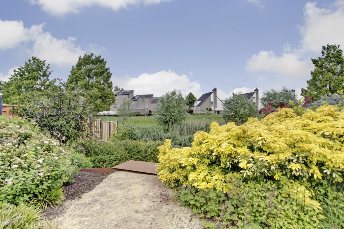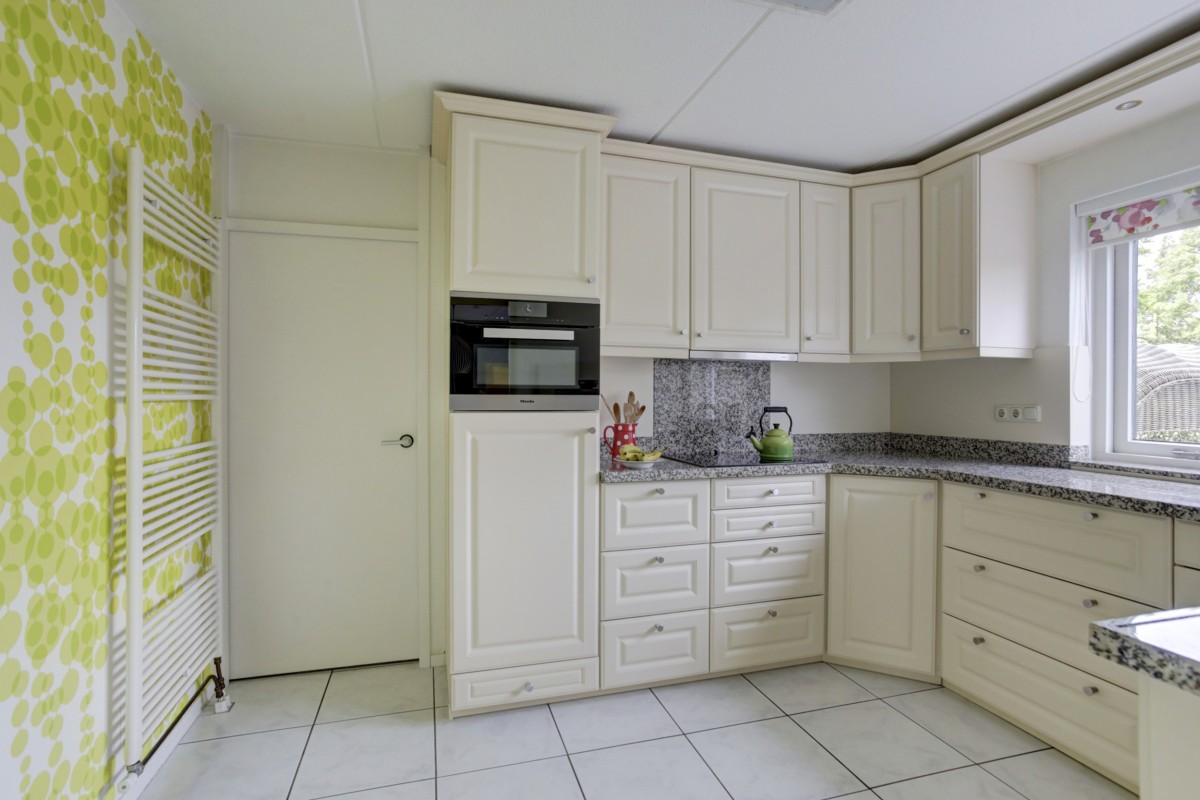 Begane grond: ruime oprit, overdekte entree, hal met meterkast en garderobe, licht betegelde toiletruimte met hangcloset en fonteintje. Loopdeur met fraai glas-kozijn naar de woonkamer met ruime eethoek voorzien van een schuifpui naar de tuin. De dichte keuken is aan de achterzijde van de woning gesitueerd en in een U-vorm opgesteld. De keuken beschikt over veel kastruimte en een groot werkblad alsmede ingebouwde koelkast, combi-oven, vaatwasser, inductiekookplaat met vlakscherm afzuiging. Vanuit de keuken is de bijkeuken bereikbaar waar de wasmachine en droger opgesteld staan en welke binnendoor toegang biedt tot de inpandige garage voorzien van een elektrisch bedienbare sectionaaldeur. Vanuit de bijkeuken biedt een loopdeur eveneens toegang tot de achtertuin welke prachtig aangelegd is in verschillende niveaus richting het rustgevende terras aan de tocht grenzend aan het perceel. De tuin biedt een achterom langs de woning een vrijstaand tuinhuis en bovenal veel rust en privacy!