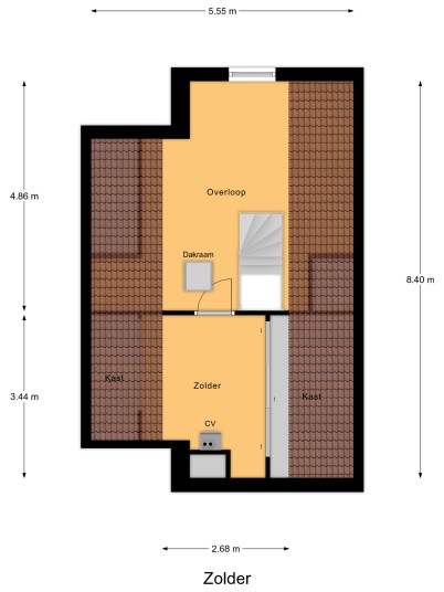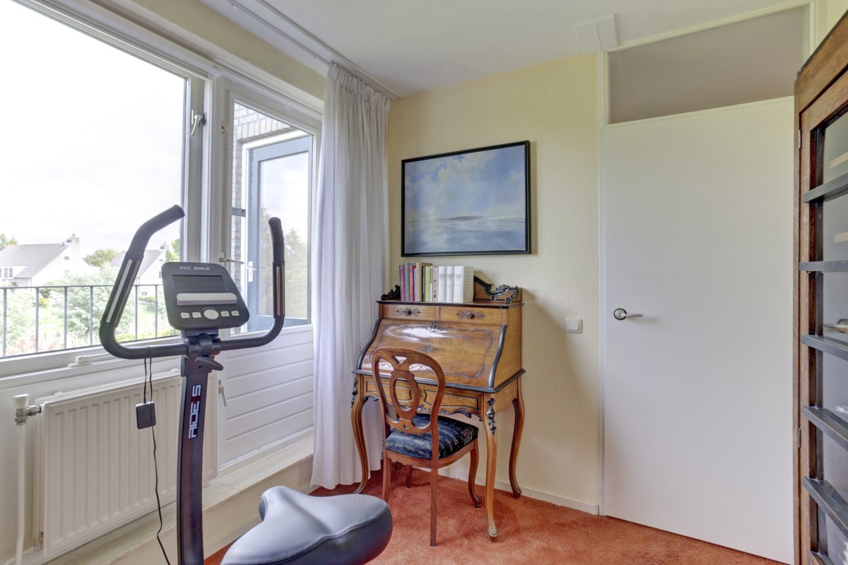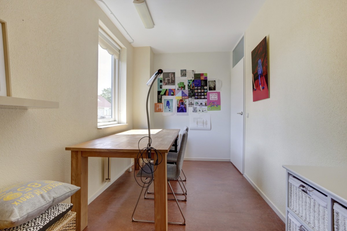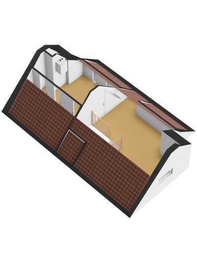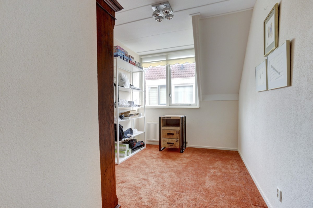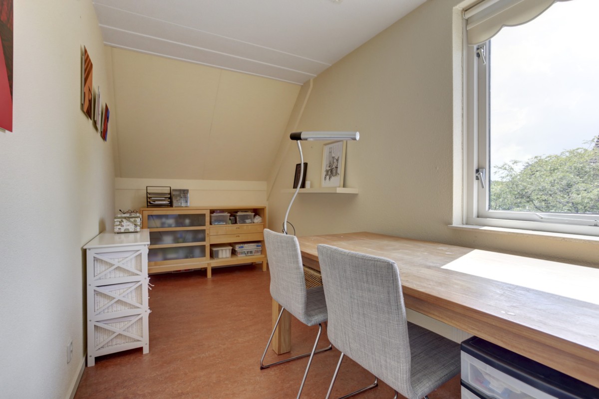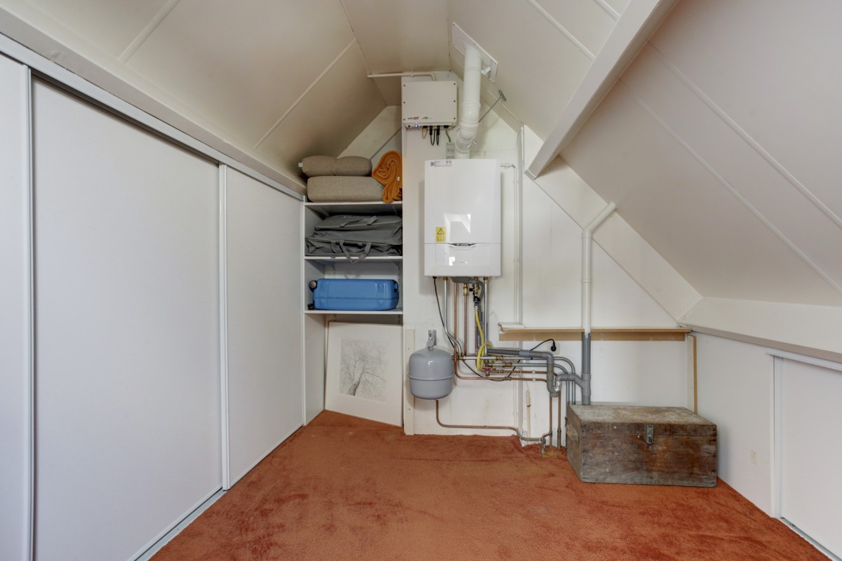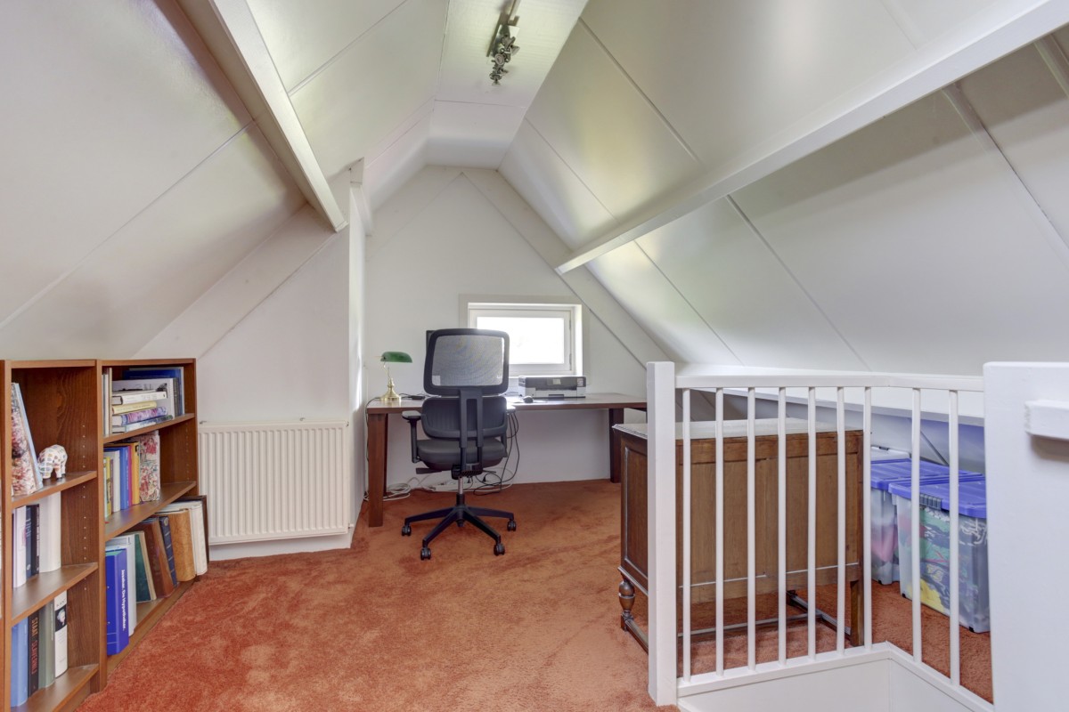 Tweede verdieping: een vaste trap leidt naar de zolderkamer welke in gebruik is als werkkamer. Aan de voorzijde is een separate berging gelegen waar zich de omvormer voor de zonnepanelen, de c.v.-ketel (Remeha HR 2019) en de mechanische ventilatie bevinden.