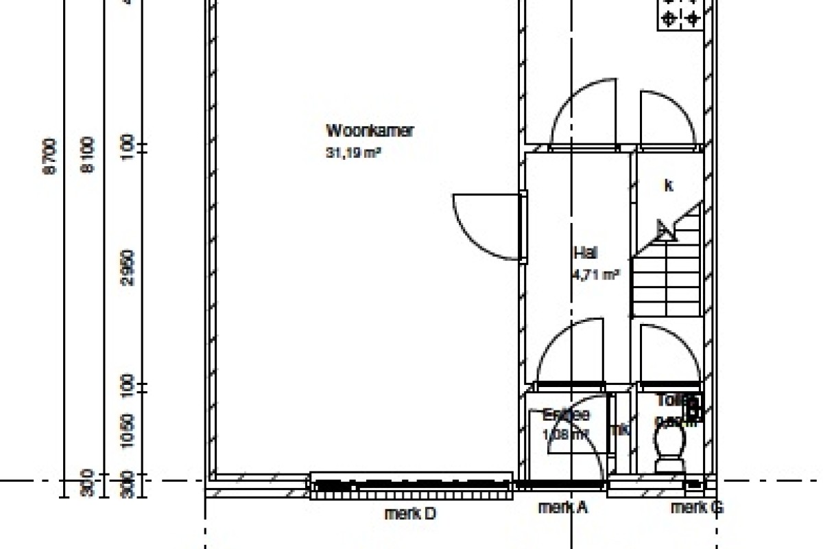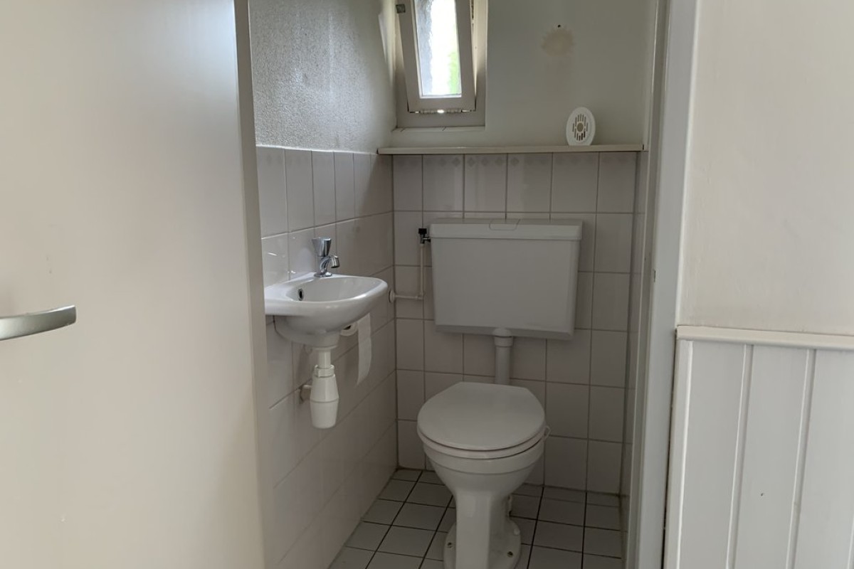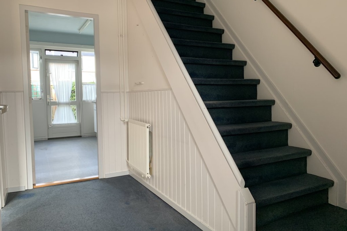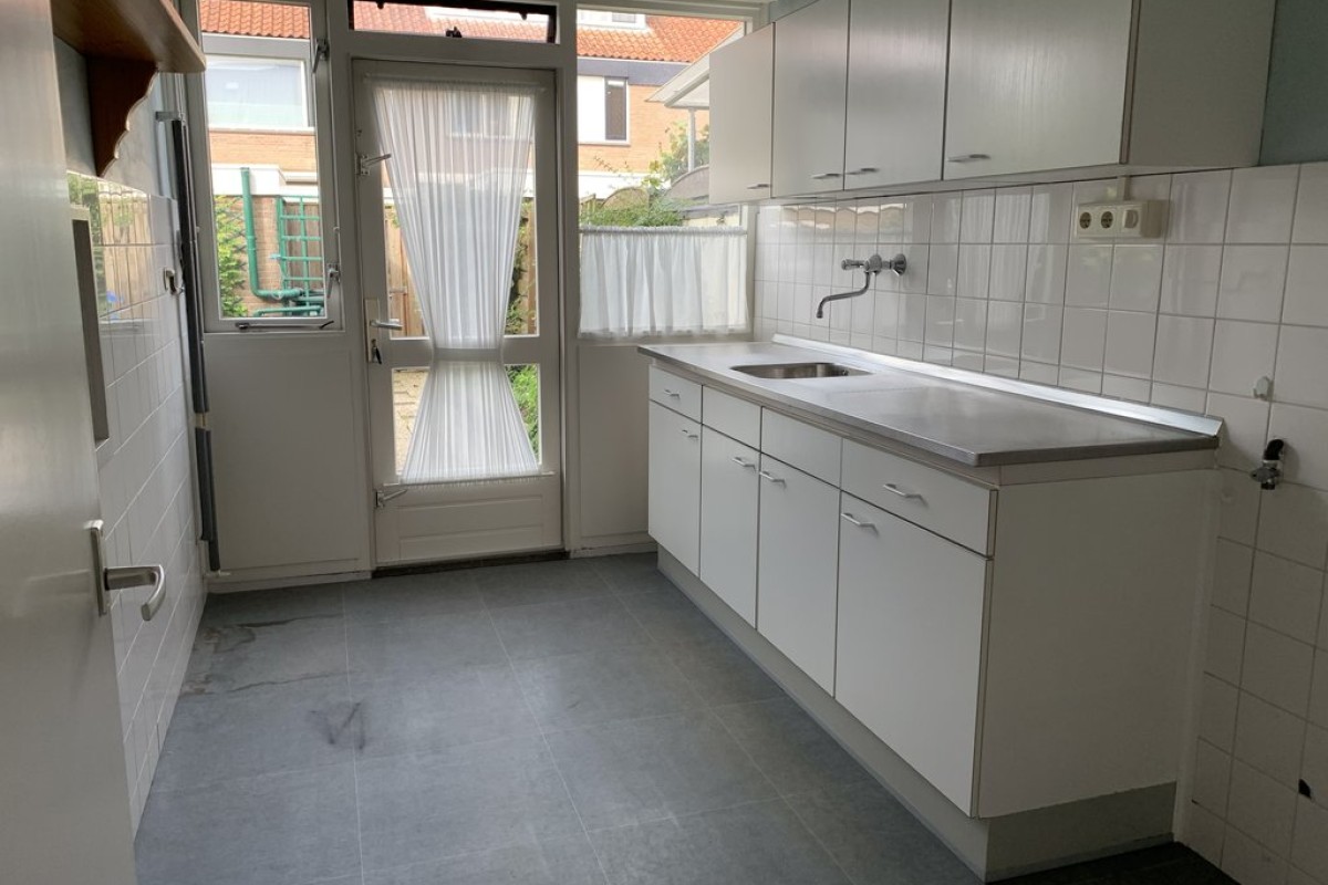 Tochtportaal, gang, toilet met fontein, meterkast, ruime doorzon woonkamer, dichte keuken voorzien van eenvoudig keukenblok en deur naar achtertuin.