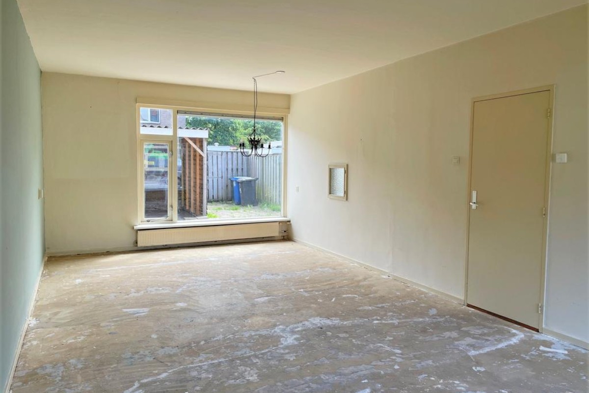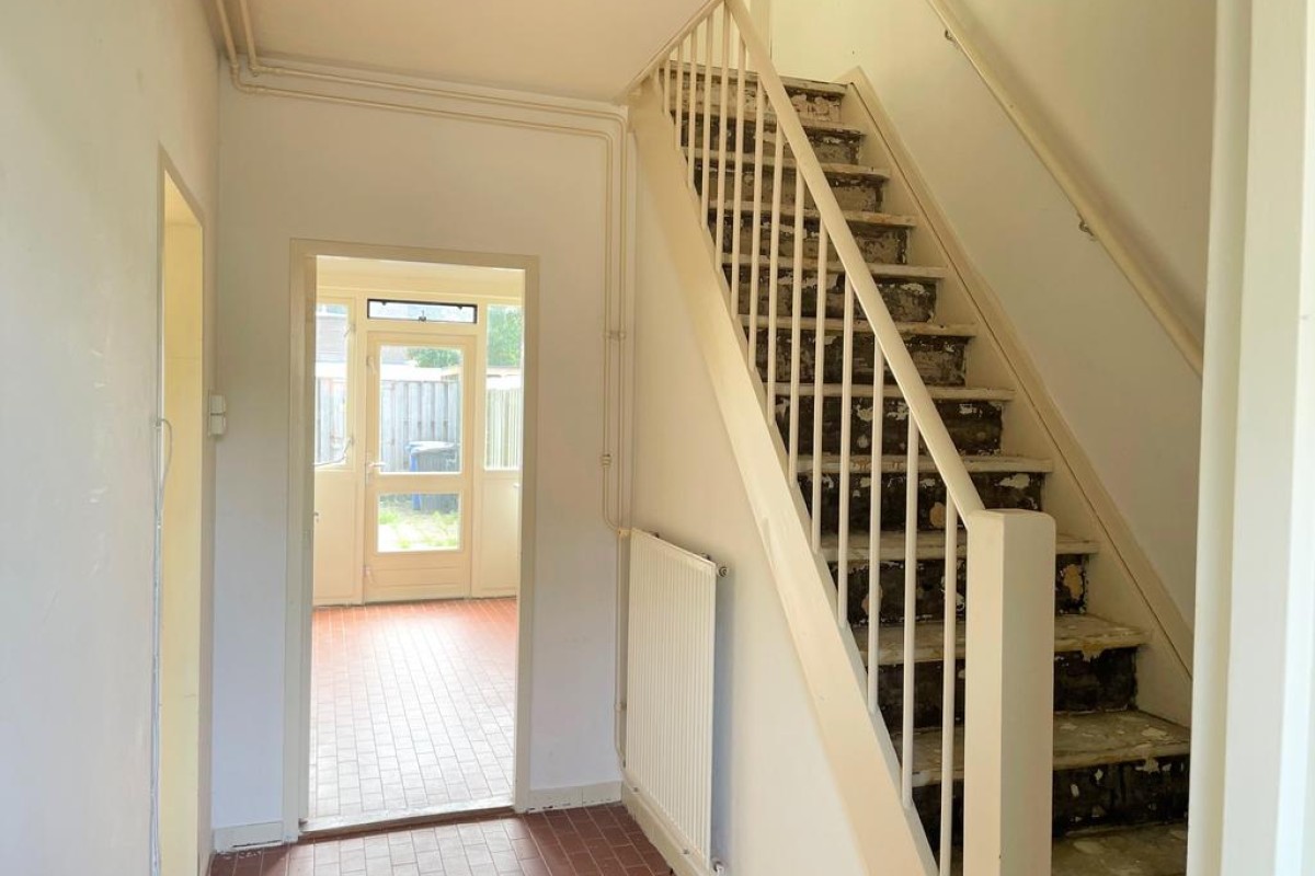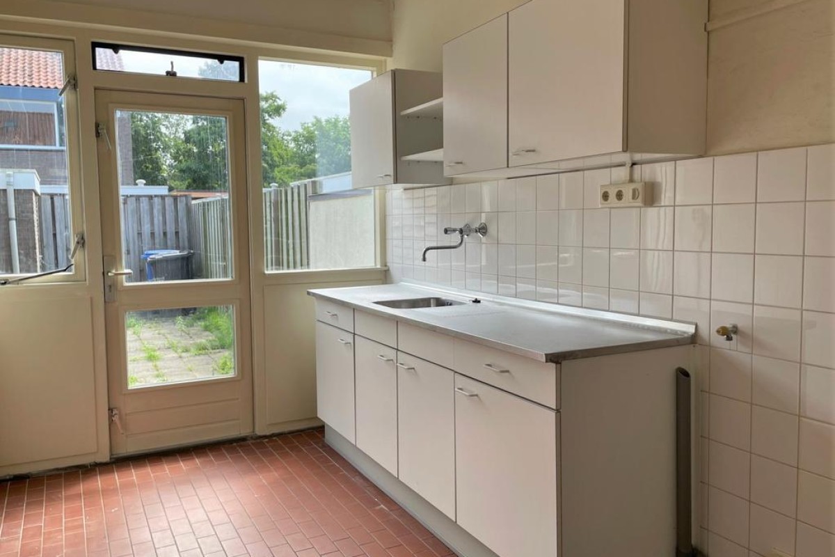 Tochtportaal, gang, toilet met fontein, meterkast, ruime doorzon woonkamer, dichte keuken voorzien van een keukenblok en deur naar achtertuin.