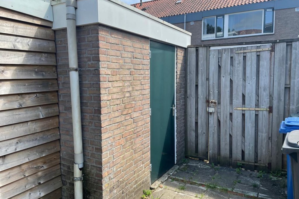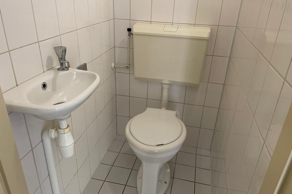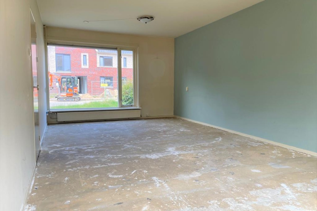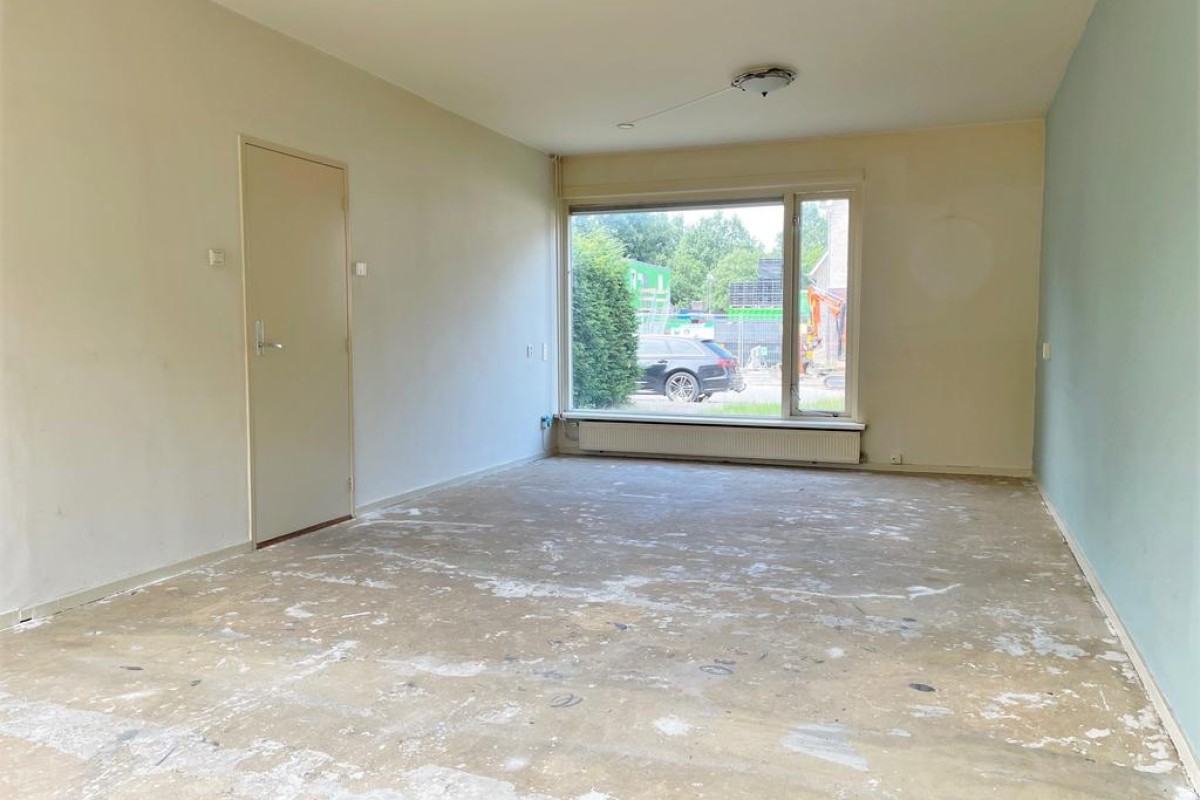Tochtportaal, gang, toilet met fontein, meterkast, ruime doorzon woonkamer, dichte keuken voorzien van een keukenblok en deur naar achtertuin.