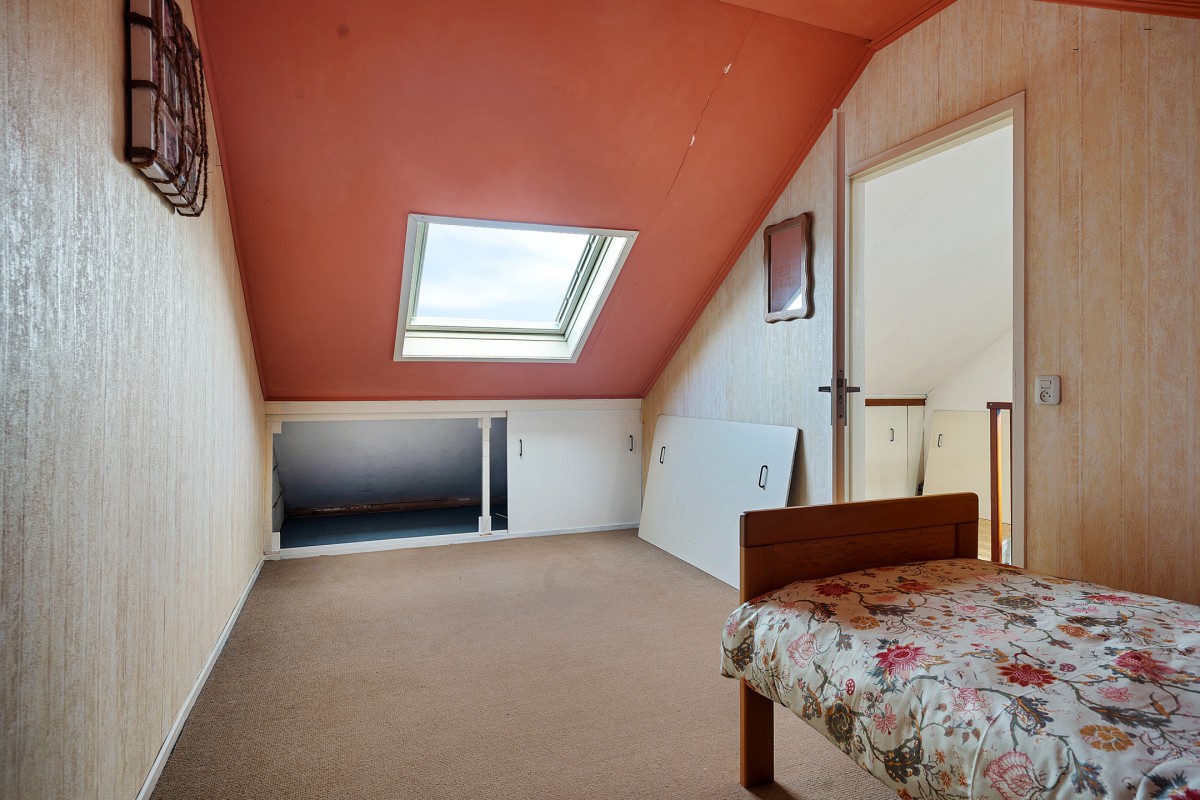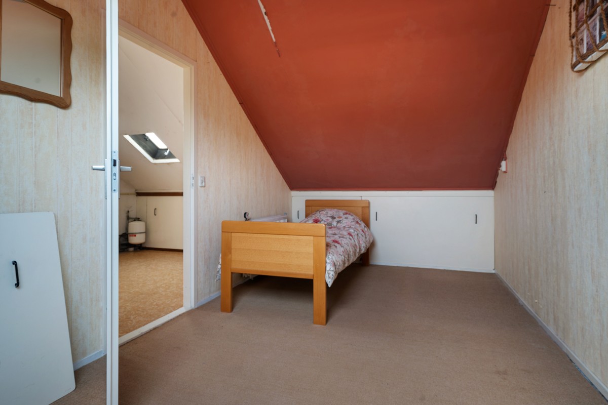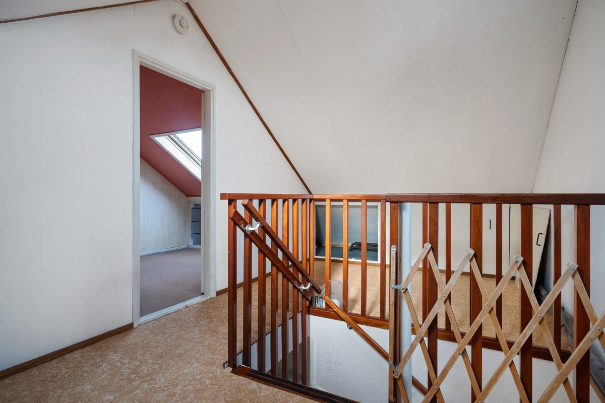 De overloop biedt toegang tot de cv-ketel (2022) en de wasmachineaansluiting. Hier is ook de toegang tot de vierde slaapkamer, die is voorzien van een dakraam voor natuurlijk licht. De gehele verdieping is afgewerkt met knieschotten die zorgen voor veel praktische opbergruimte.