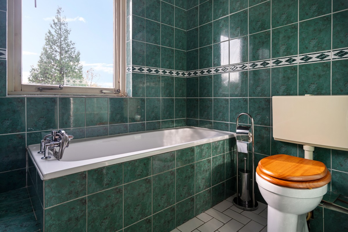 De badkamer is voorzien van een dubbele wastafel, toilet, ligbad en een douchecabine. De badkamer kan op sommige punten een revitalisatie gebruiken om geheel naar wens en smaak van de nieuwe eigenaar te worden gebracht.