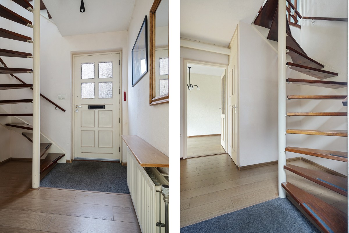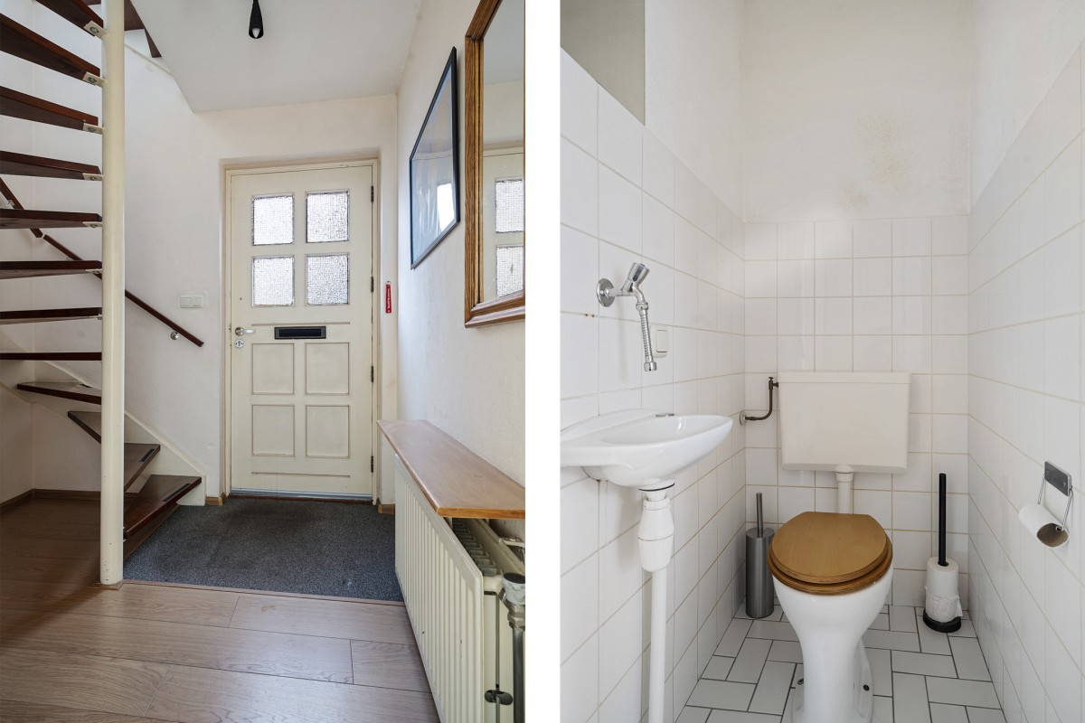 Entree, hal met toegang tot de meterkast, trapopgang naar de verdieping en het toilet met fonteintje.