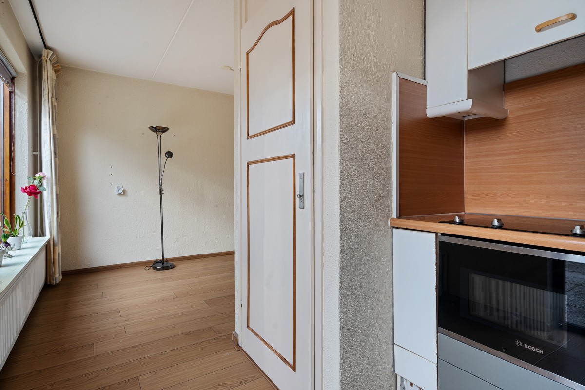 De keuken bevindt zich aan de achterzijde van de woning en heeft diverse inbouwapparatuur zoals, inductieplaat, magnetron en koelkast met vriesvak. De keukenopbouw is gedateerd en vraagt om een moderne upgrade naar uw eigen smaak.