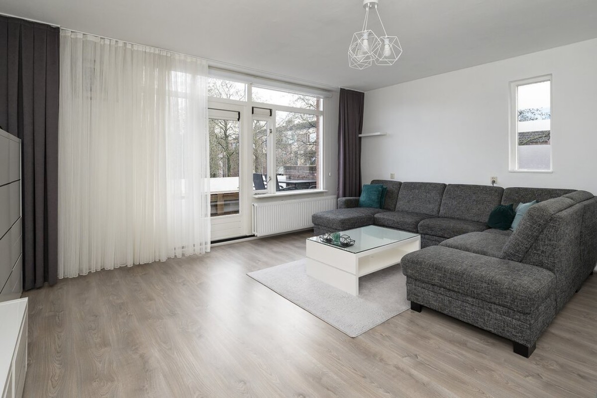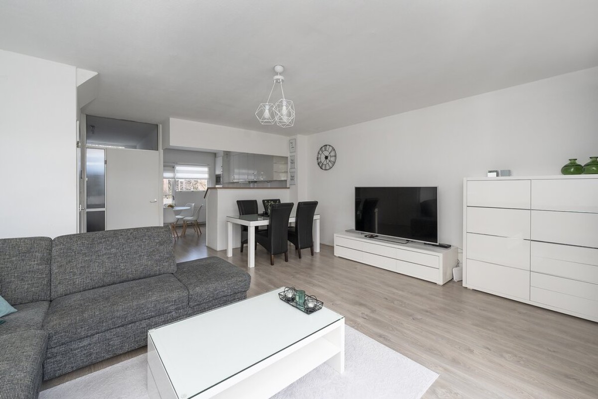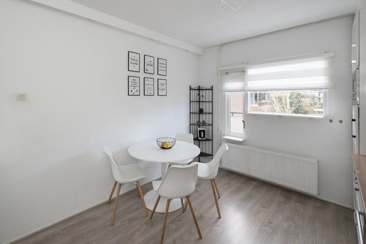 Doordat het appartement op de hoek van het complex is gelegen is er een extra zijraam in de woonkamer, met de overige grote raampartijen zorgt dit ervoor dat de woonkamer lekker veel lichtinval heeft. Op het aangrenzende dakterras van circa 12 m2 is het zomers heerlijk toeven en heb je een mooi ruim uitzicht over de buurt.