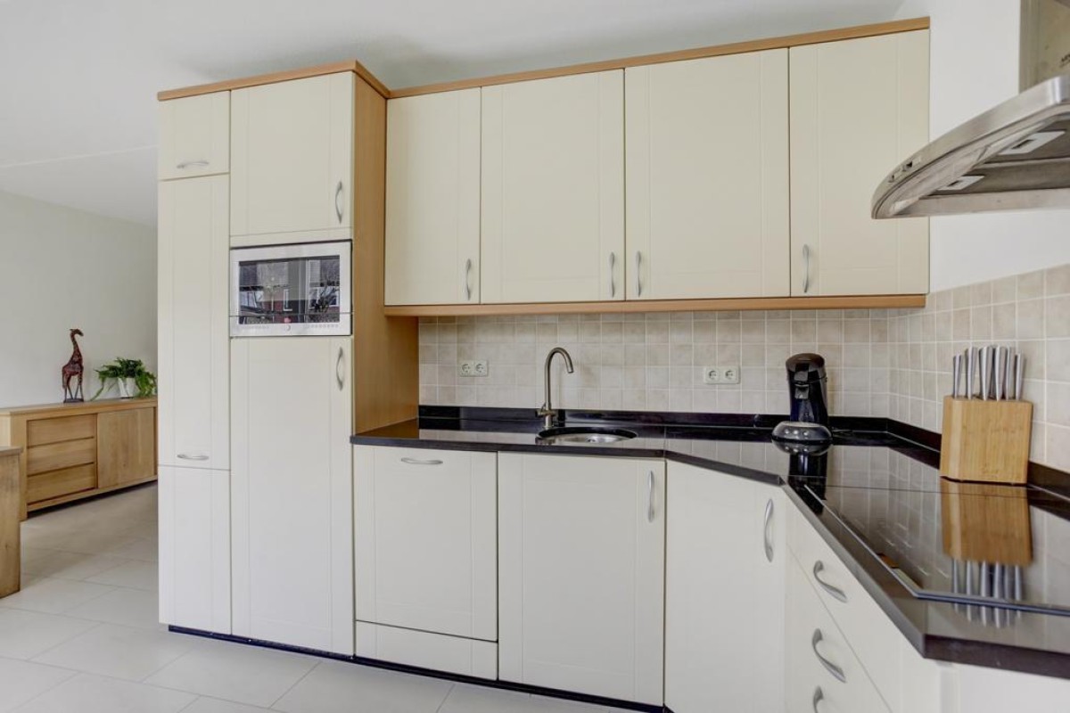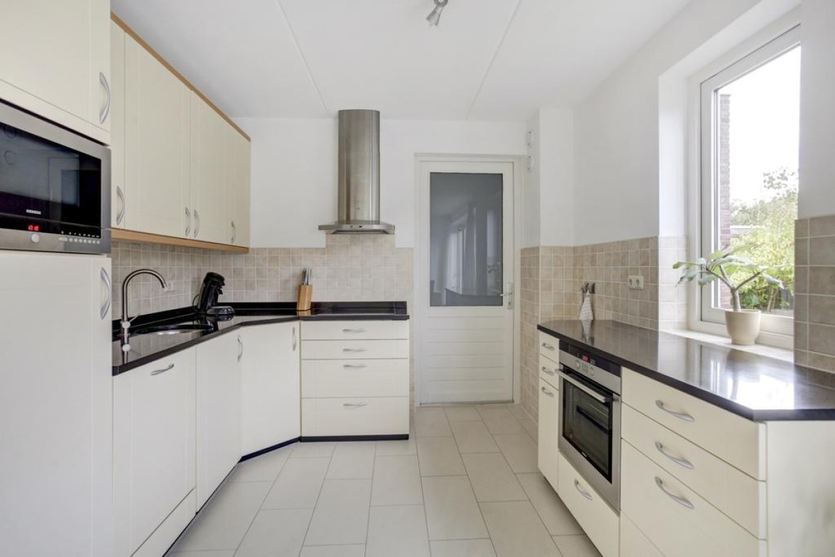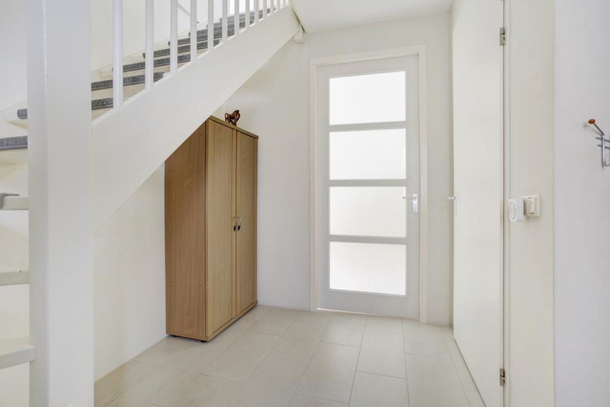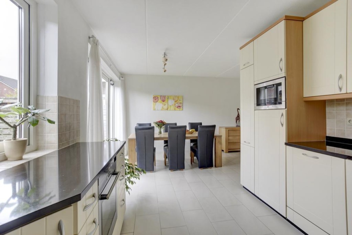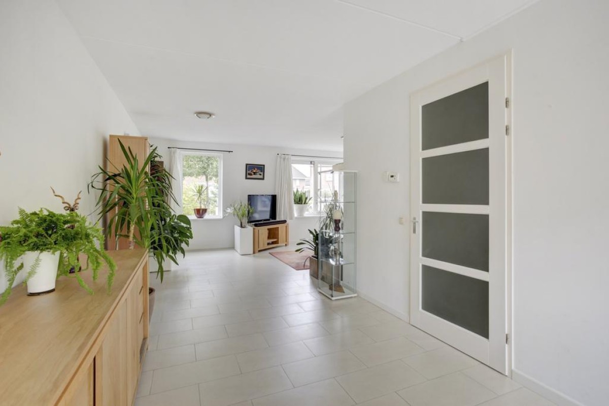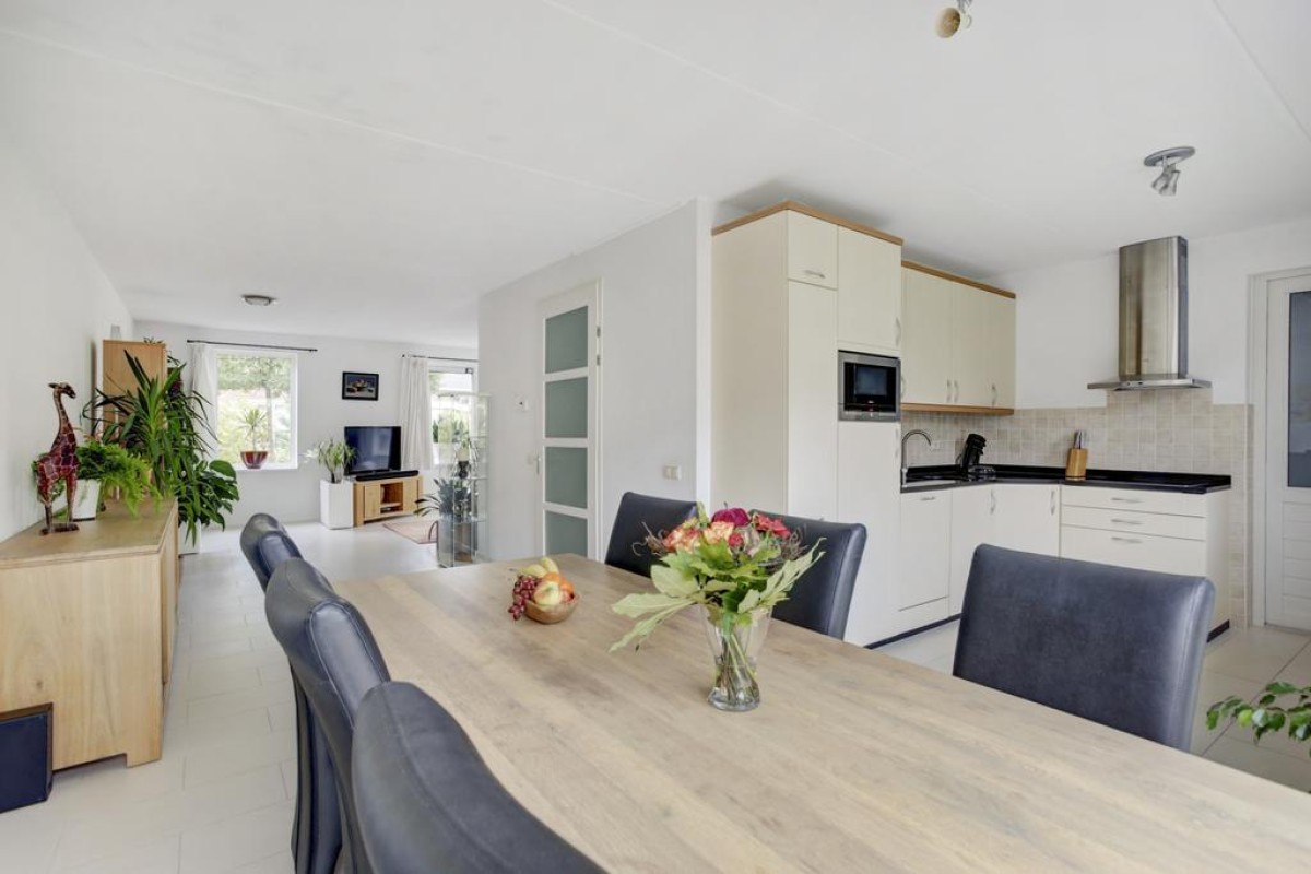 Begane grond: overdekte entree, lichte hal met meterkast voorzien van 3-fase aansluiting, garderobe, toiletruimte met hangcloset en fonteintje in lichte betegeling, doorgang naar de ruime lichte woonkamer. De woonkamer is voorzien van een plavuizen vloer met vloerverwarming en bevindt zich aan de voorzijde van de woning, mede dankzij de diverse raampartijen is de woonkamer heerlijk licht. De open keuken is afgewerkt met witte fronten en uitgevoerd in een hoek opstelling met een separaat wandelement. De keuken is voorzien van diverse ingebouwde apparatuur waaronder een ingebouwde koelkast, vaatwasser (2023), oven, magnetron, 4-pits inductie kookplaat met rvs afzuigschouw en biedt mede door de apothekerskast en de carrousel hoekkast veel praktische opbergruimte.