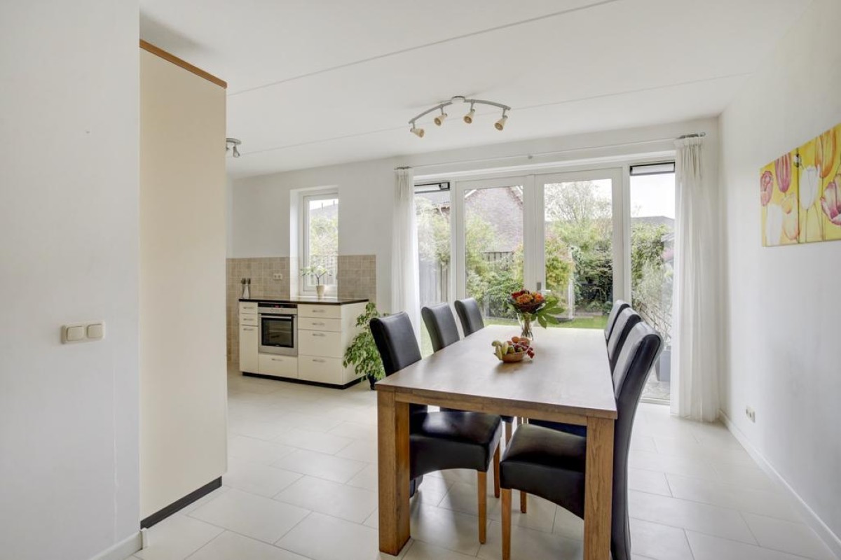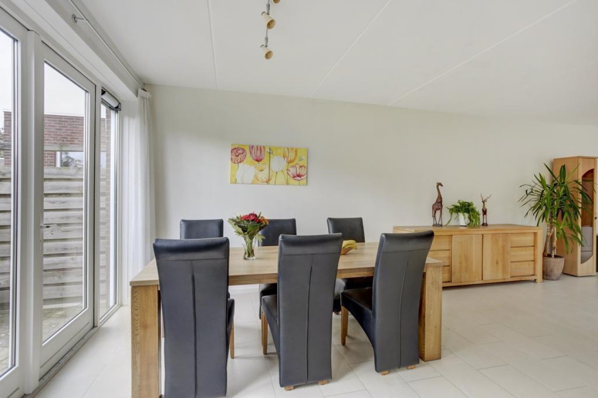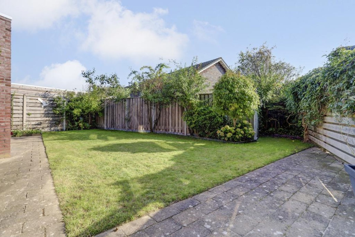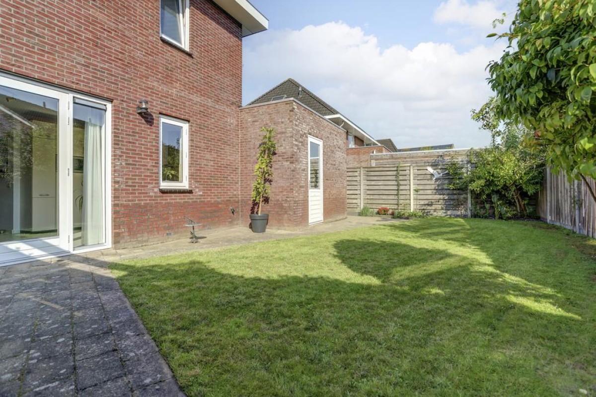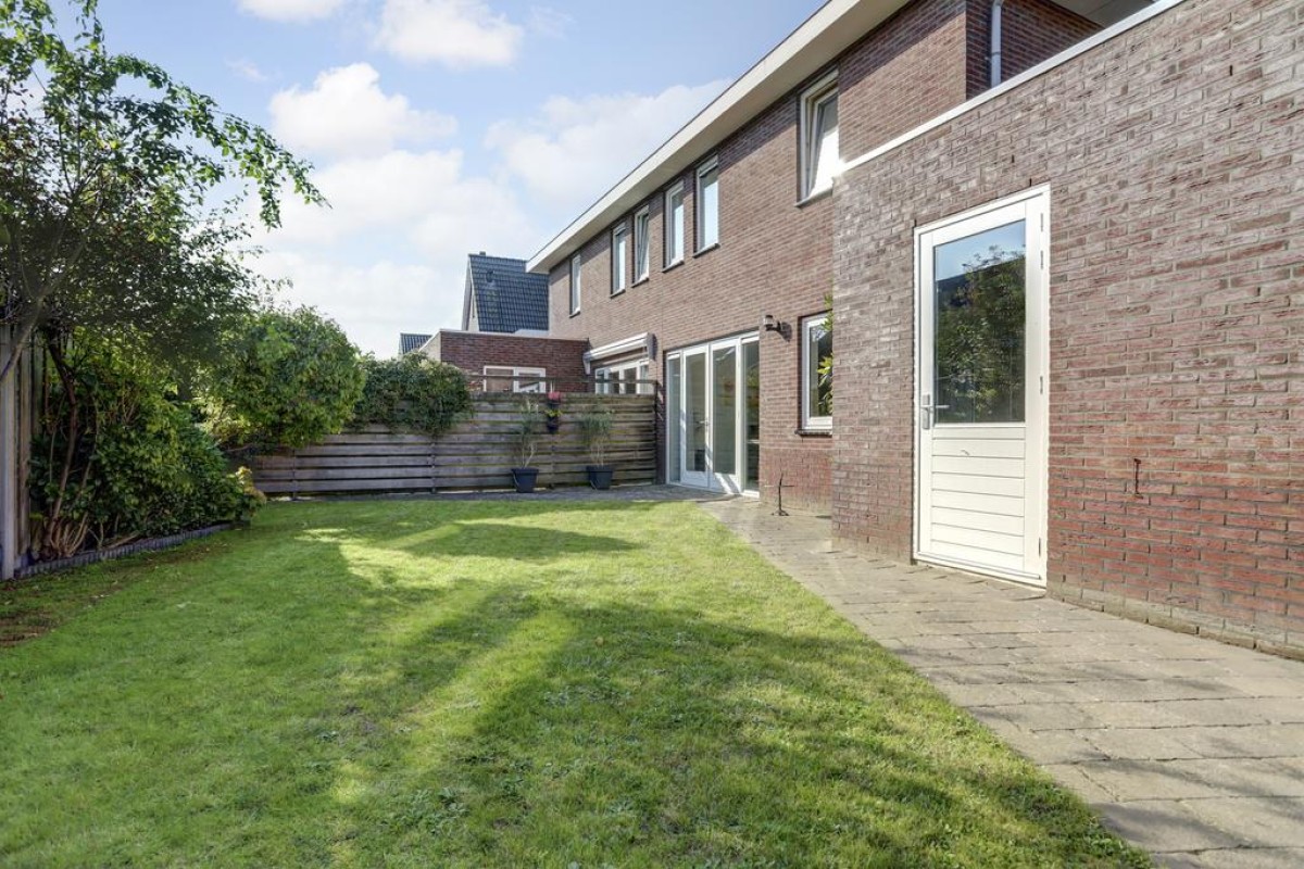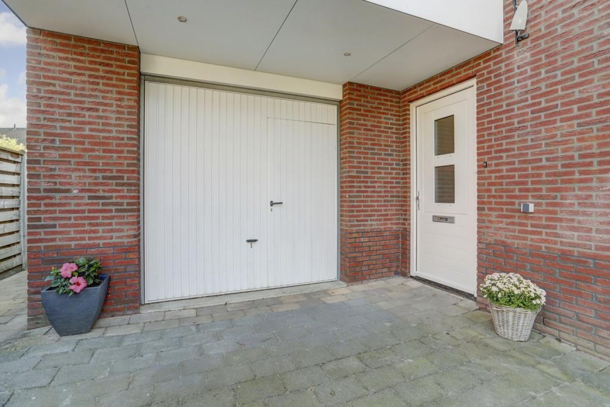 De eethoek beschikt over openslaande tuindeuren naar het aangrenzende zonneterras op het zuiden. Vanuit de tuin is er toegang tot de royale aangebouwde stenen garage met betonvloer. De garage is ruim van opzet en verder voorzien van een gevelraam welke voor veel prettige lichtinval zorgt en een stalen kanteldeur met loopdeur naar de oprit. De tuin is gesitueerd op het zuiden en beschikt over een ruim zonneterras, een gazon, vaste beplanting, een poort en een achterom langs de woning naar de ruime oprit.