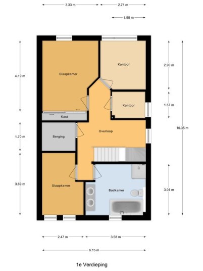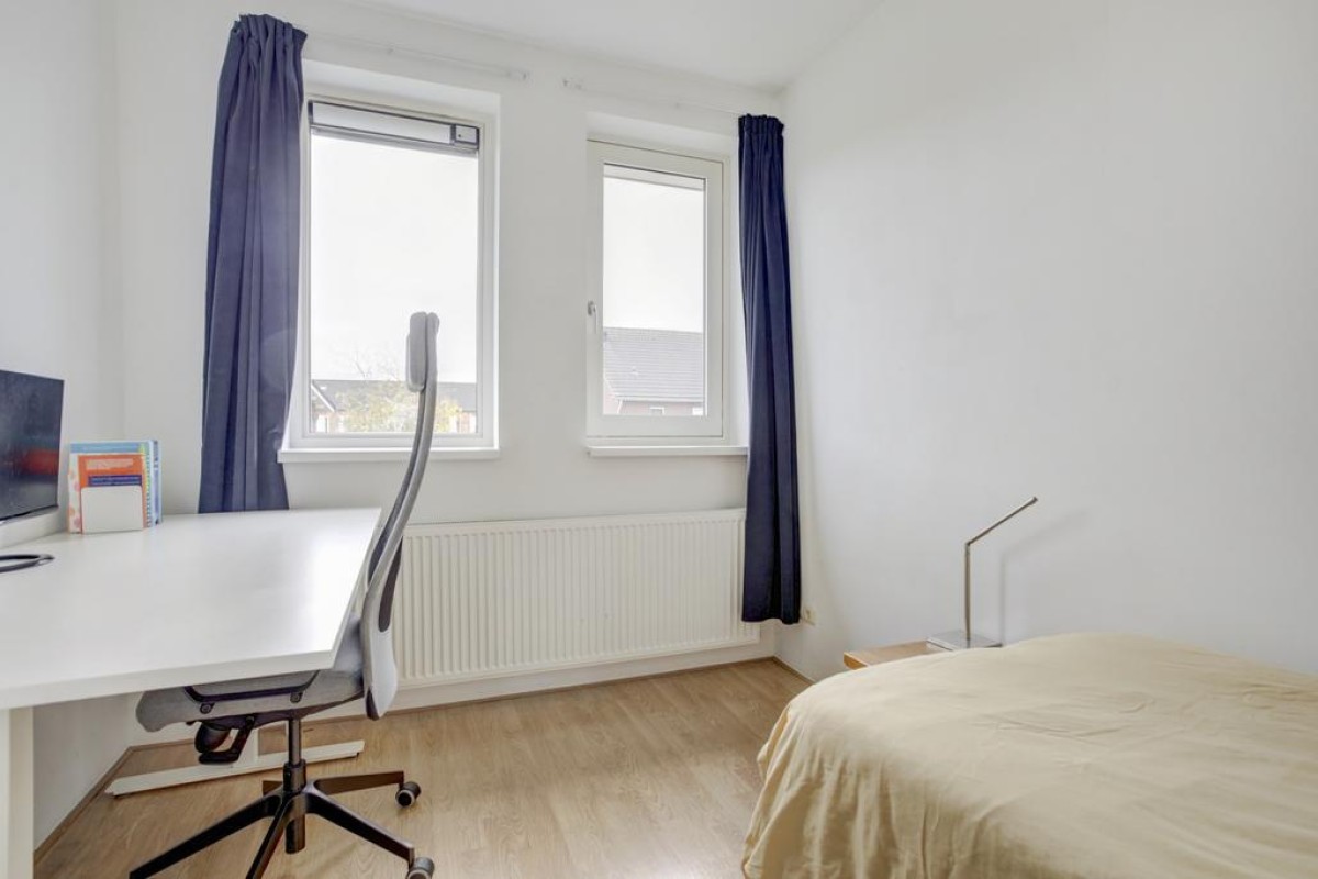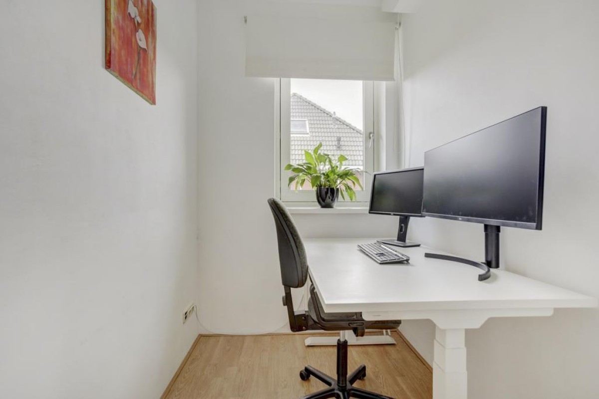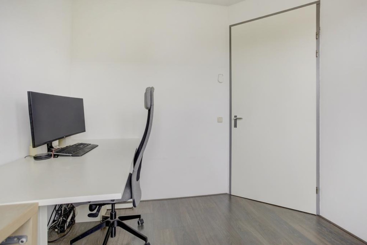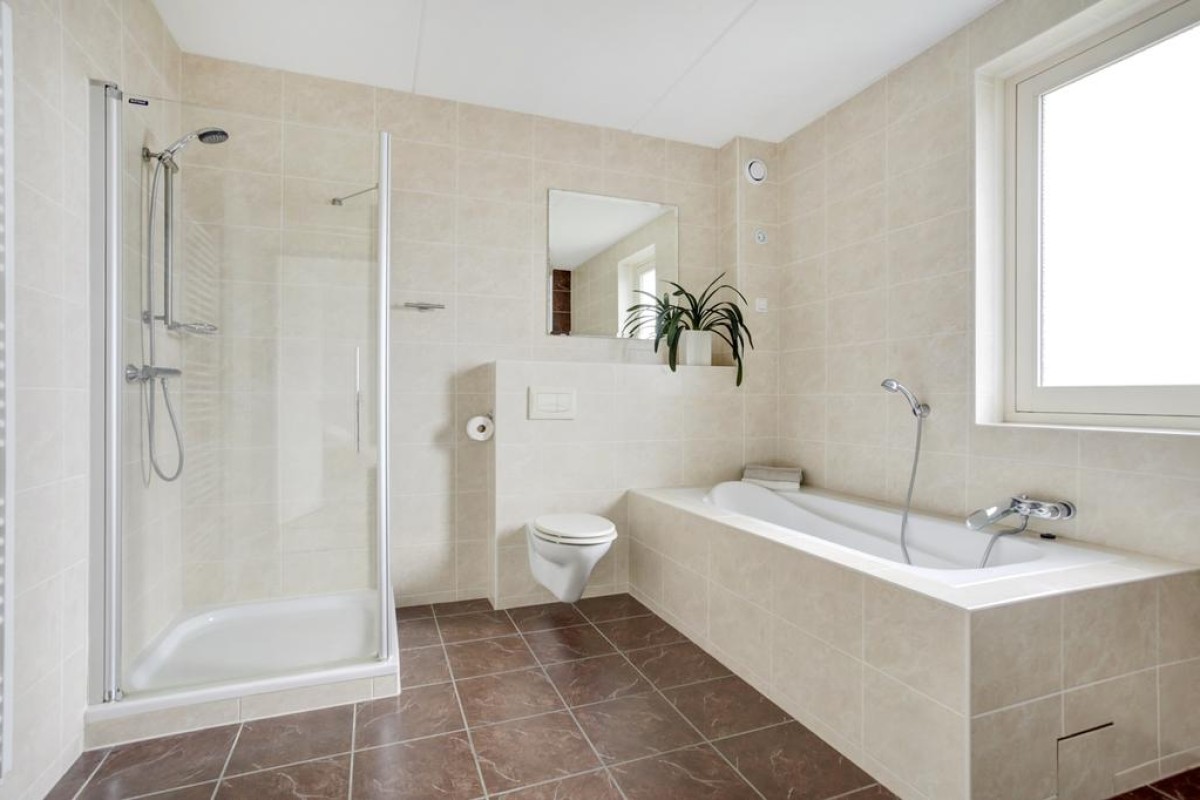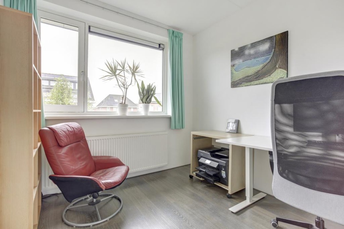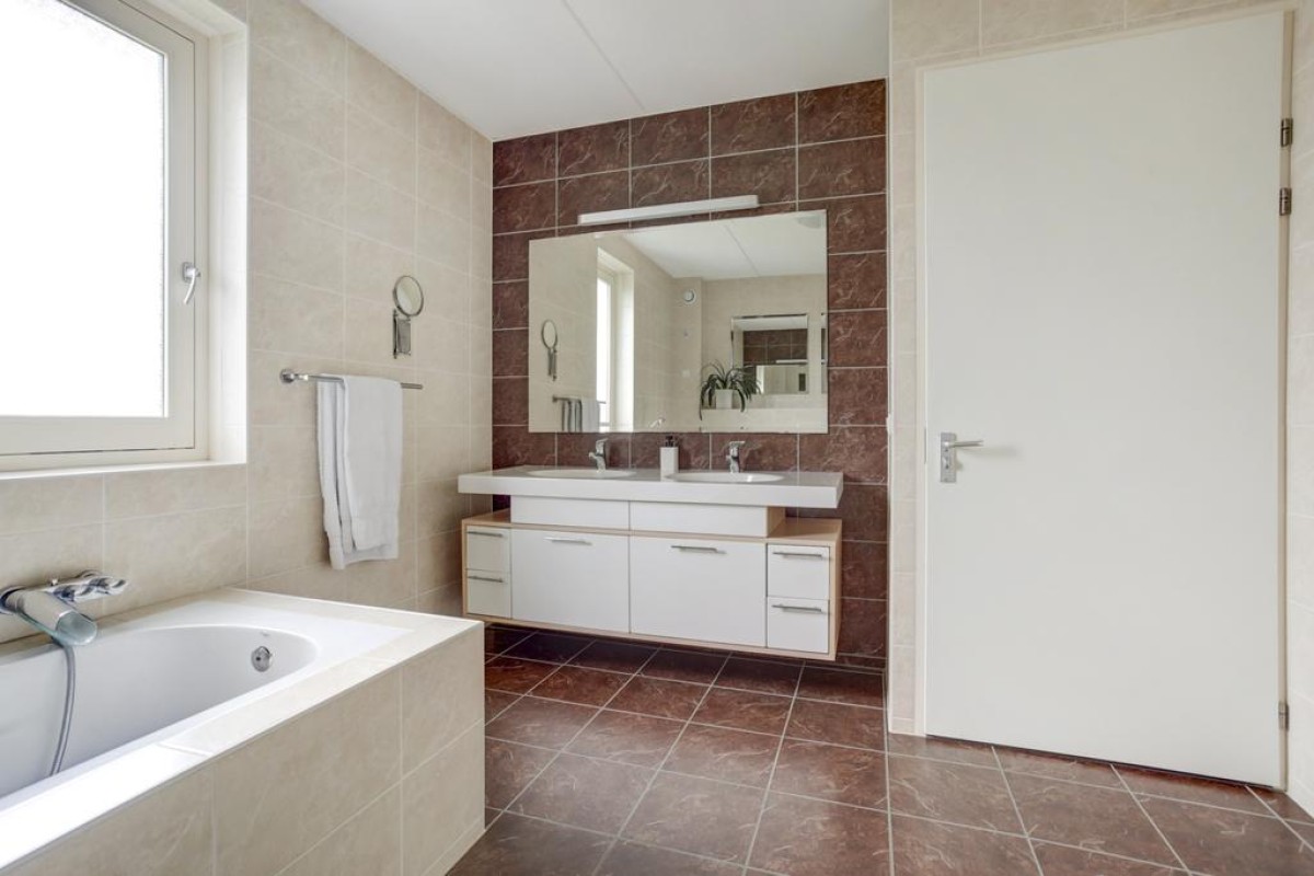 Eerste verdieping: lichte overloop en aansluitend 3 ruime slaapkamers, een inloopkast, een werkkamer en de badkamer. De overloop heeft een gevelraam wat voor veel lichtinval zorgt en is voorzien van een laminaatvloer. De slaapkamers zijn deels voorzien van een laminaatvloer en deels van een tapijtvloer, de hoofdslaapkamer is voorzien van een vaste kastenwand. De moderne badkamer is volledig betegeld en voorzien van een ligbad, een douche, design radiator, 2e hangcloset en een dubbele wastafel met meubel.