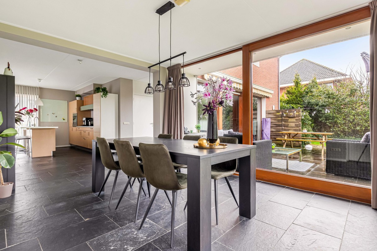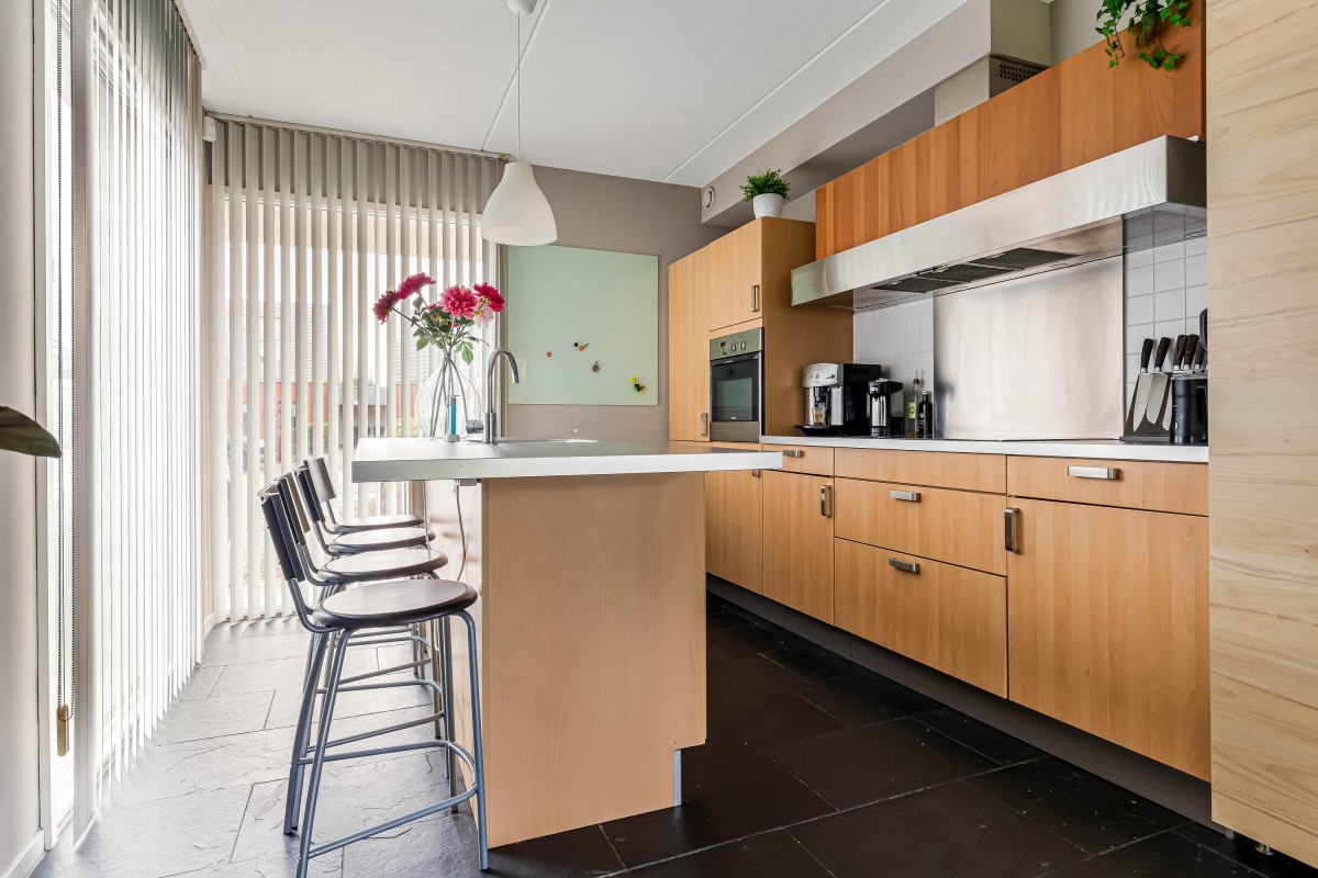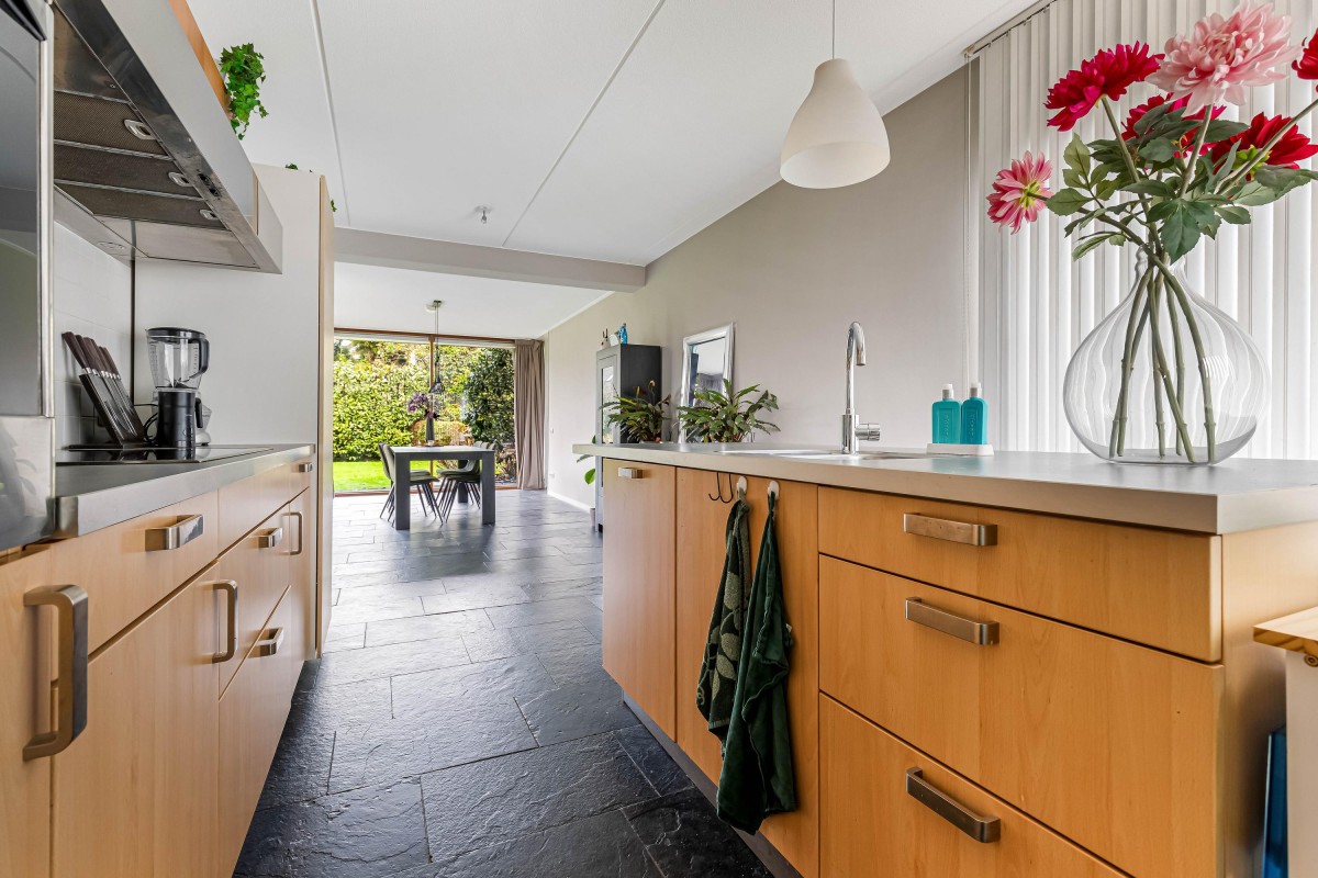 De aan de woonkamer grenzende woonkeuken met spoeleiland is volledig uitgerust met inbouwapparatuur, waaronder een inductiekookplaat, vaatwasser, koelkast, vriezer en oven. In de woonkeuken is voldoende ruimte voor een grote eettafel. De ramen rondom zorgen ervoor dat binnen en buiten naadloos in elkaar overgaan.